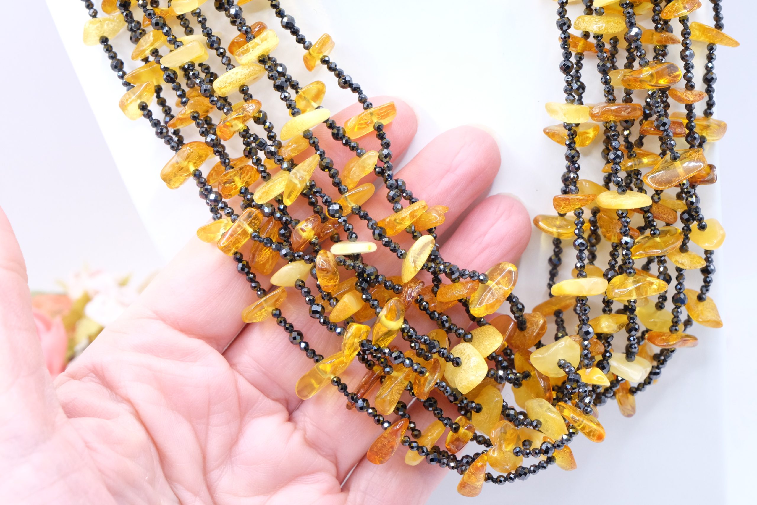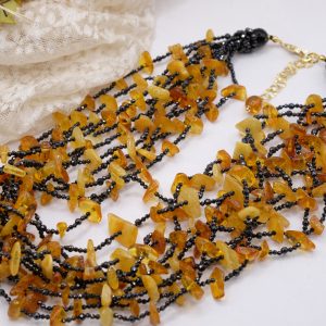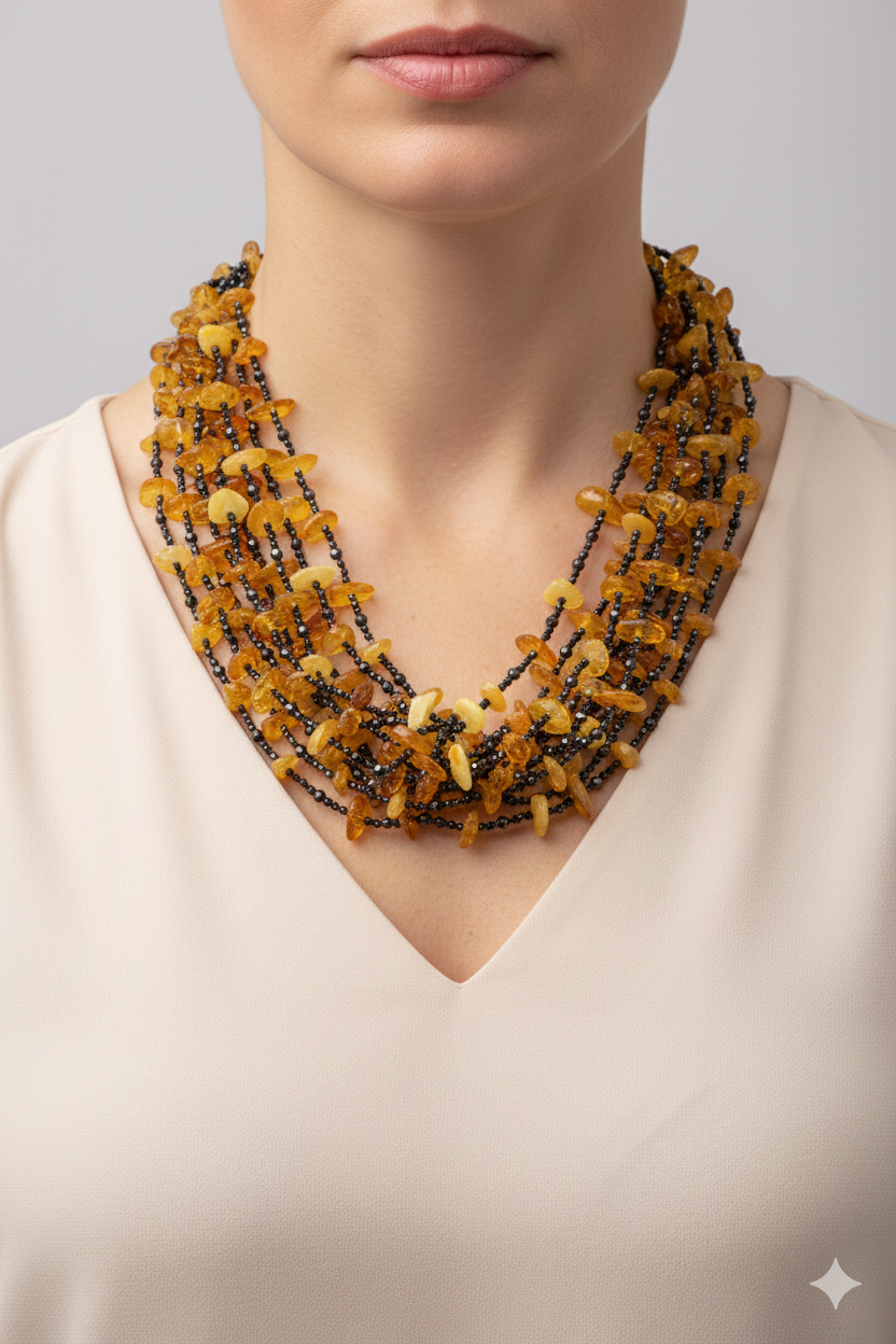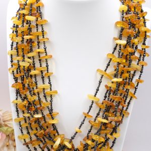 Add a touch of elegance and charm to your look with this elegant 10-strand multi-strand necklace featuring high-quality natural zirconia alternating with superlative Baltic amber.