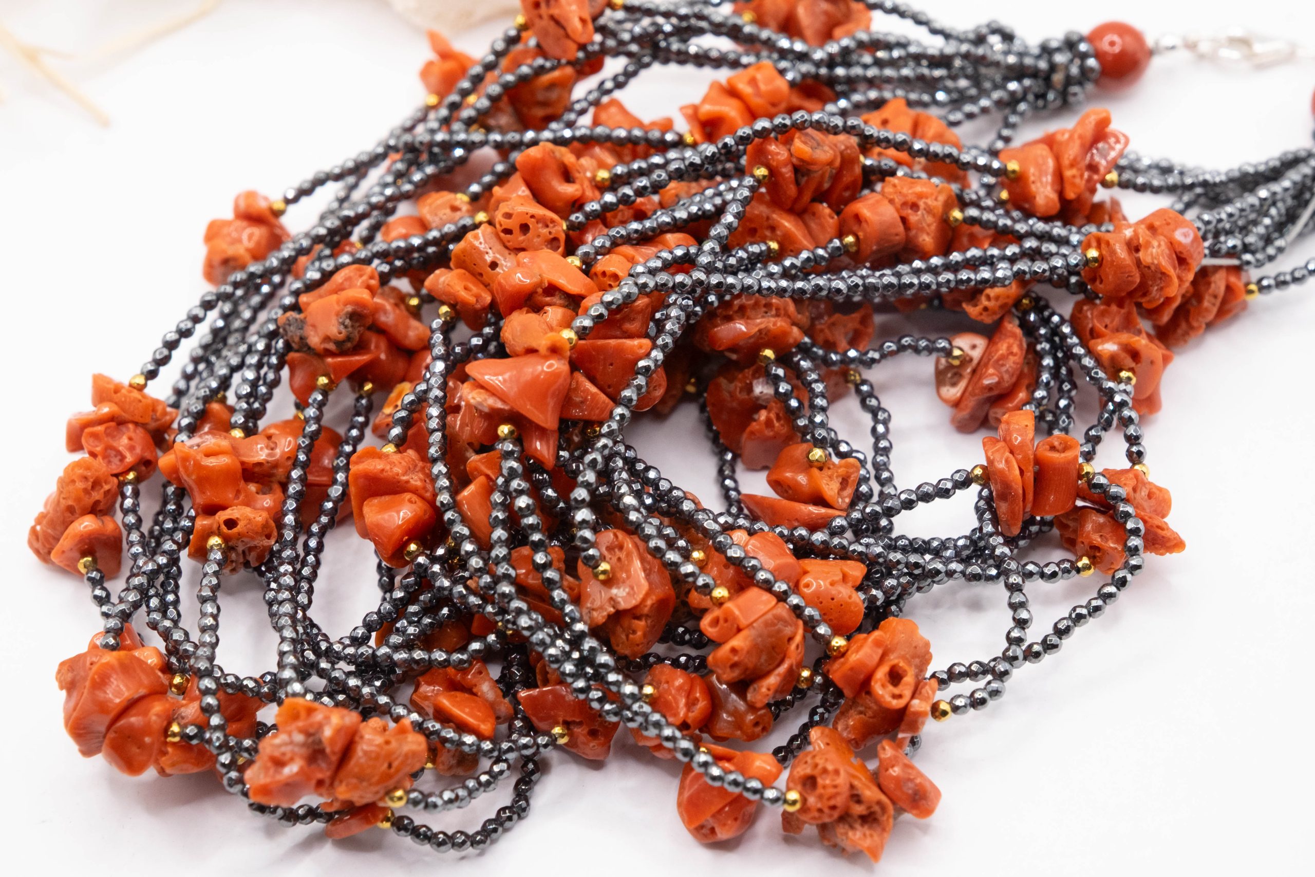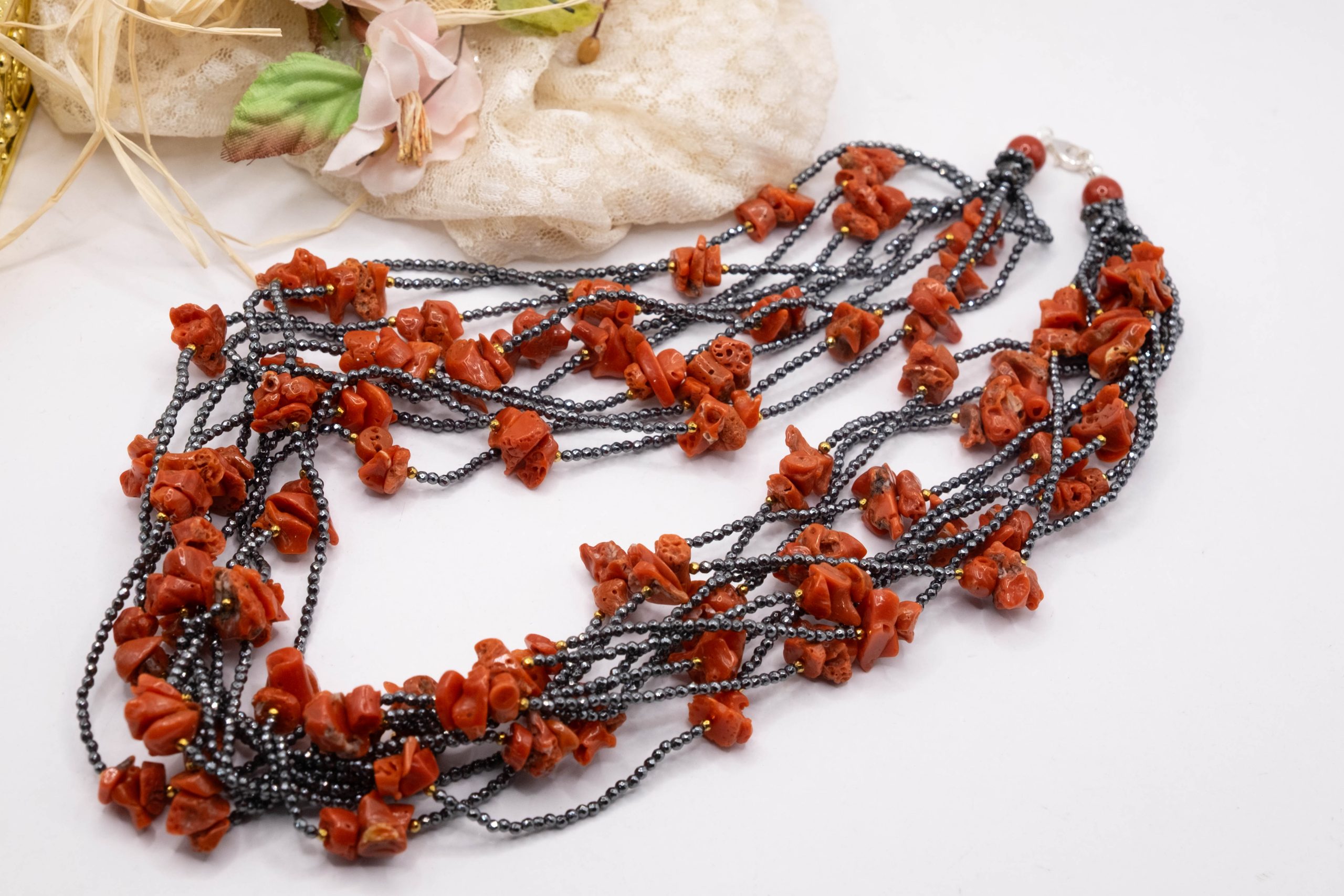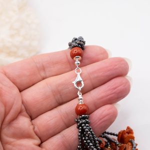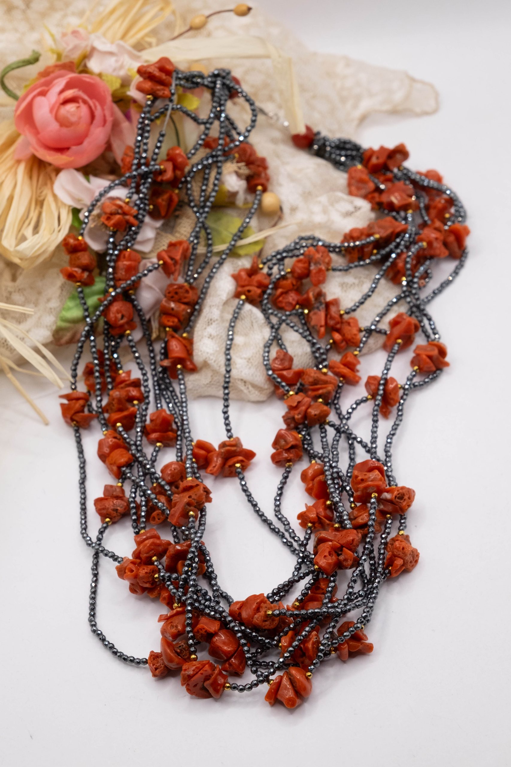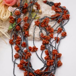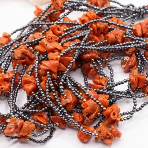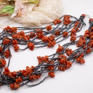 10-strand necklace with natural black zirconia and Mediterranean red coral.
