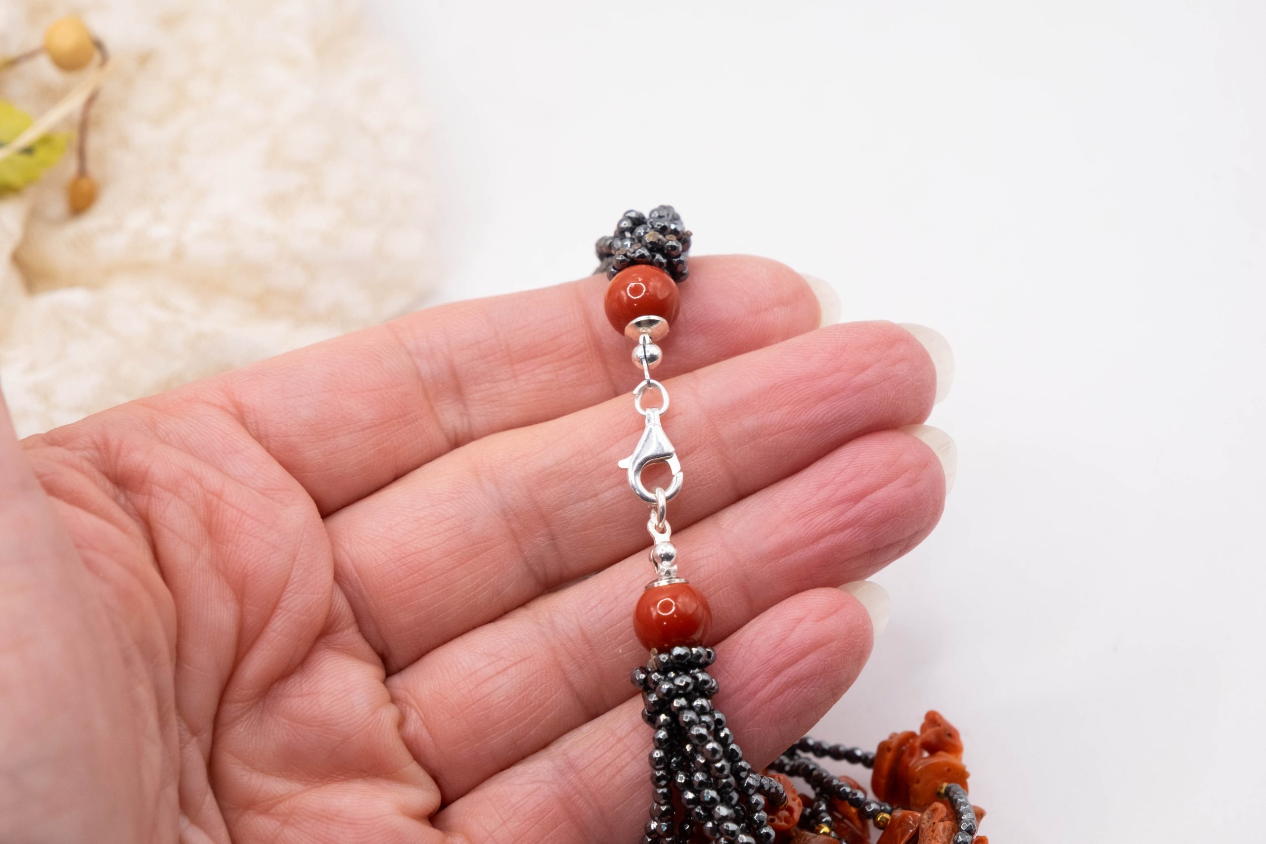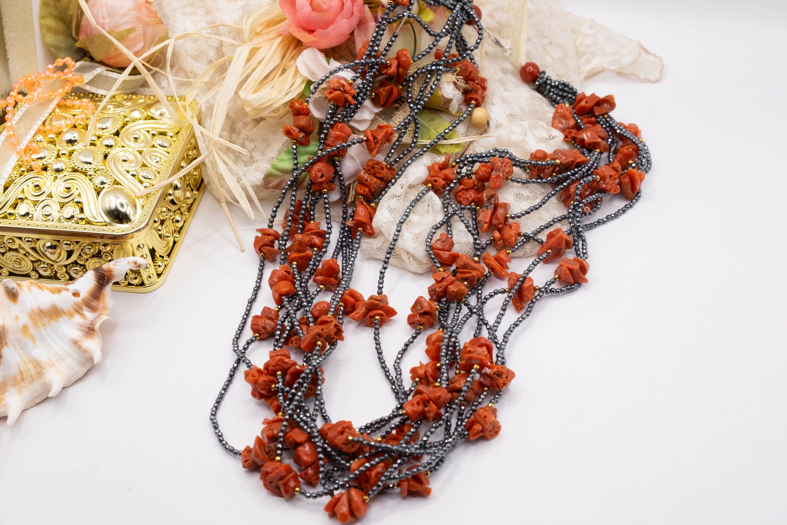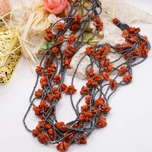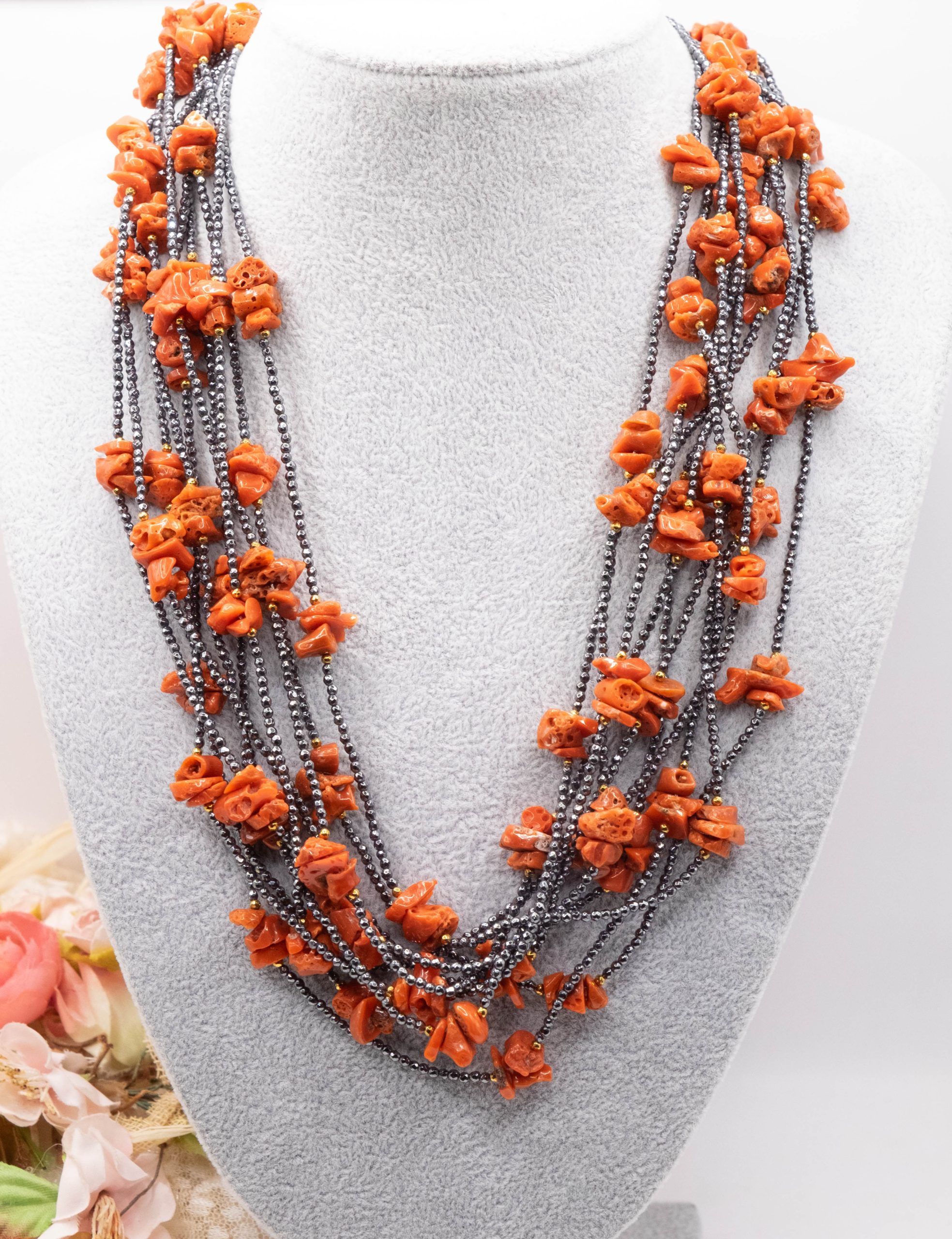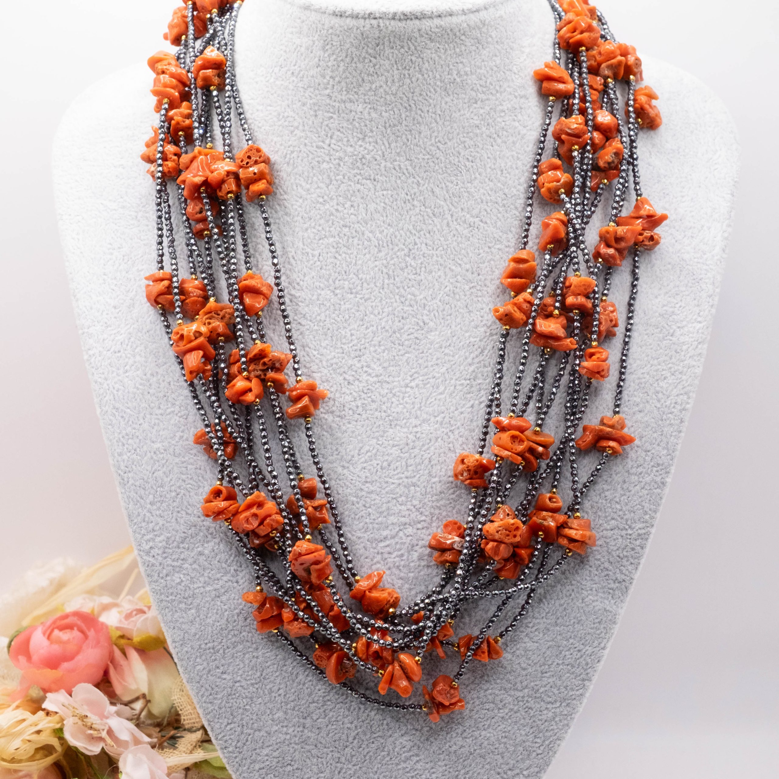 10-strand necklace with natural black zirconia and Mediterranean red coral.