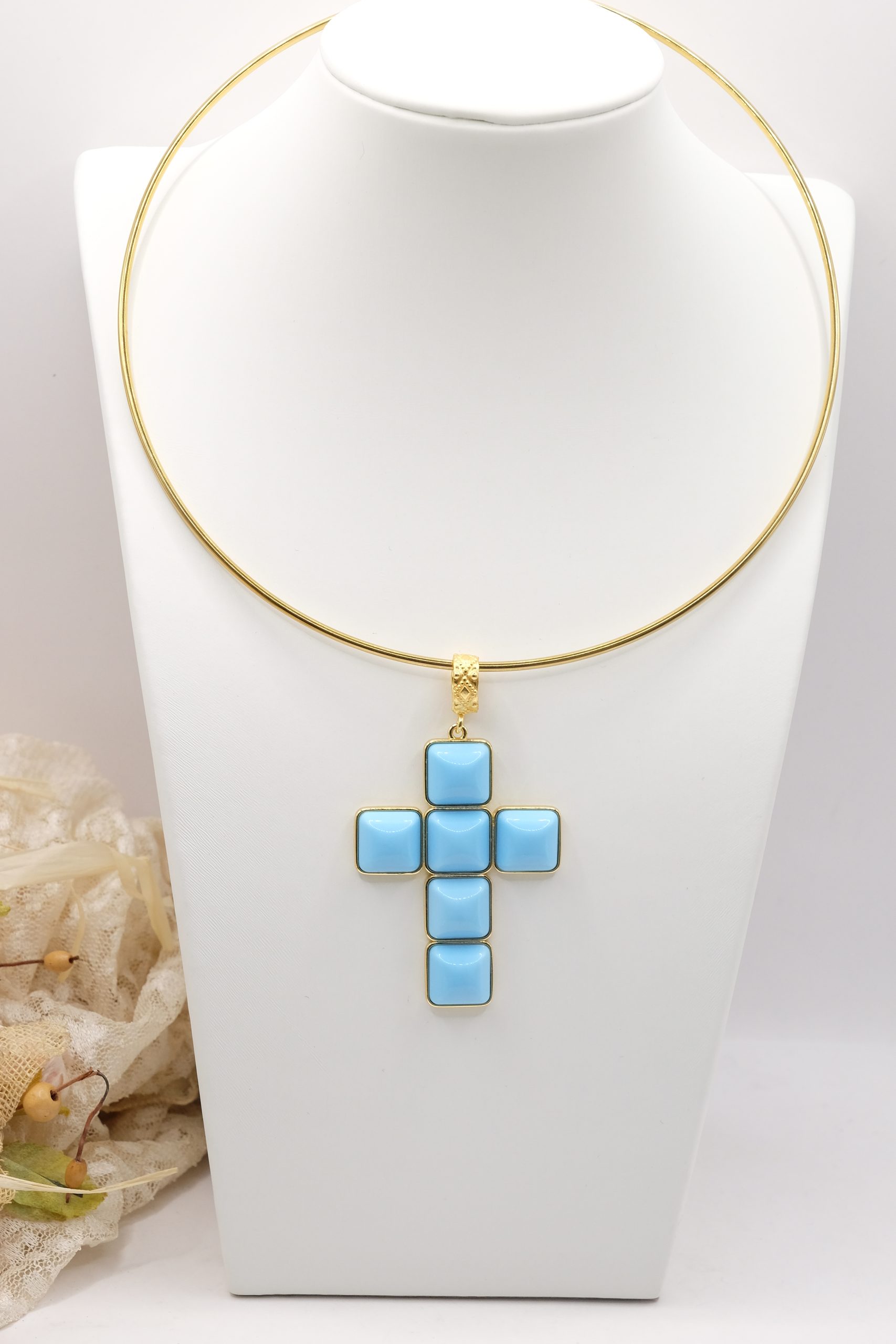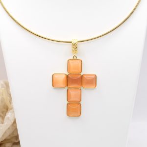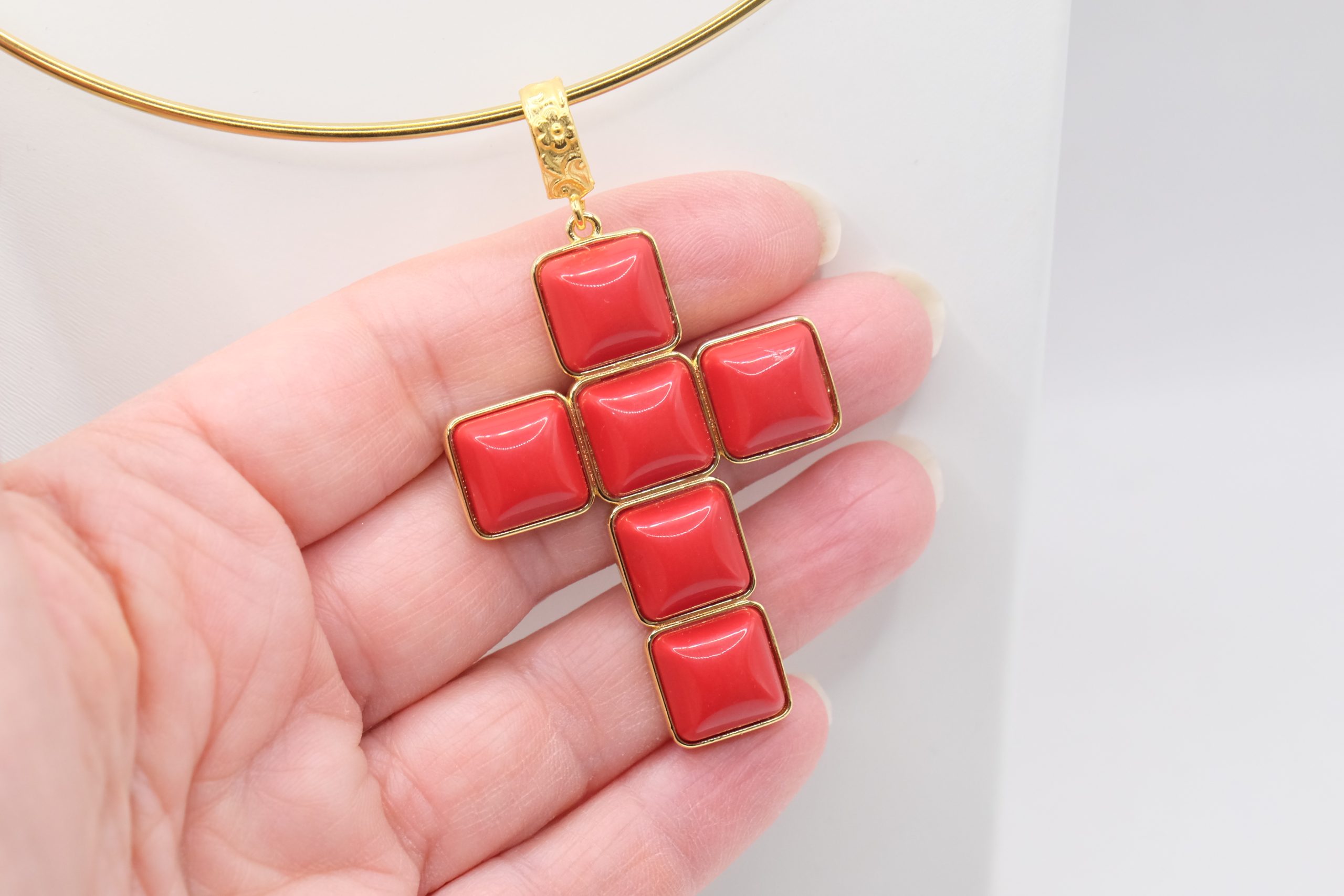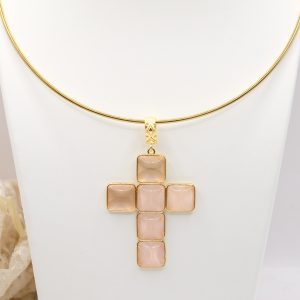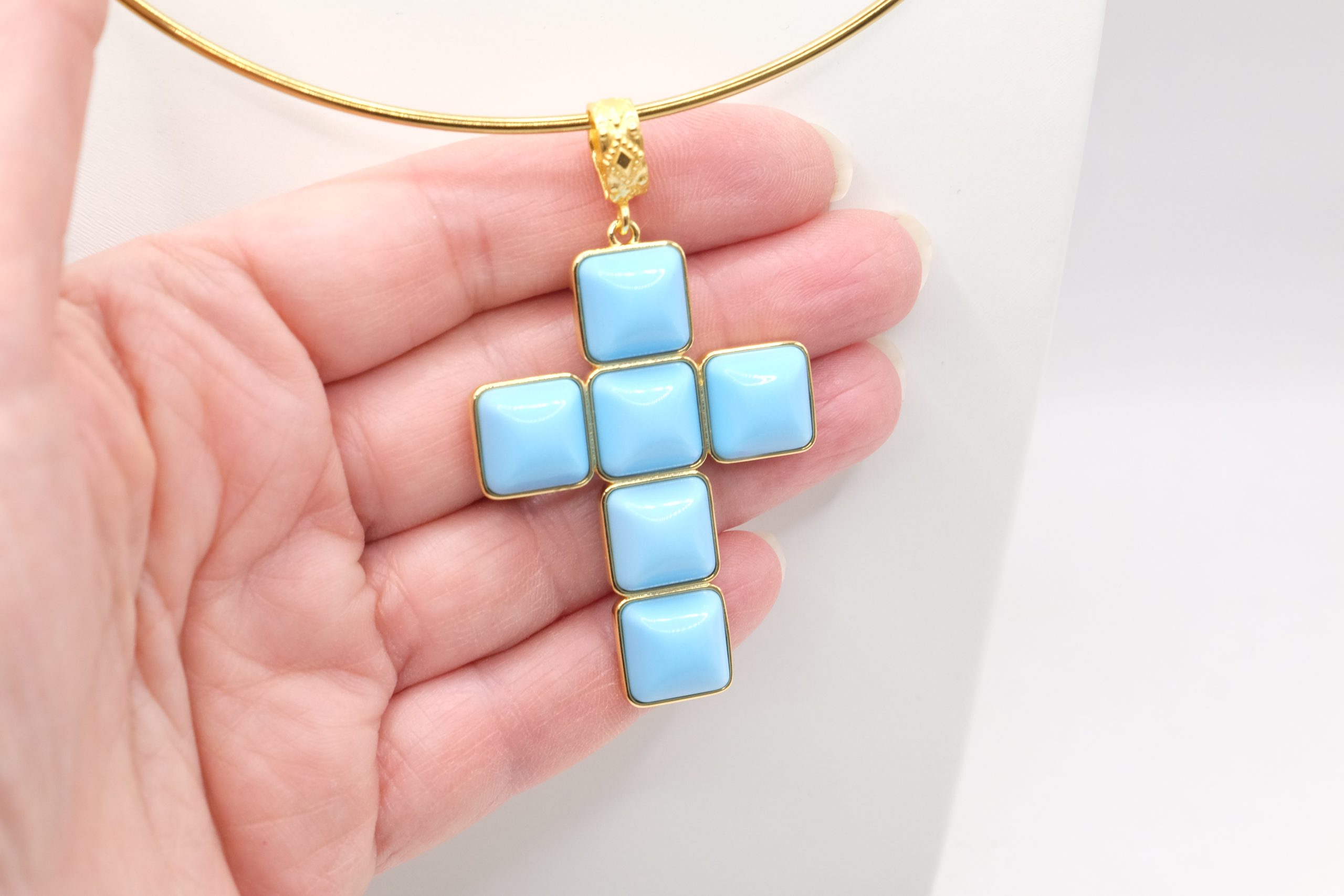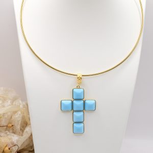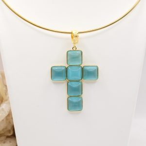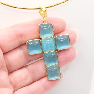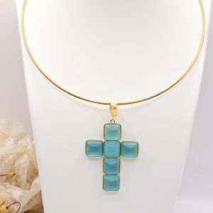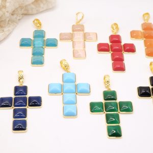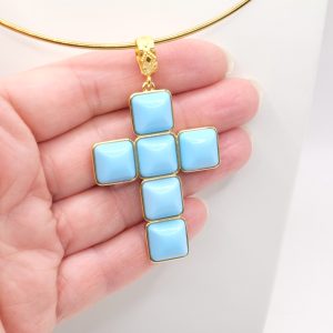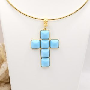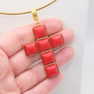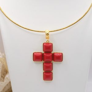With gold-plated brass cross pendant with coral or turquoise stones or pastes