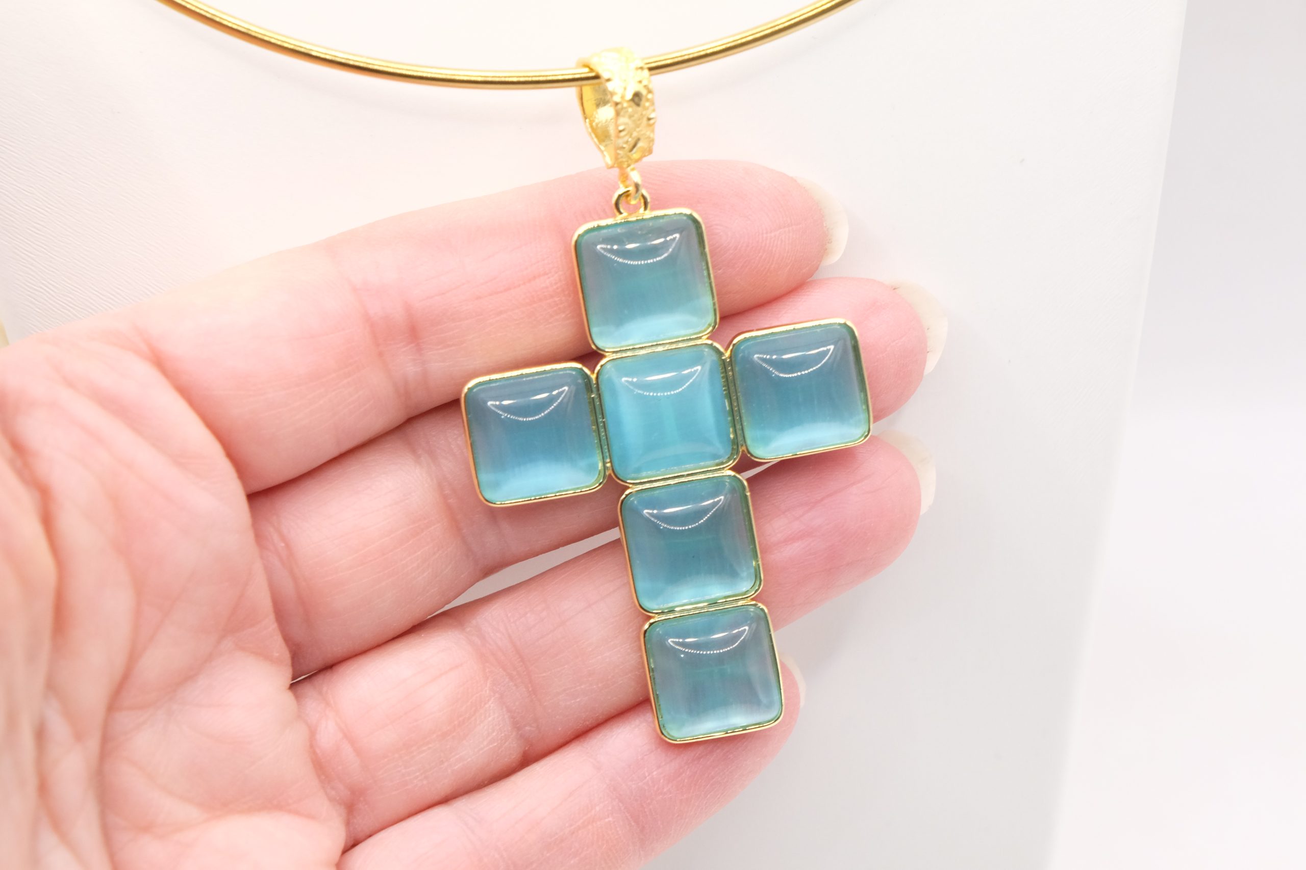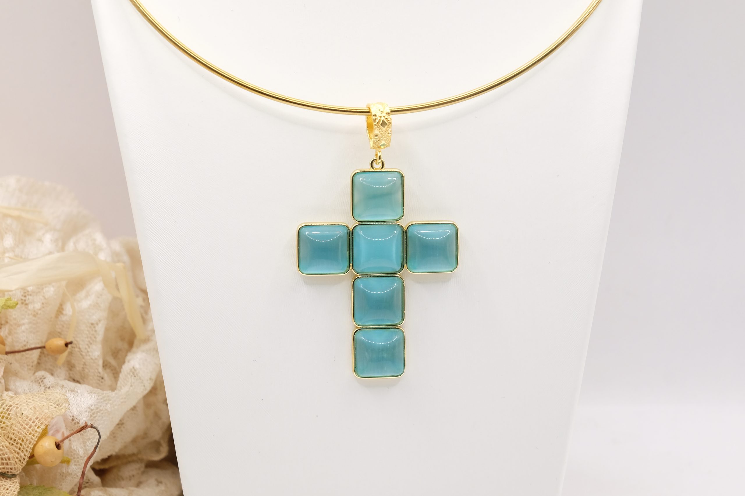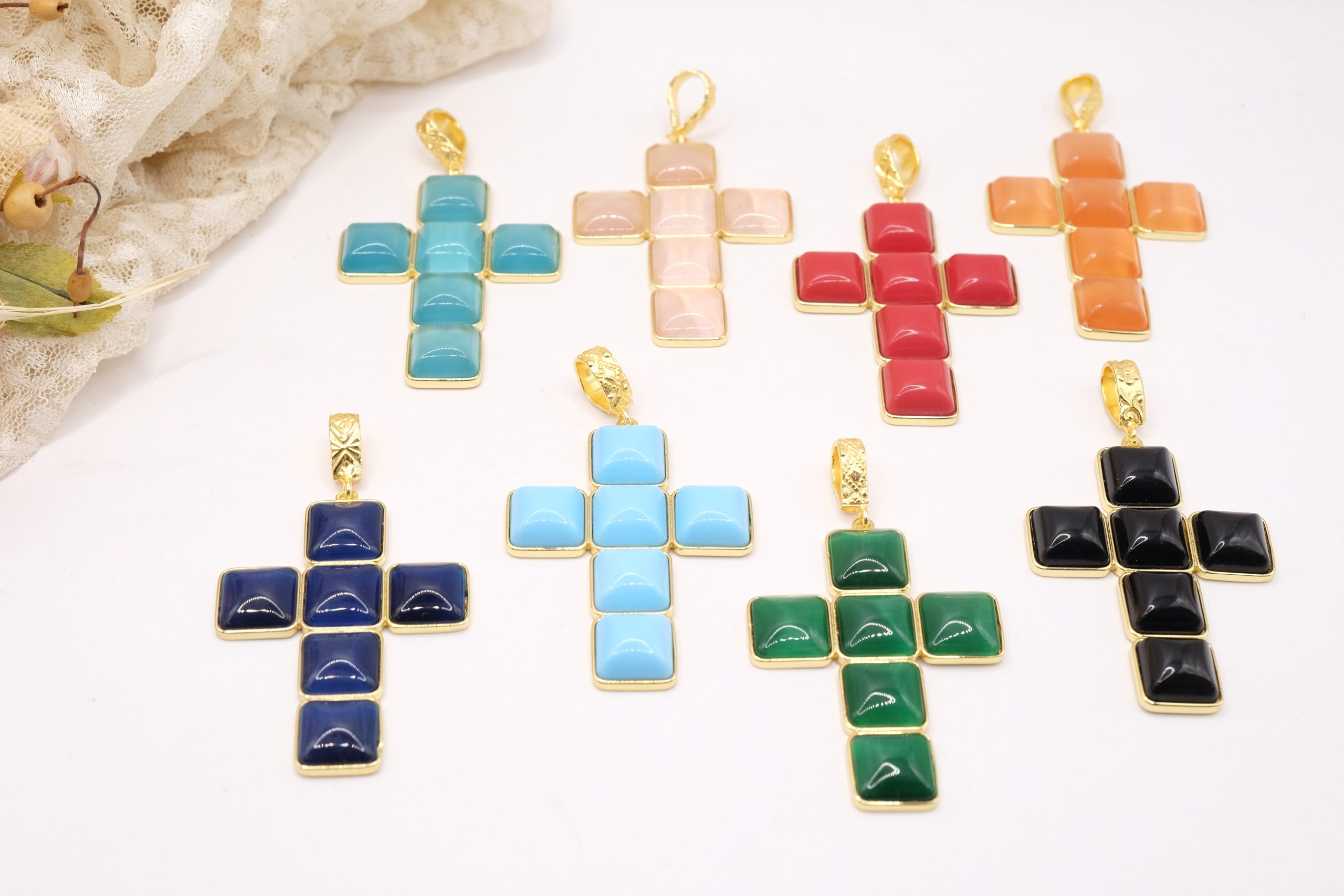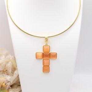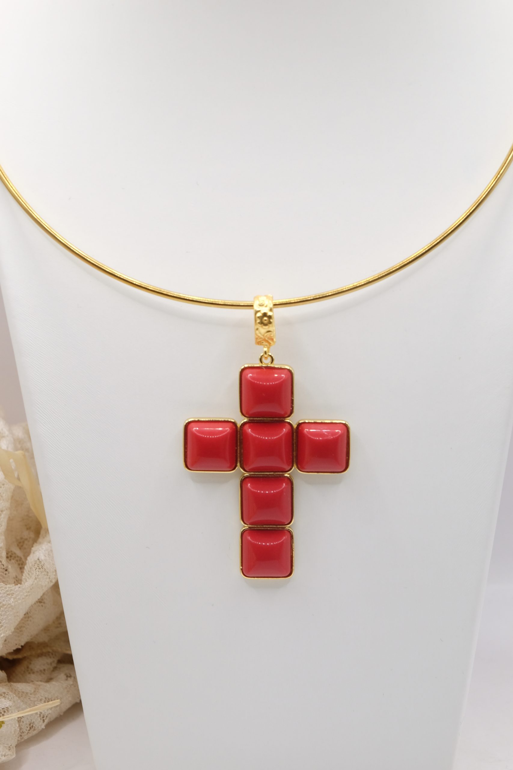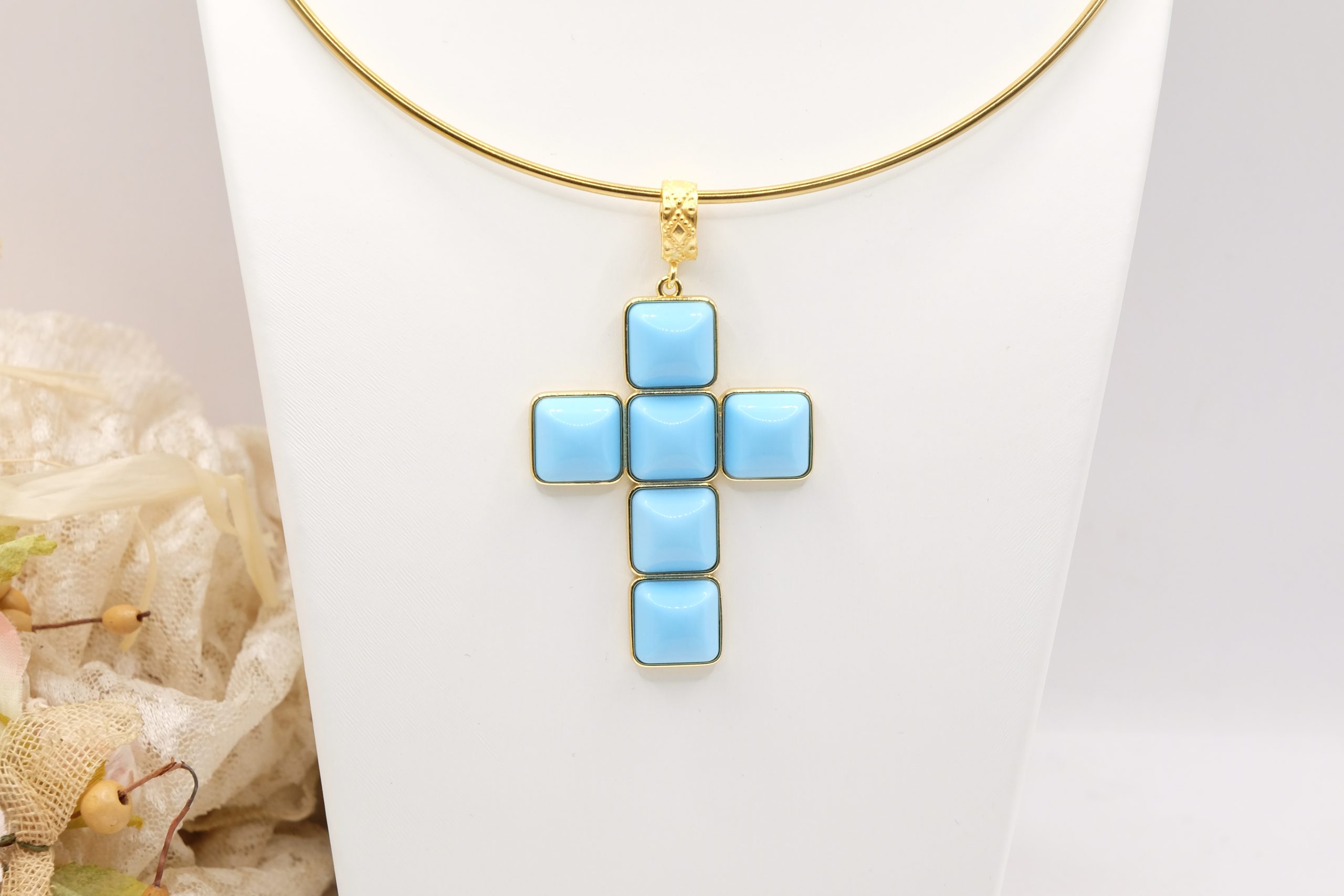 With gold-plated brass cross pendant with coral or turquoise stones or pastes