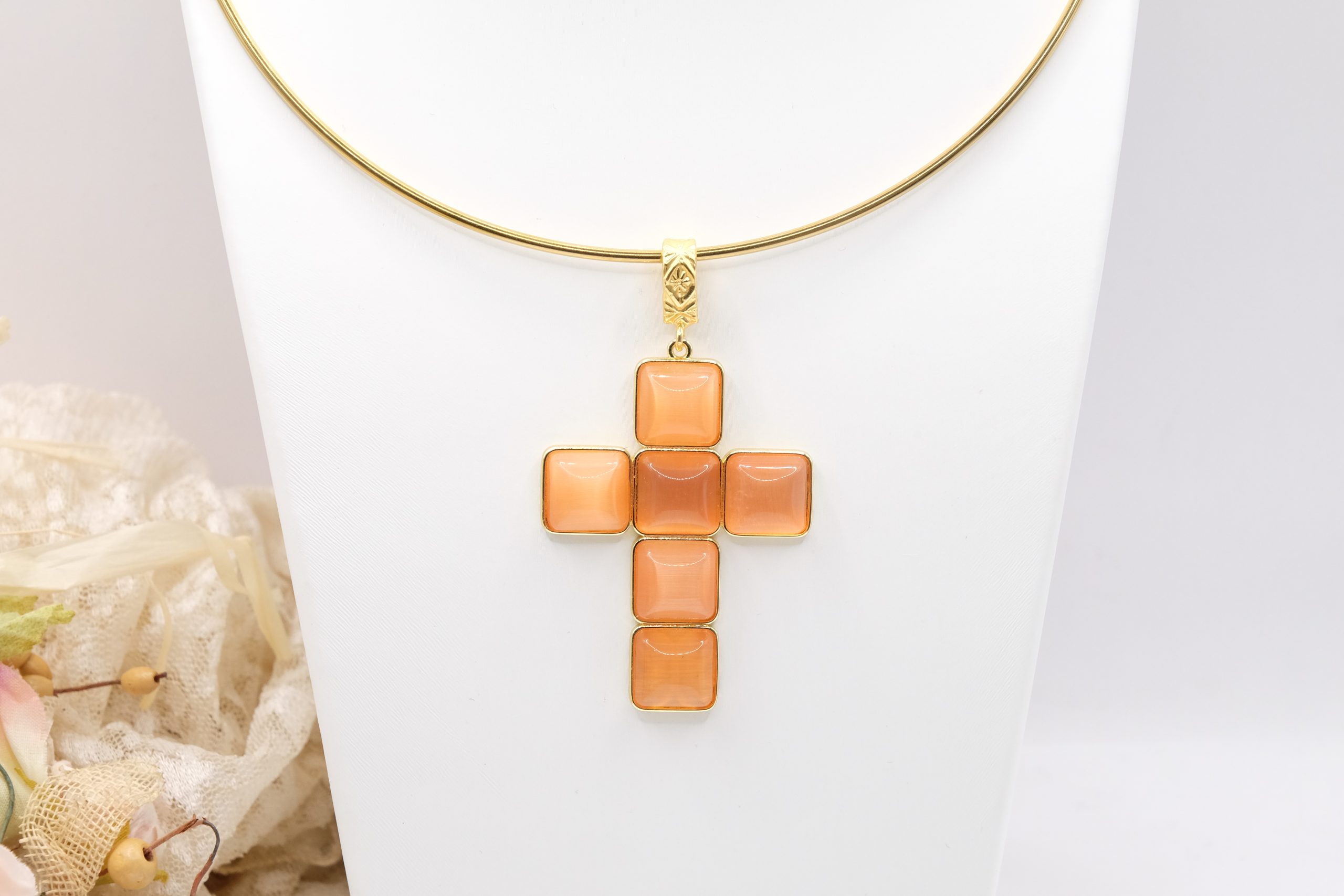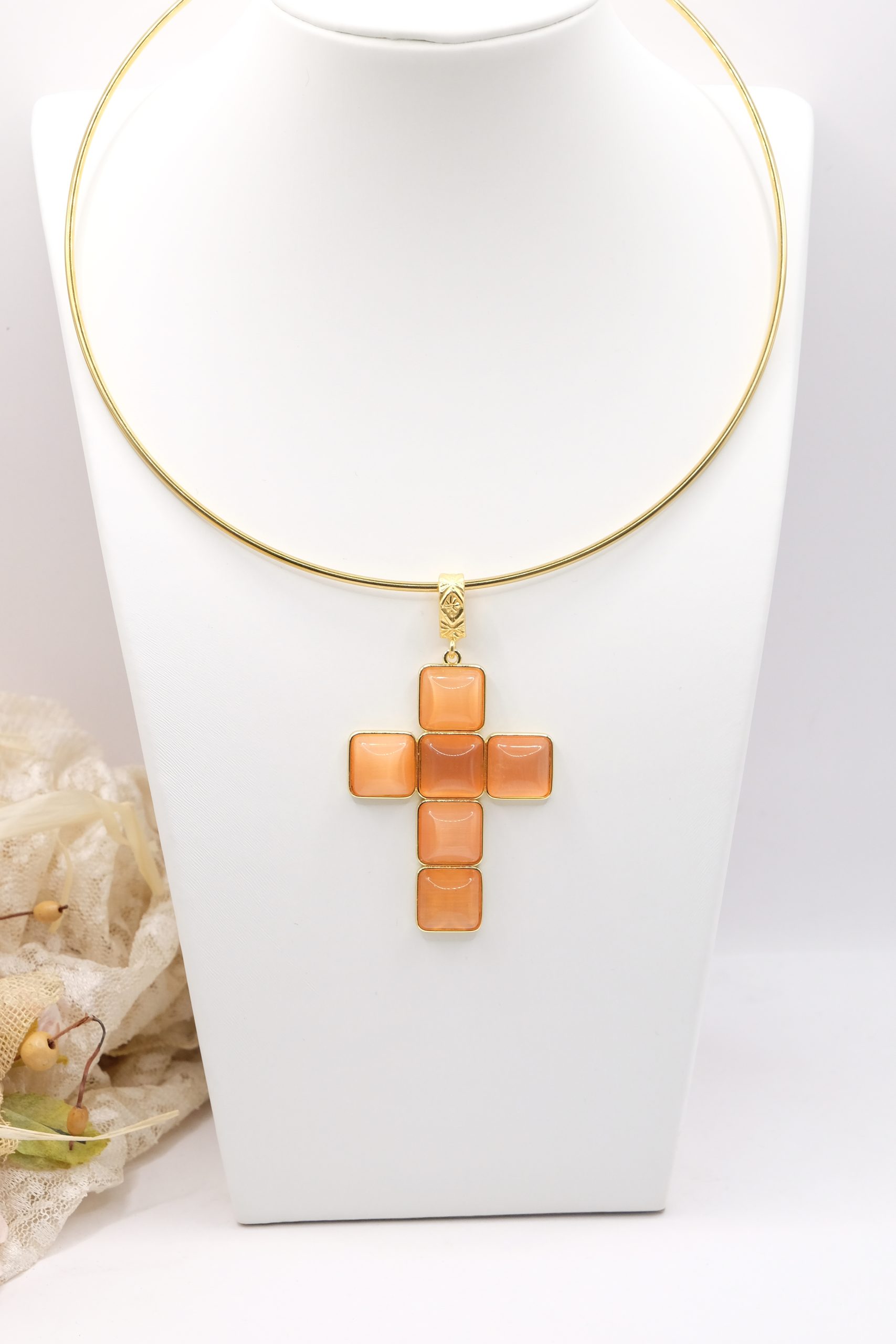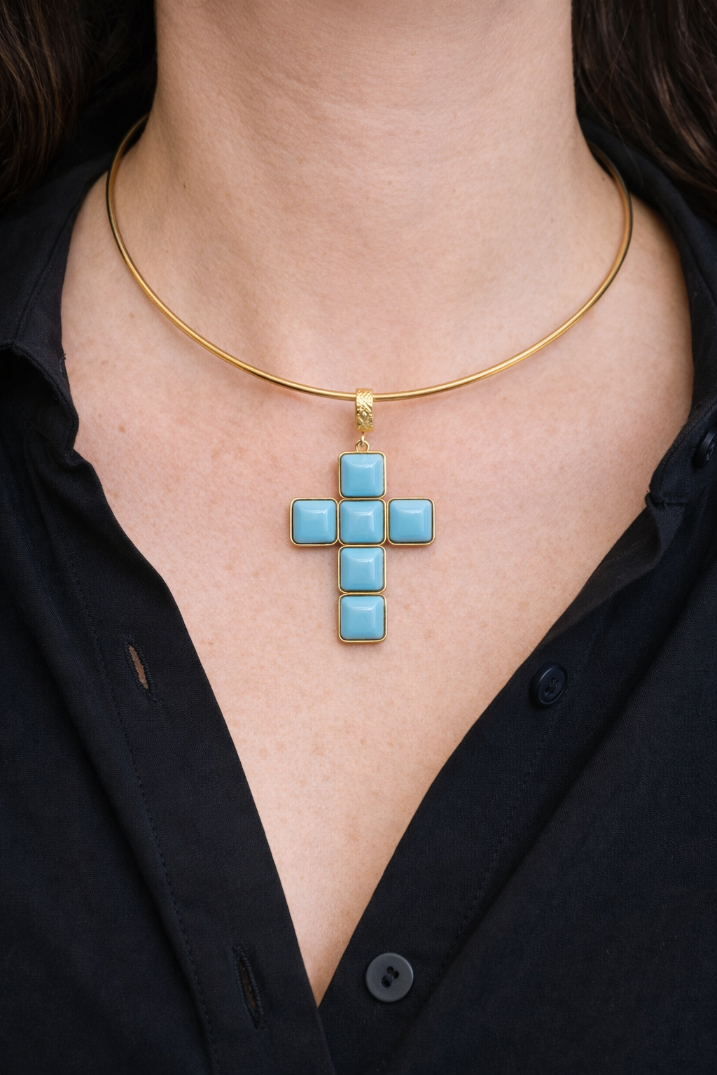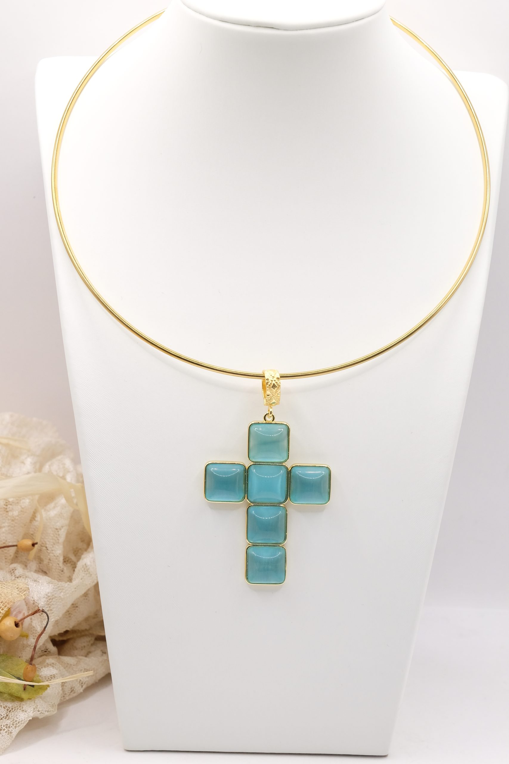 With gold-plated brass cross pendant with coral or turquoise stones or pastes