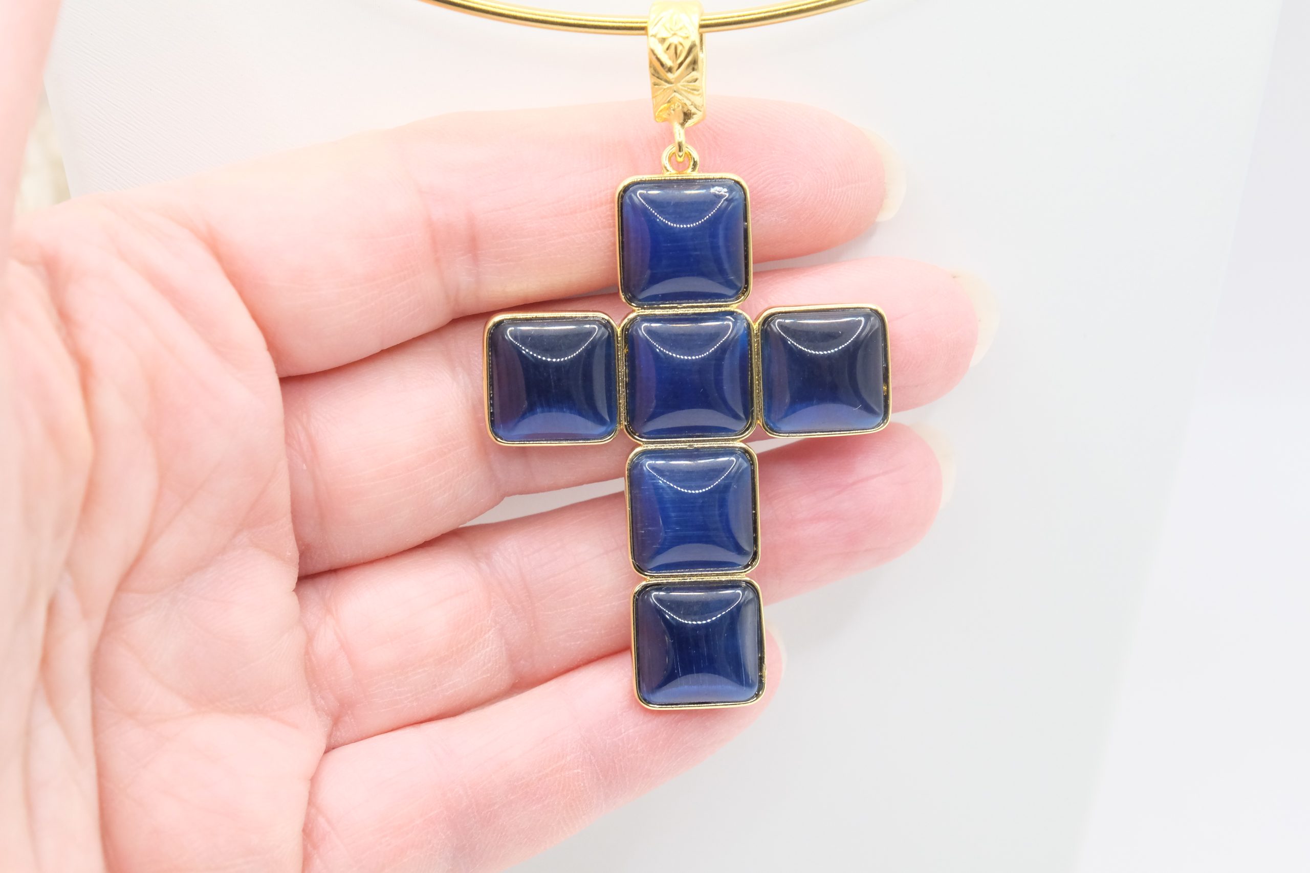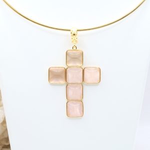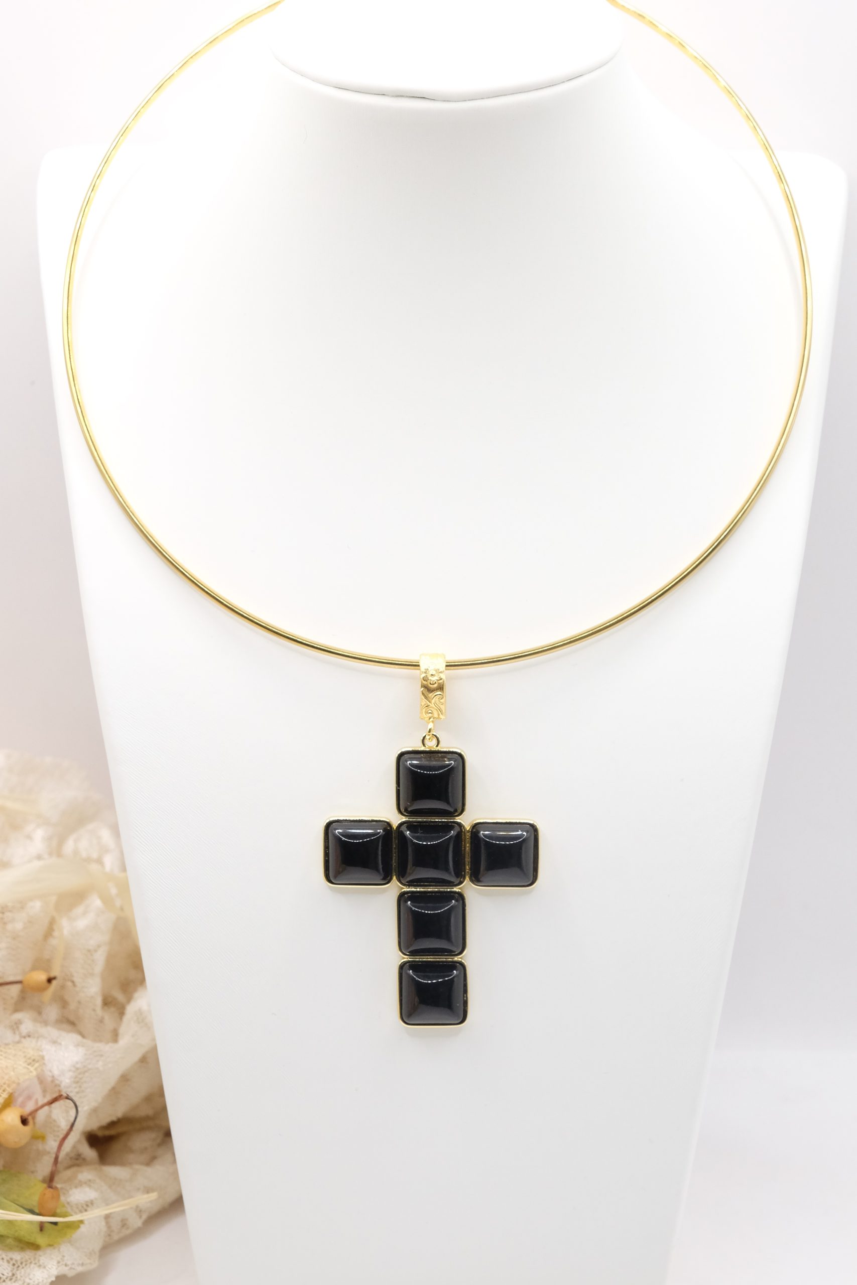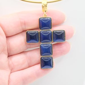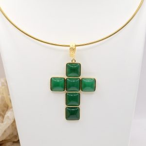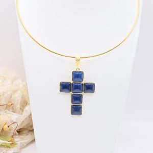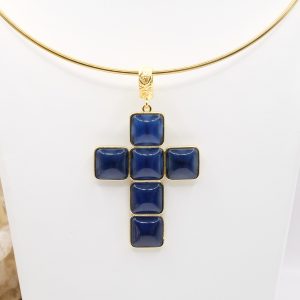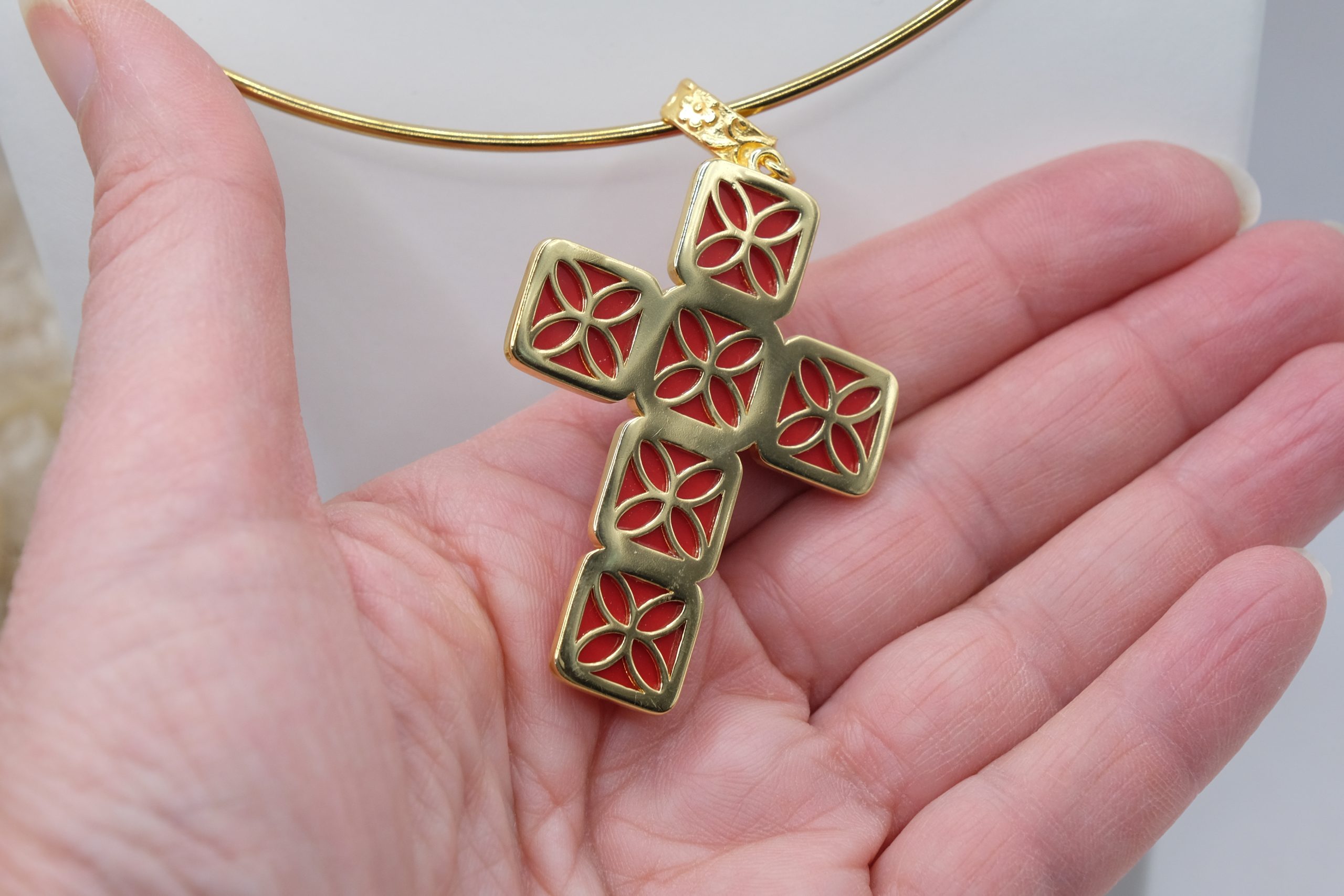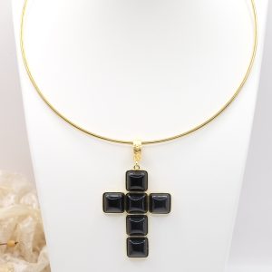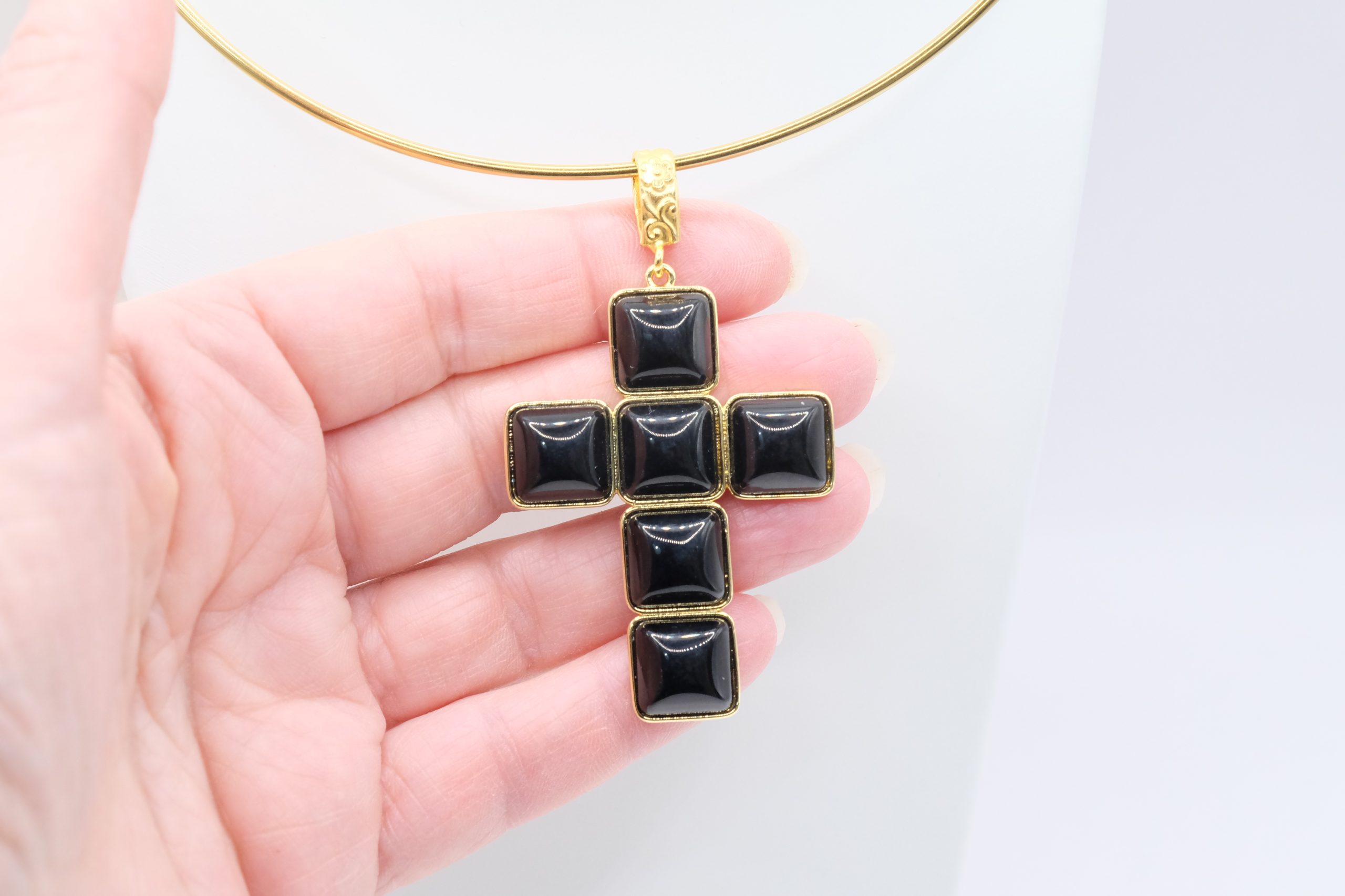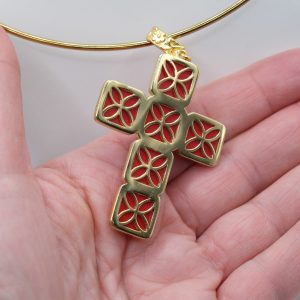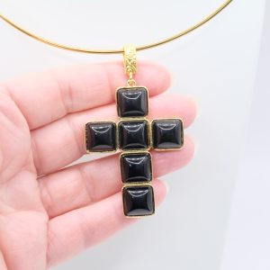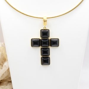 The Cross Pendant measures 7 x 4 cm and can be worn with chains or small bead necklaces because it has a loop, or you can buy it complete with a rigid choker or magnetic cord.