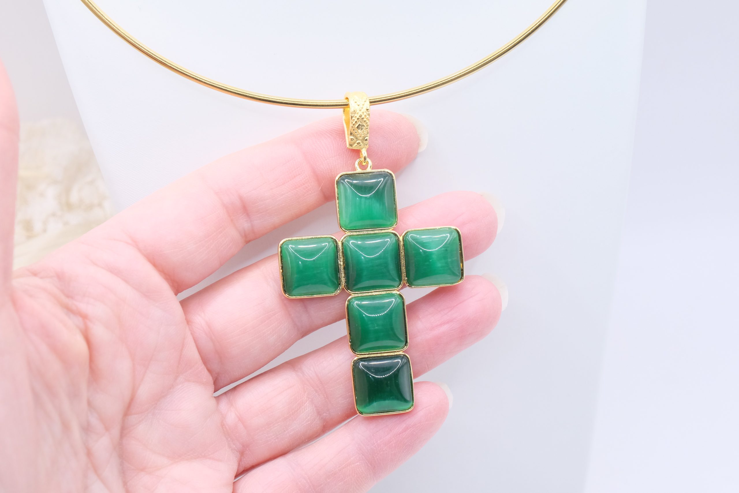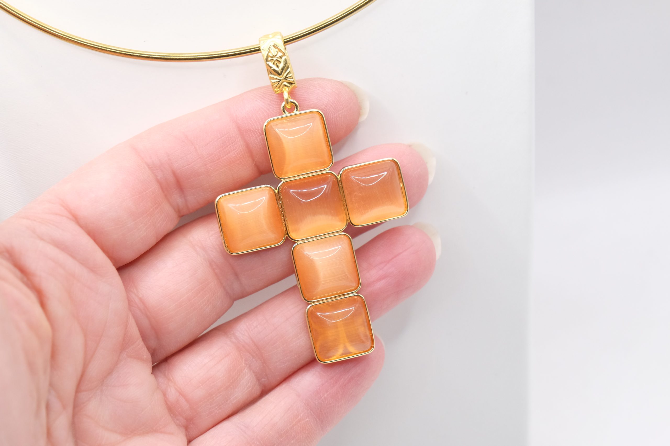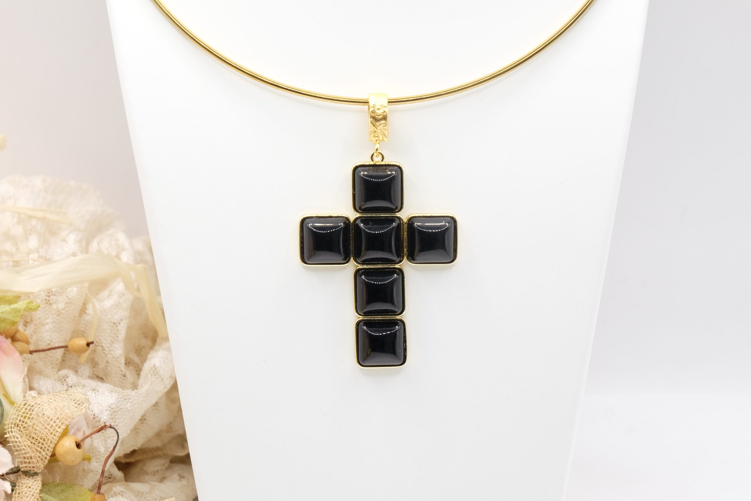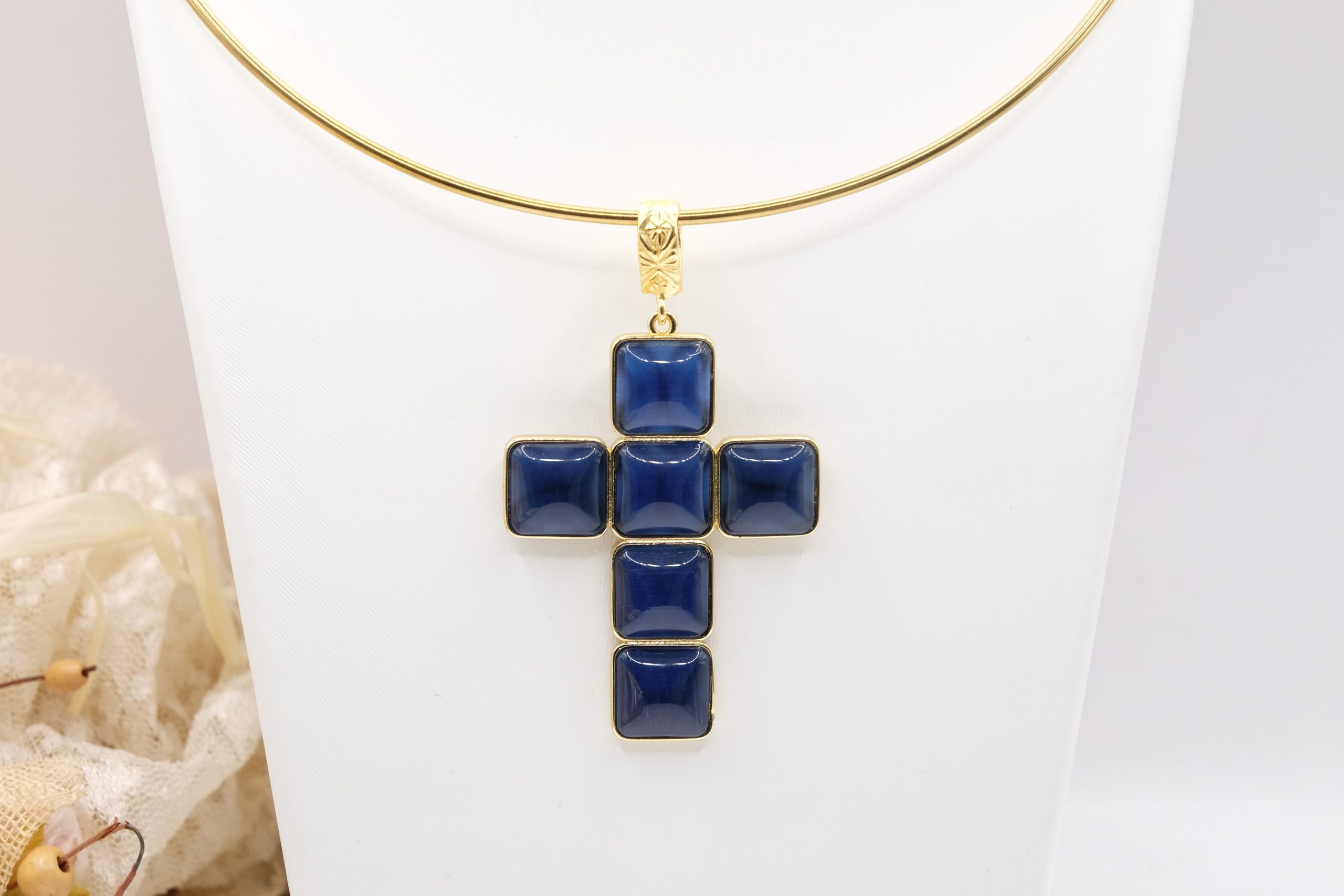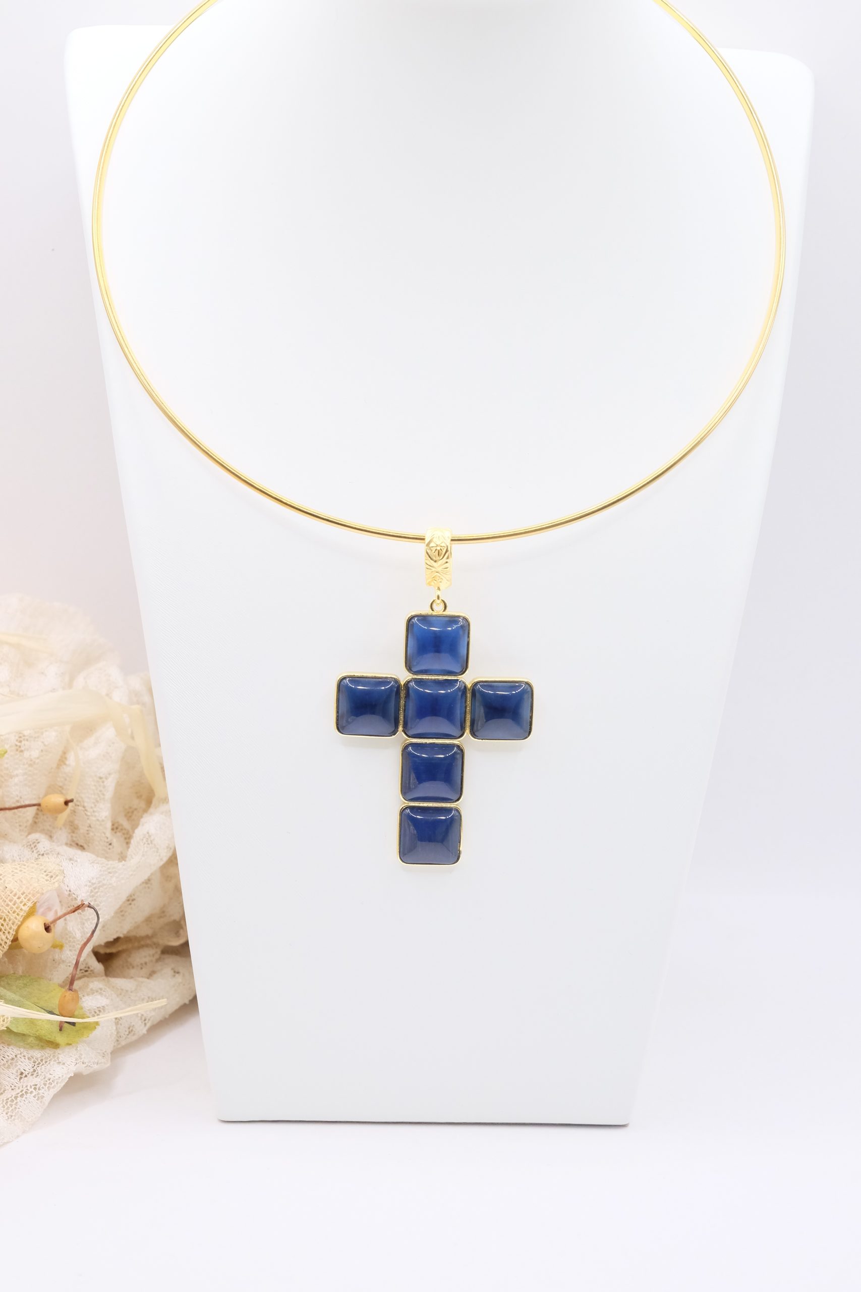 The Cross Pendant measures 7 x 4 cm and can be worn with chains or small bead necklaces because it has a loop, or you can buy it complete with a rigid choker or magnetic cord.