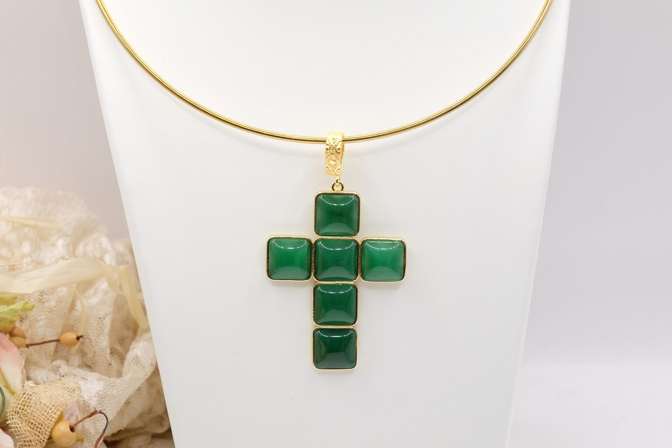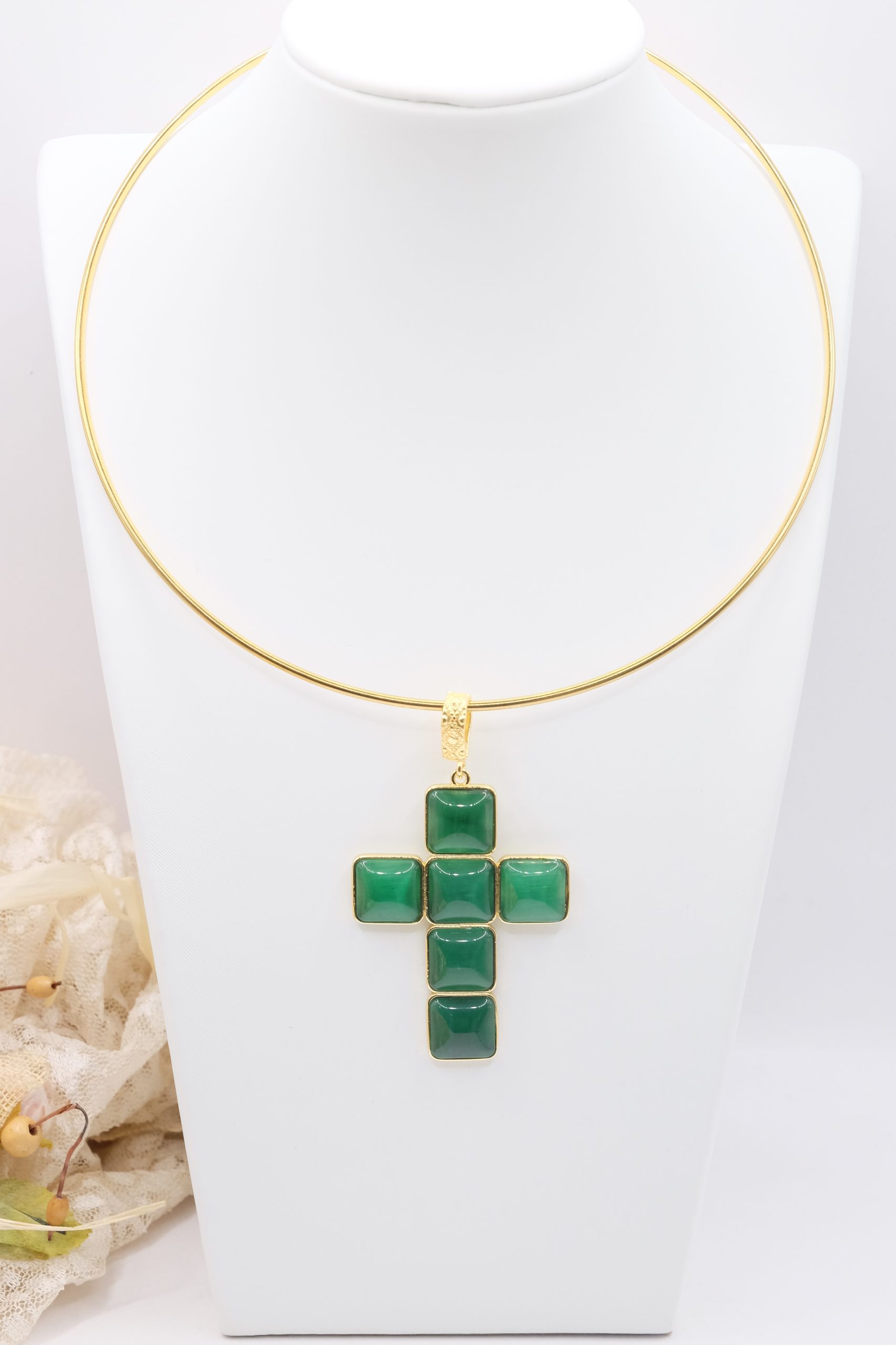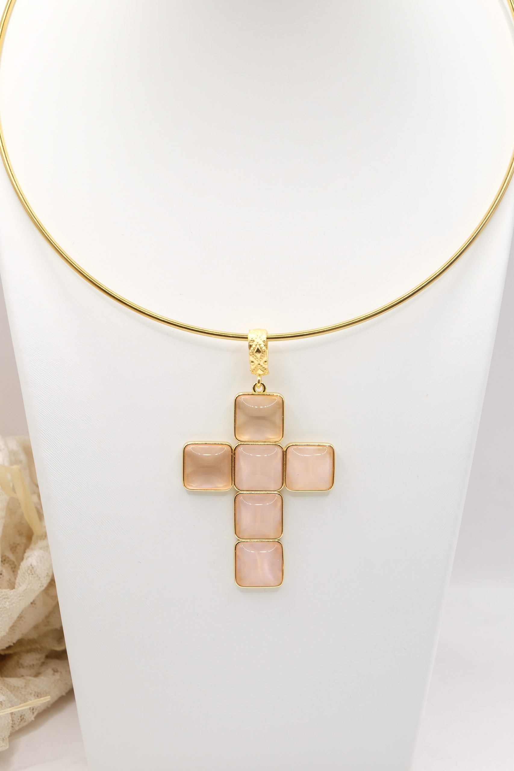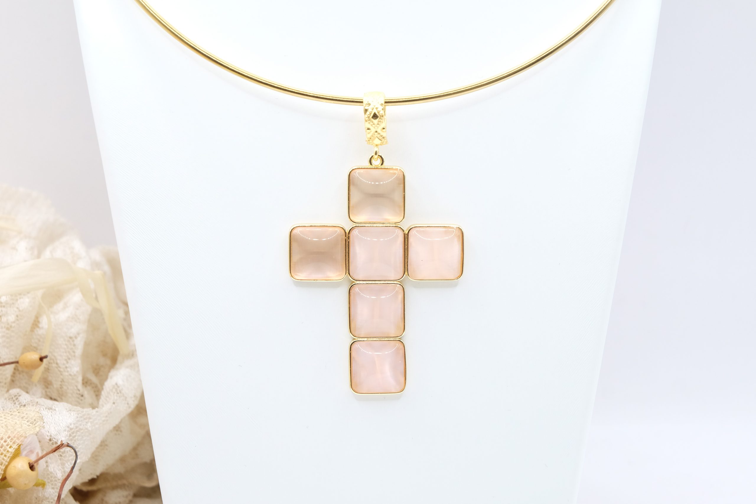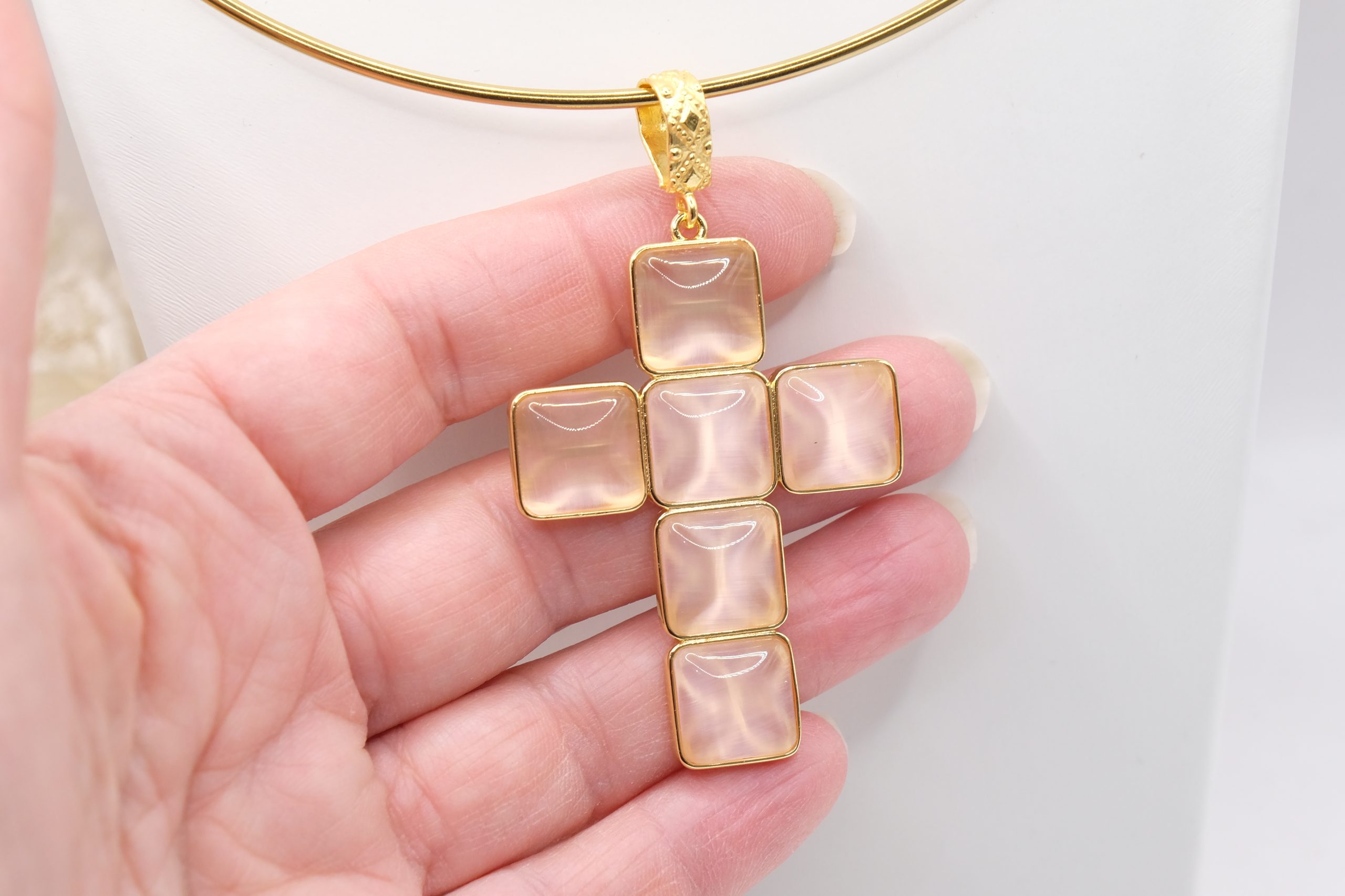 The Cross Pendant measures 7 x 4 cm and can be worn with chains or small bead necklaces because it has a loop, or you can buy it complete with a rigid choker or magnetic cord.