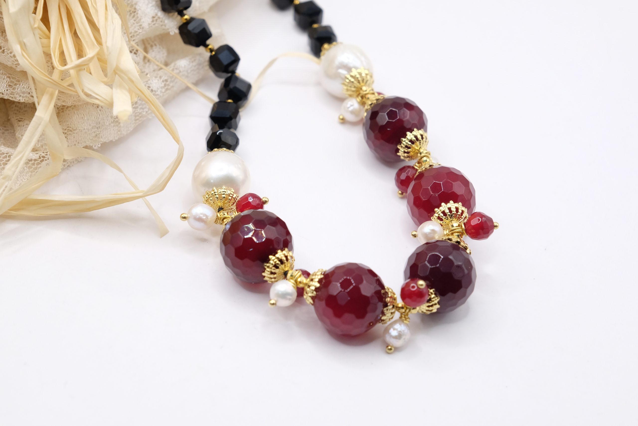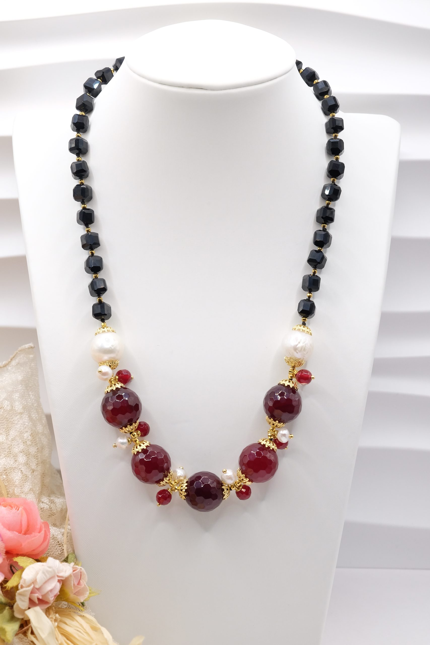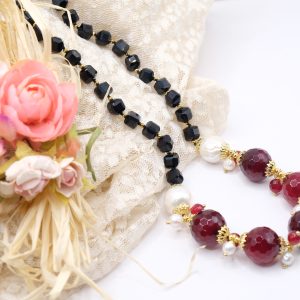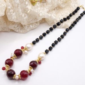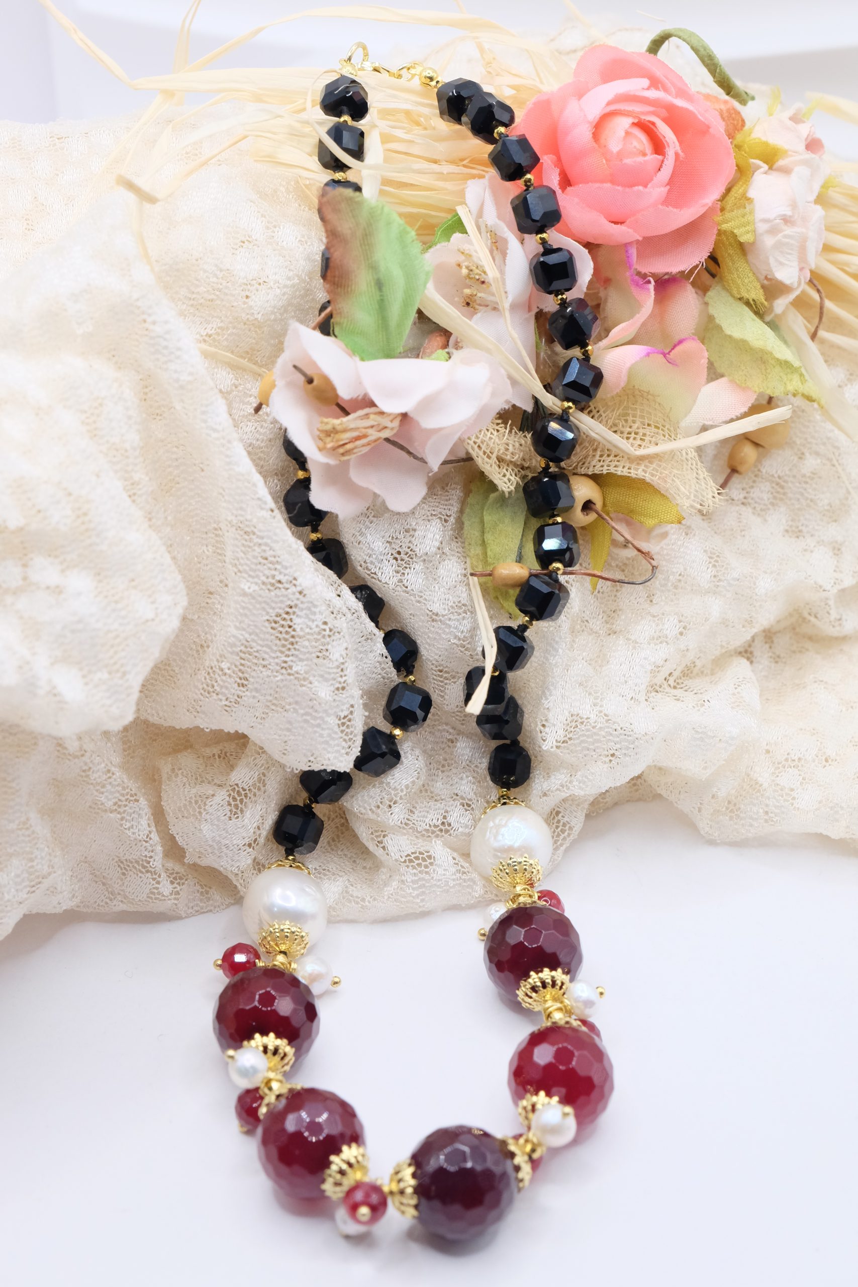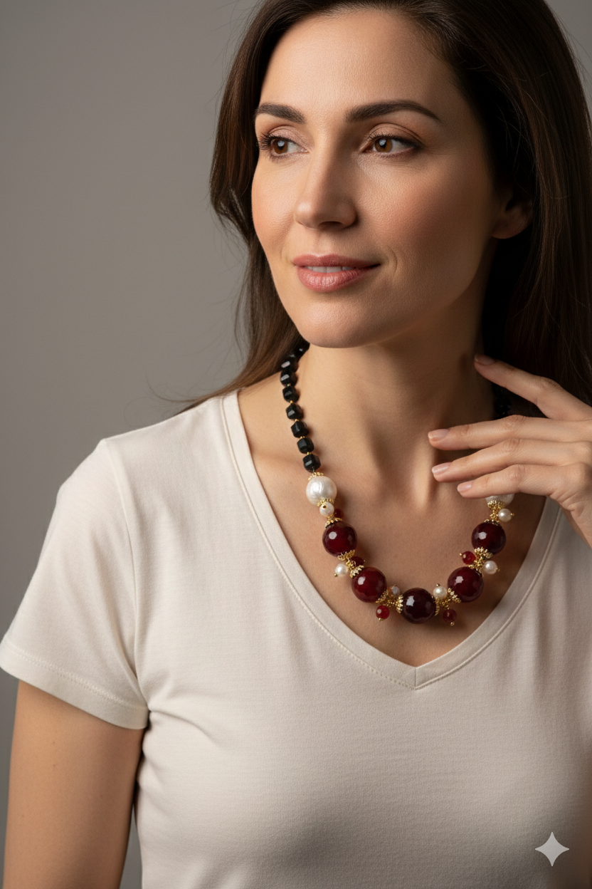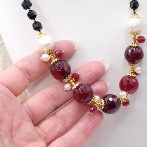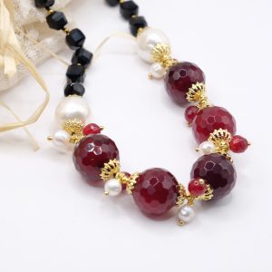 Handcrafted necklace with a strong and elegant character, made with faceted onyx and a refined central in burgundy jade, enriched by natural pearls.