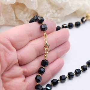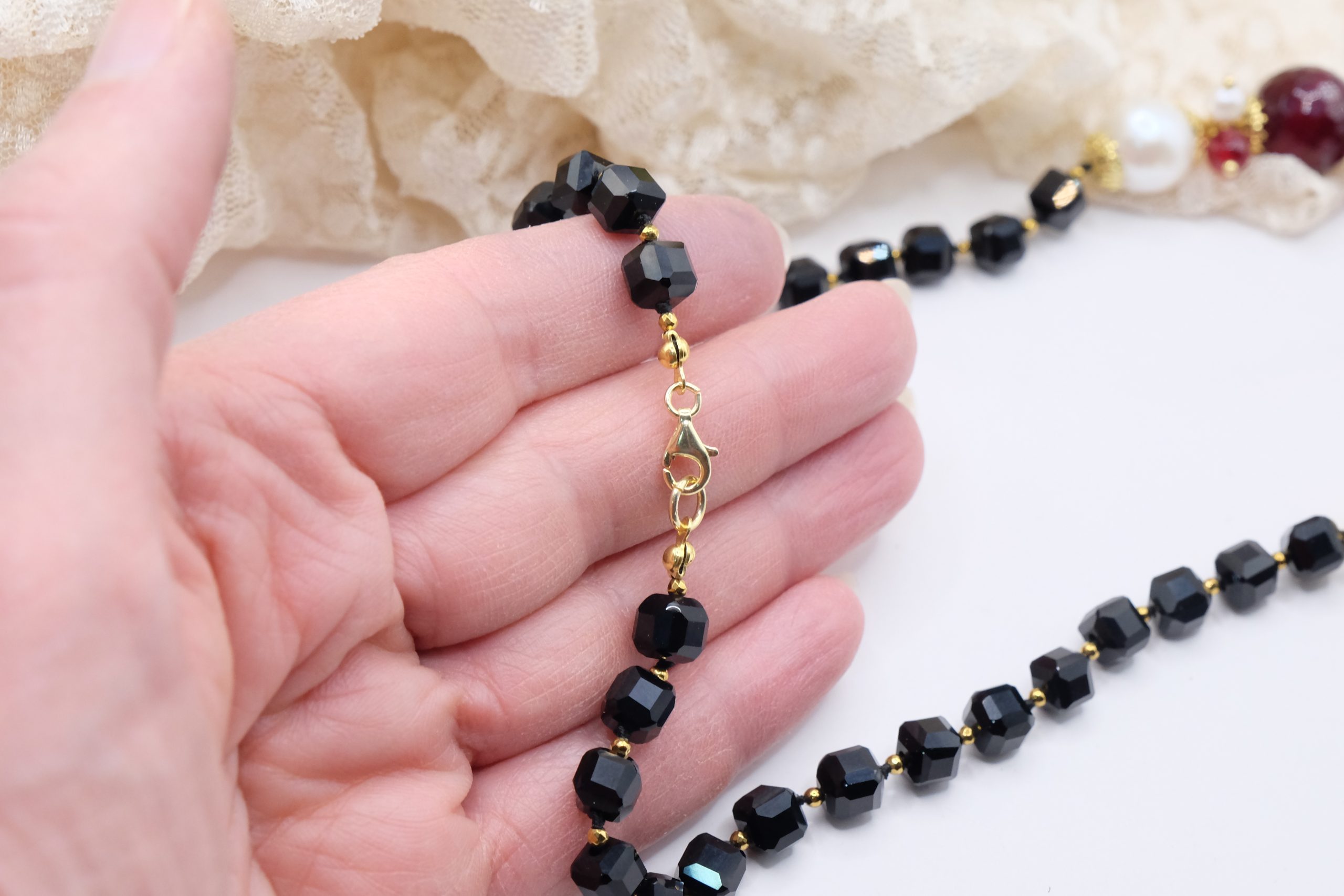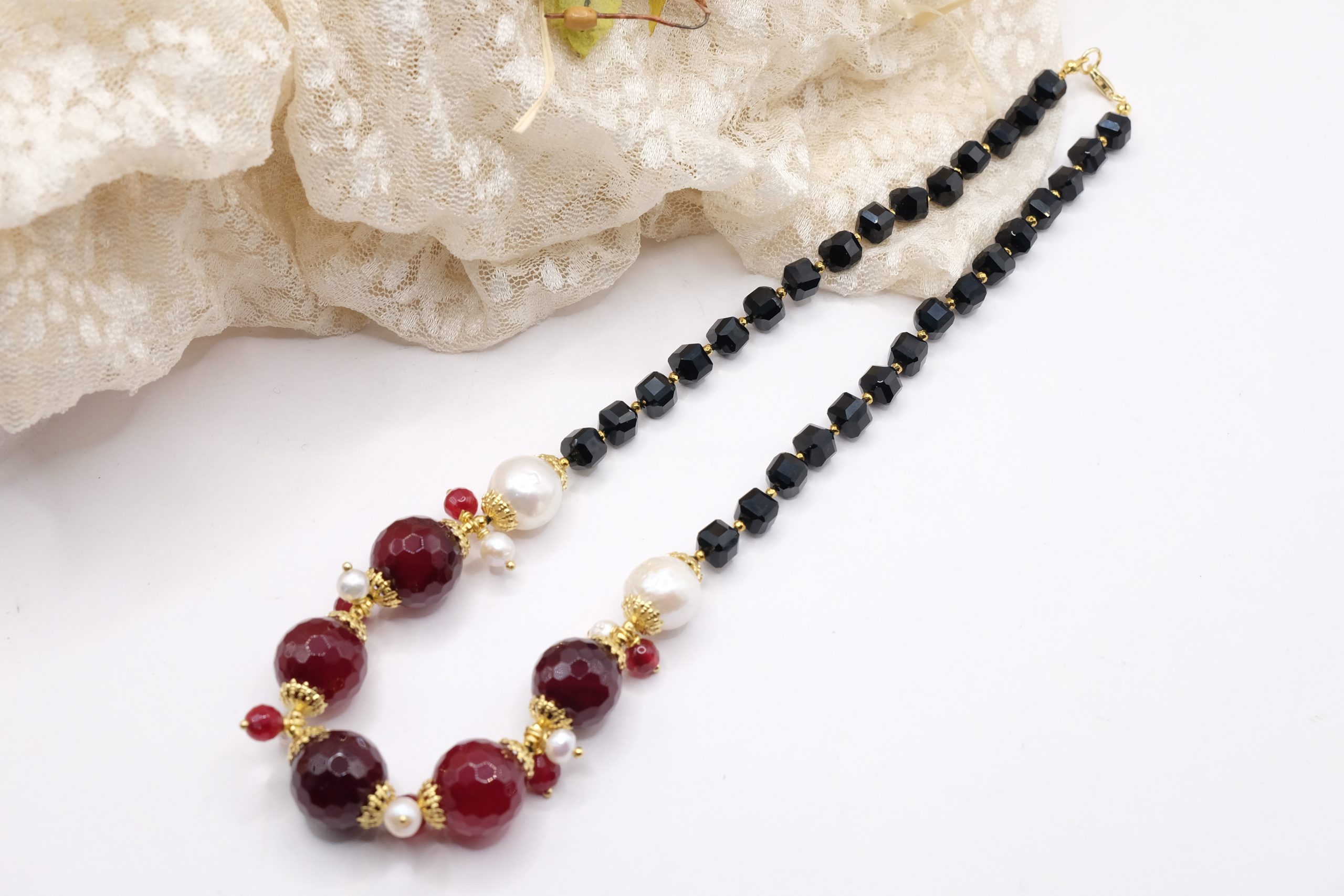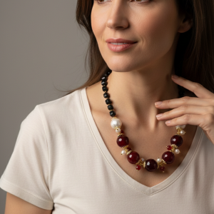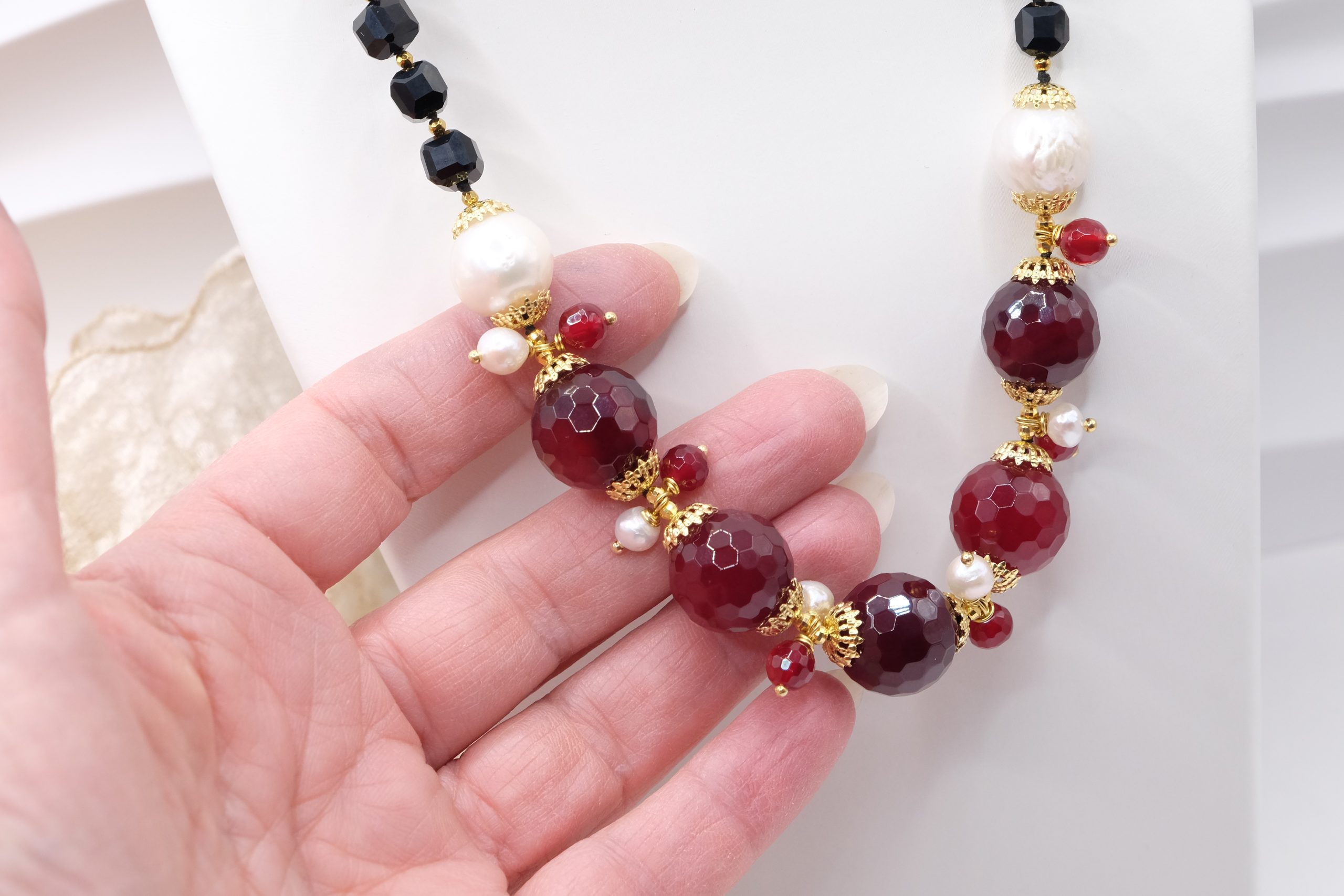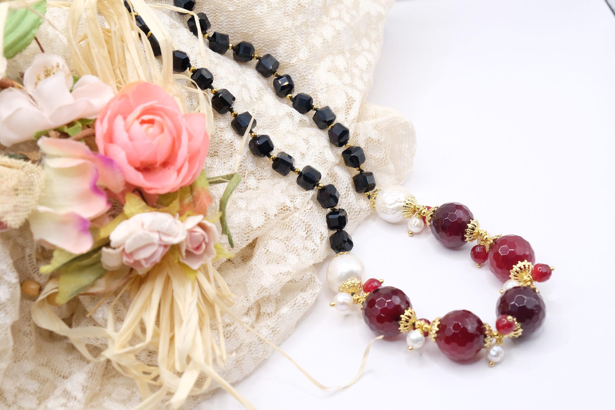Handcrafted necklace with a strong and elegant character, made with faceted onyx and a refined central in burgundy jade, enriched by natural pearls.