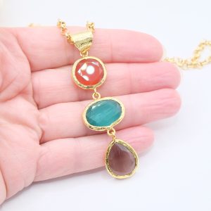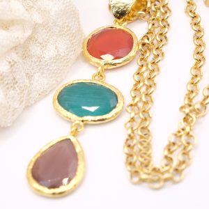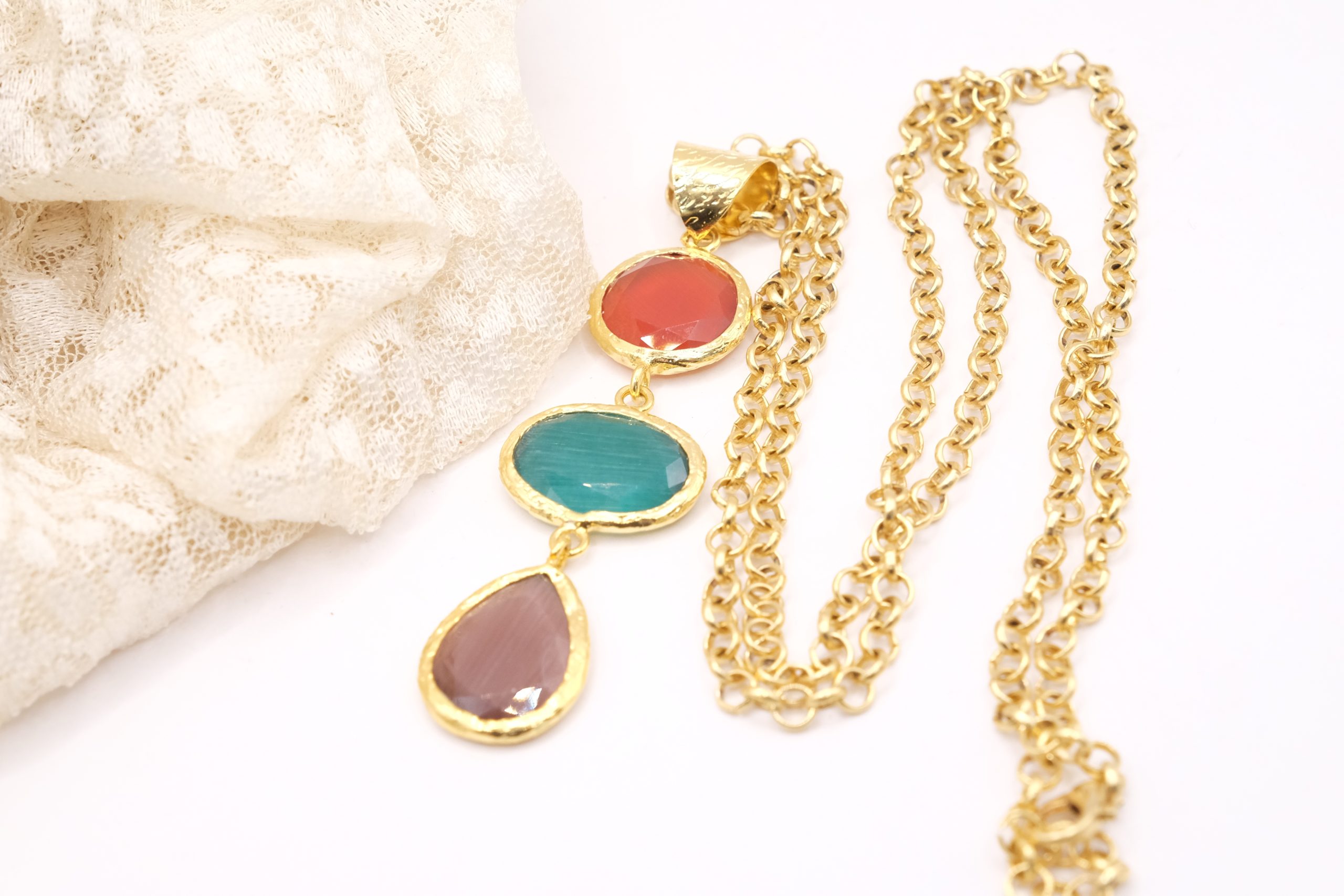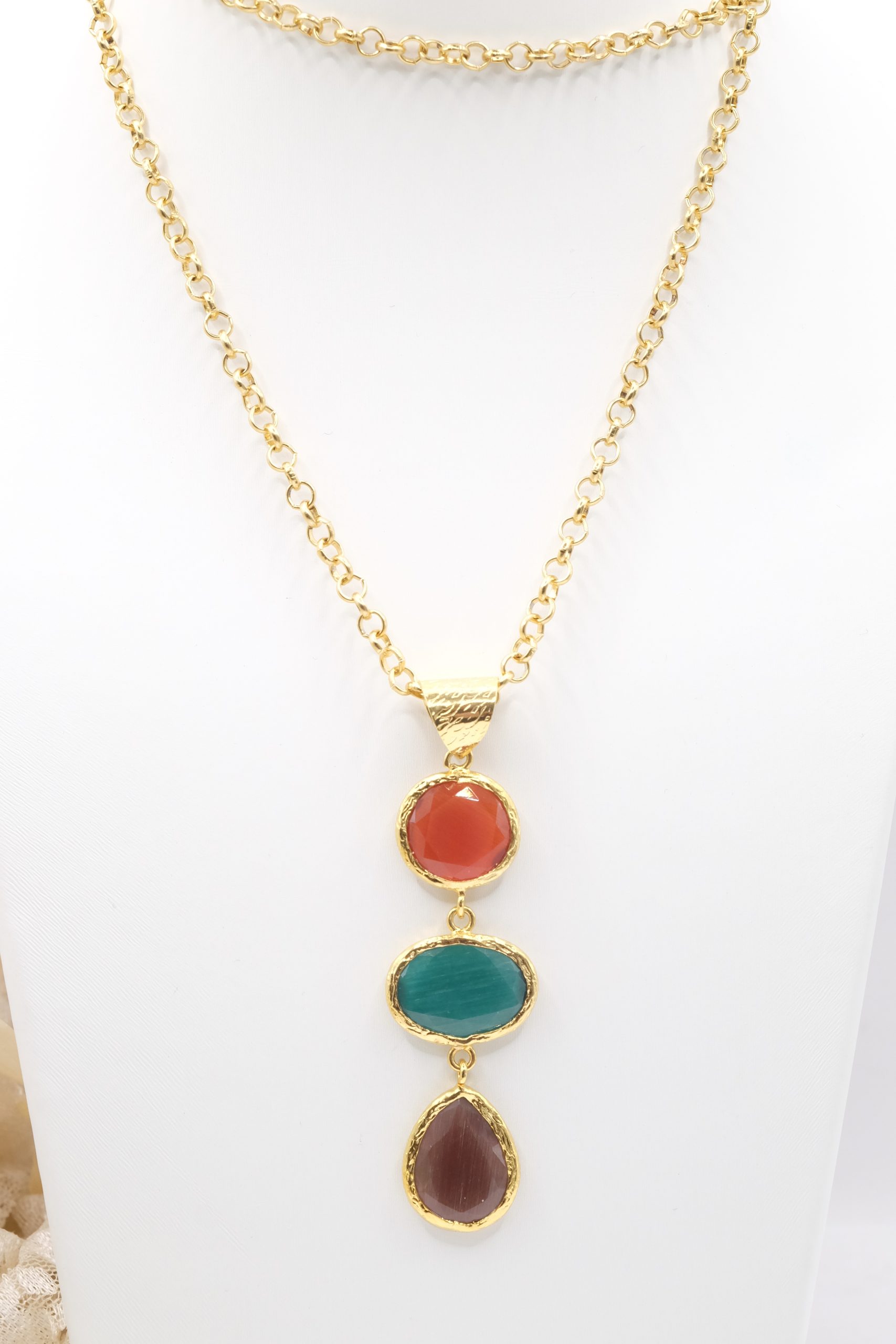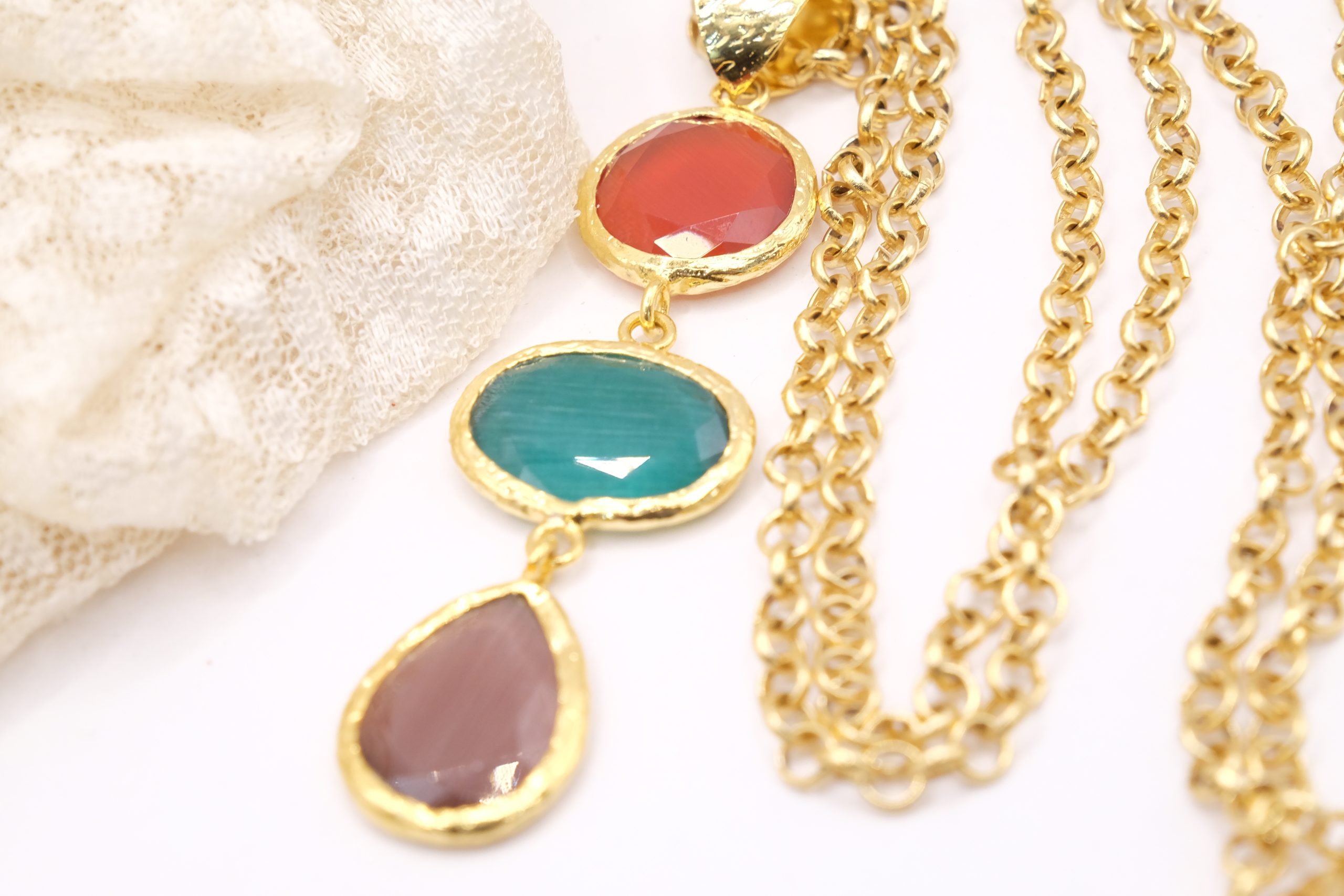 With a detachable pendant featuring 3 faceted cat's eye elements and a gold-plated brass chain necklace that you can also wear with other pendants.