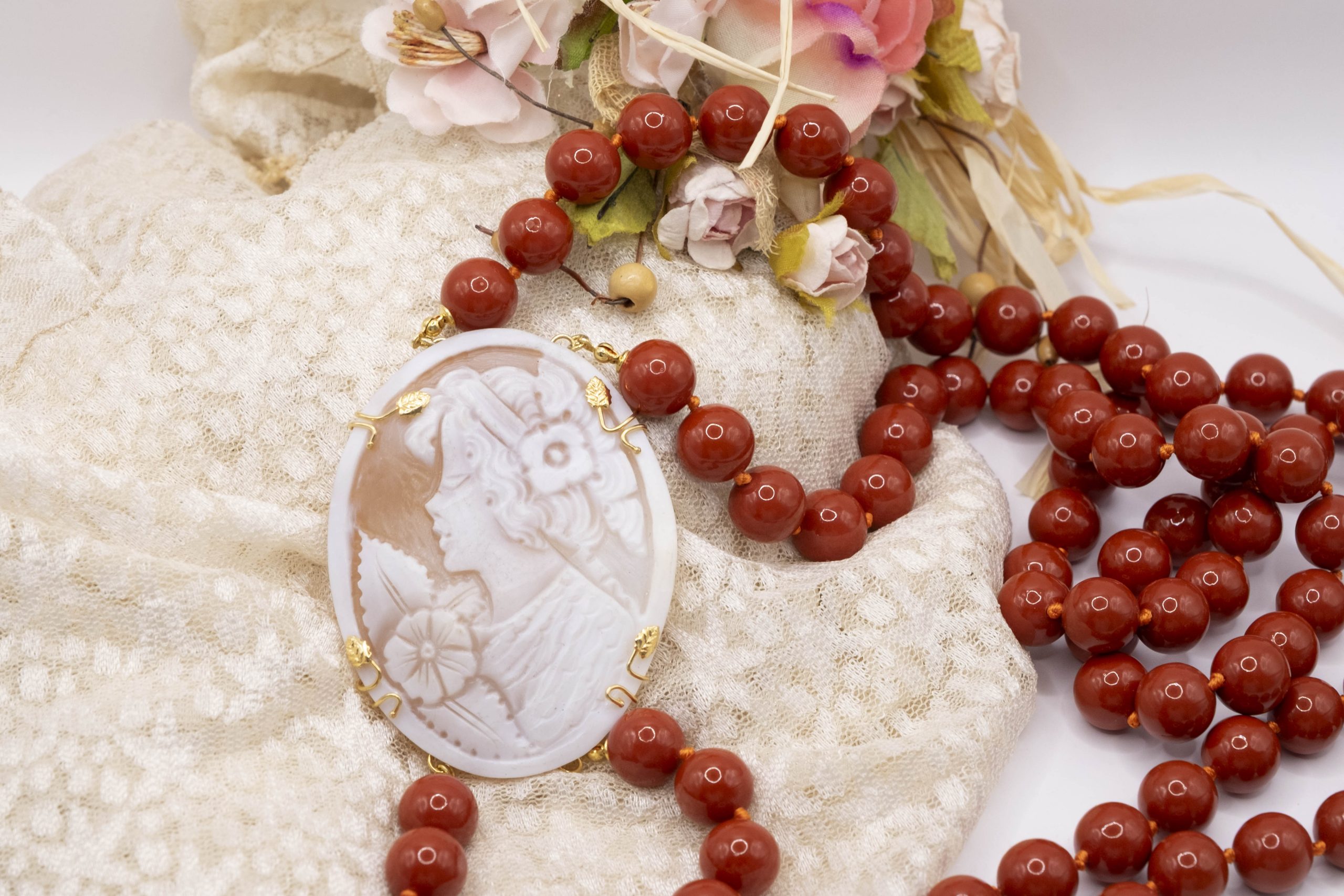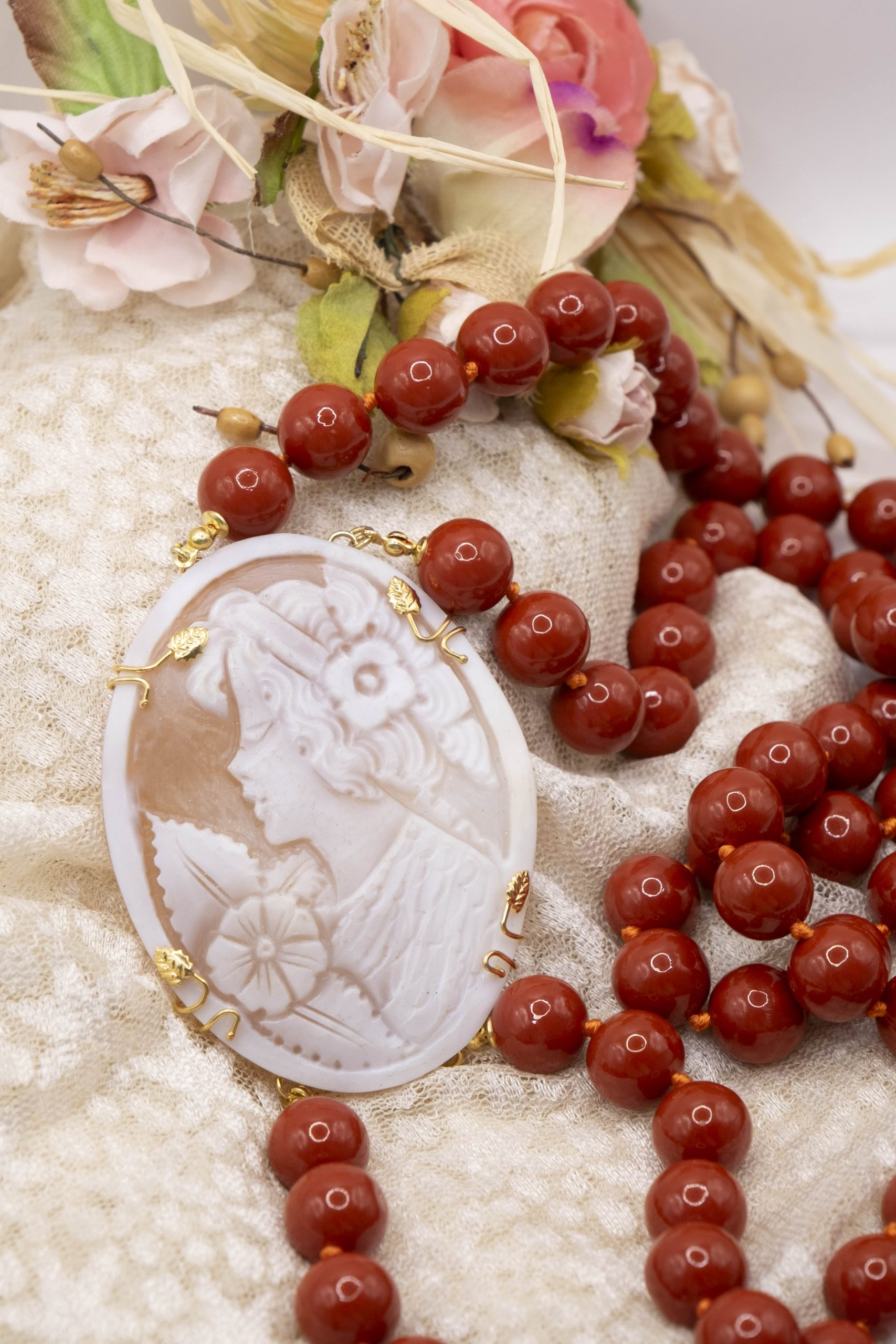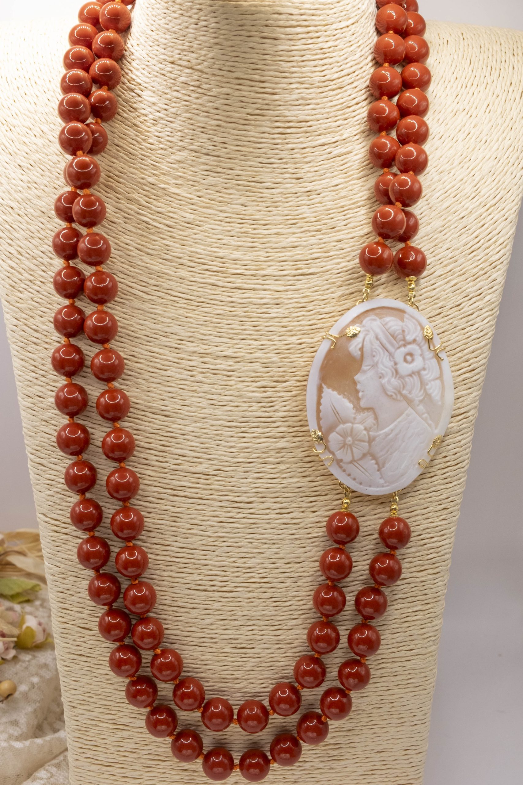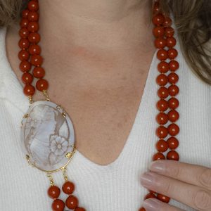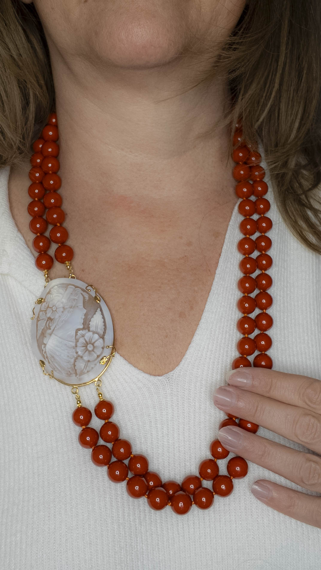 2-row necklace of 12mm red coral paste pearls and a large precious genuine cameo measuring 7 x 5.4cm, in a yellow gold plated 925 silver setting with leaf detail.