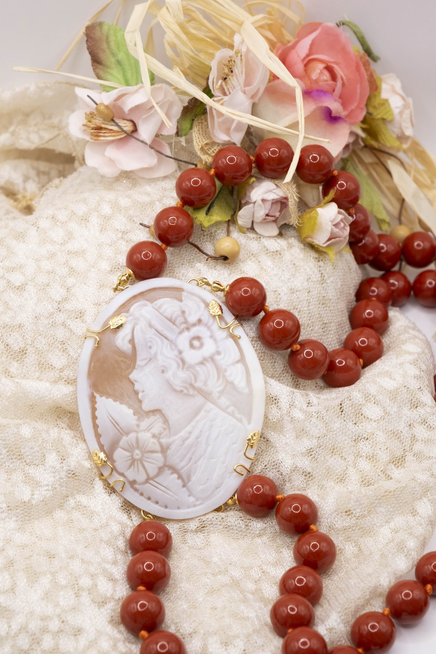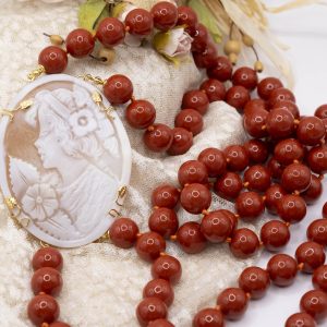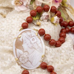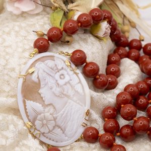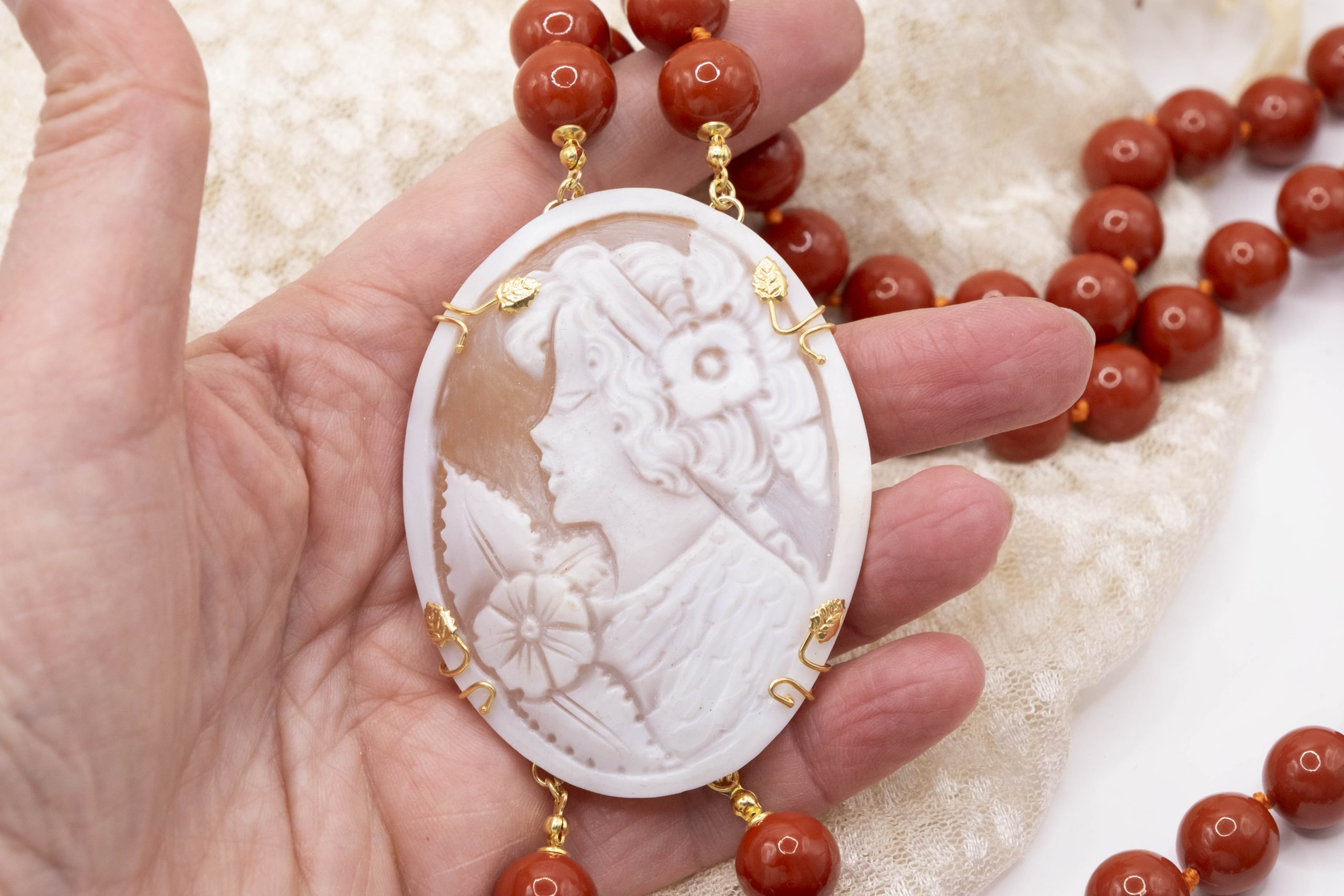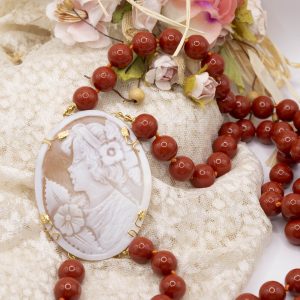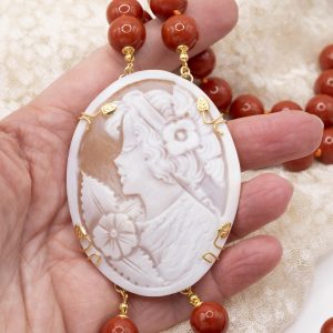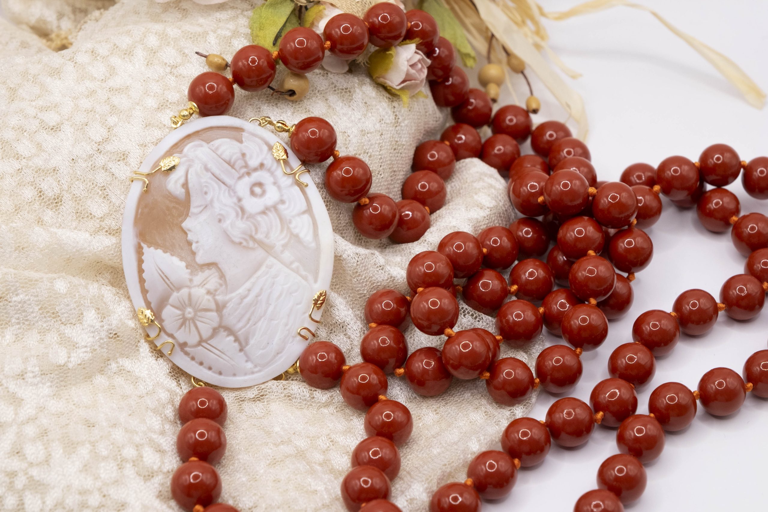 2-row necklace of 12mm red coral paste pearls and a large precious genuine cameo measuring 7 x 5.4cm, in a yellow gold plated 925 silver setting with leaf detail.