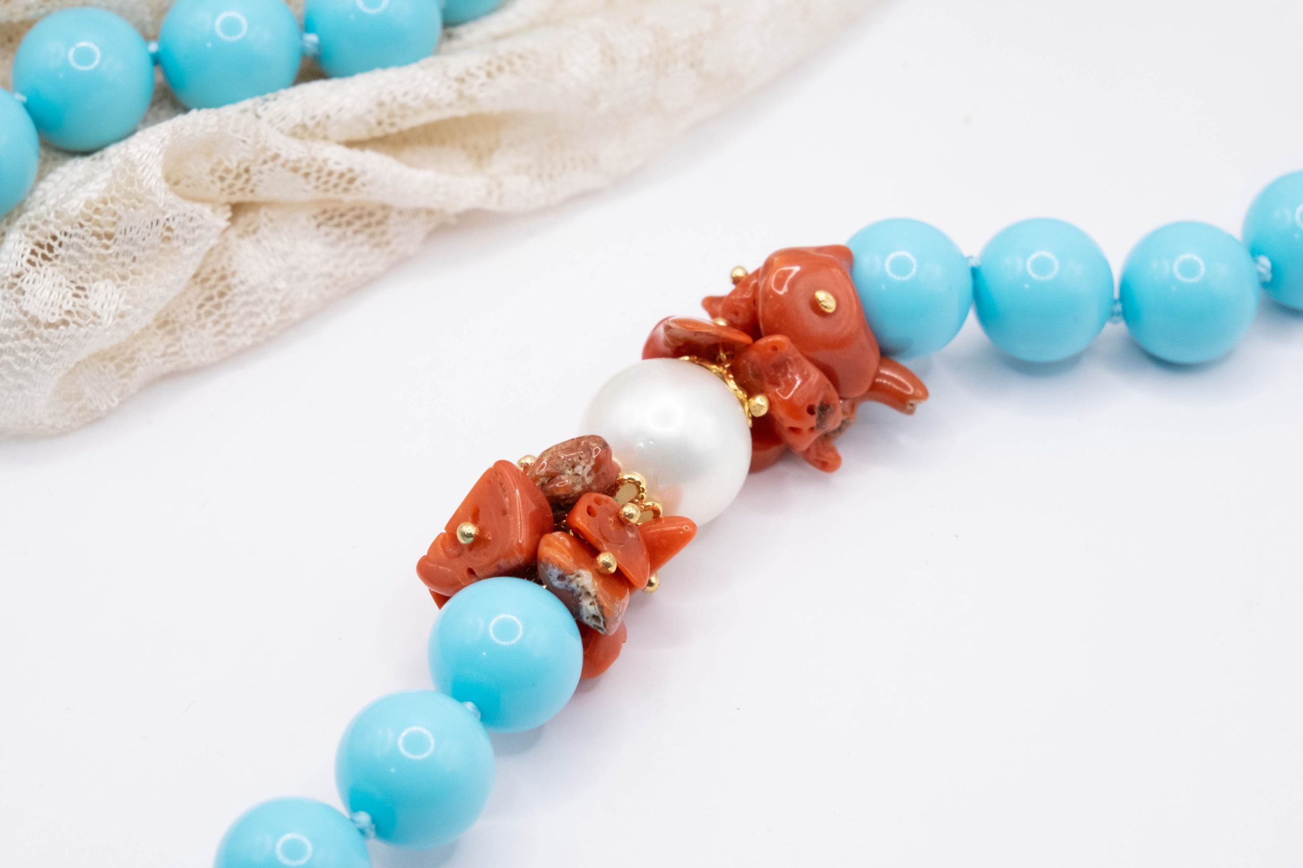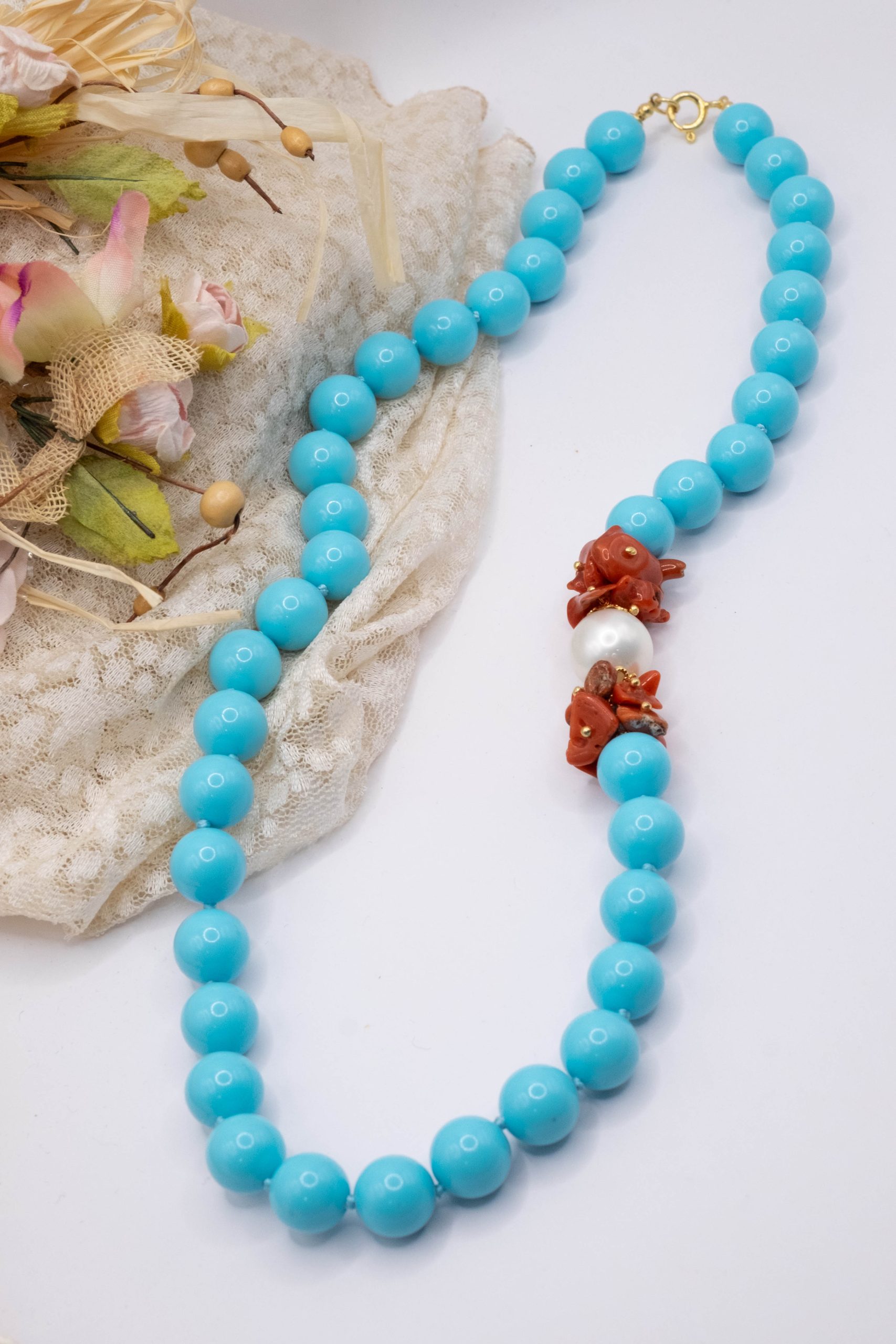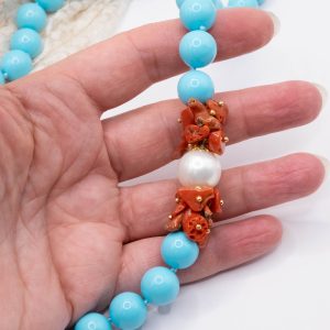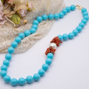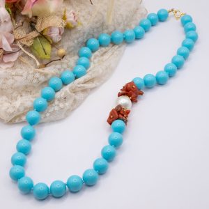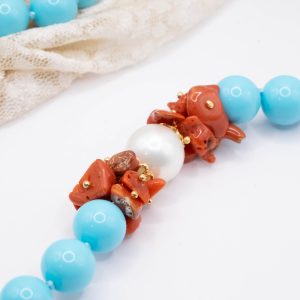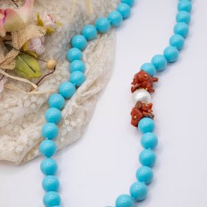 11mm turquoise paste necklace, with a side composed of natural red coral flakes from the raw Mediterranean, and a 13mm Majorca pearl