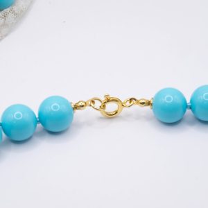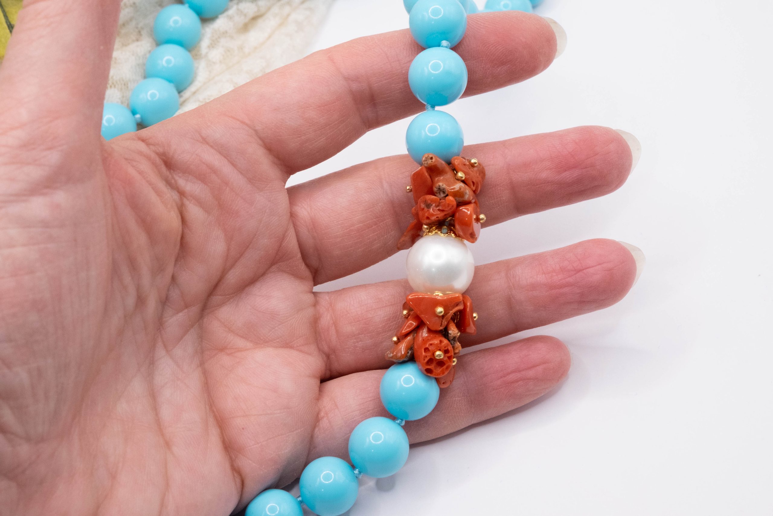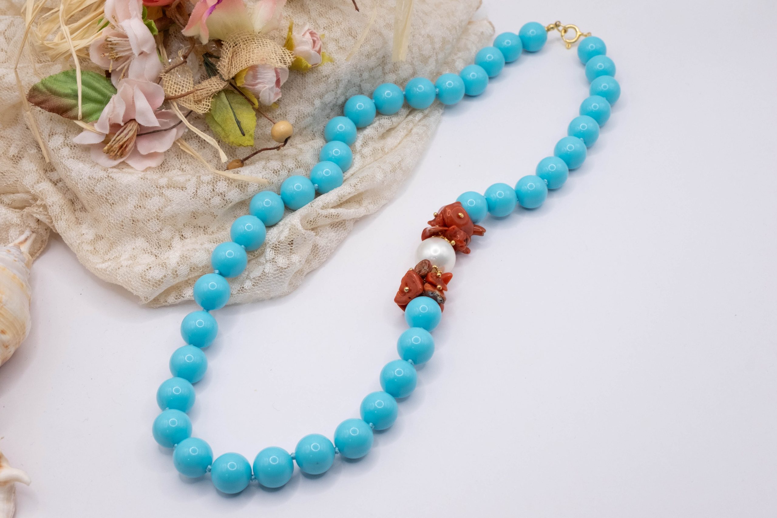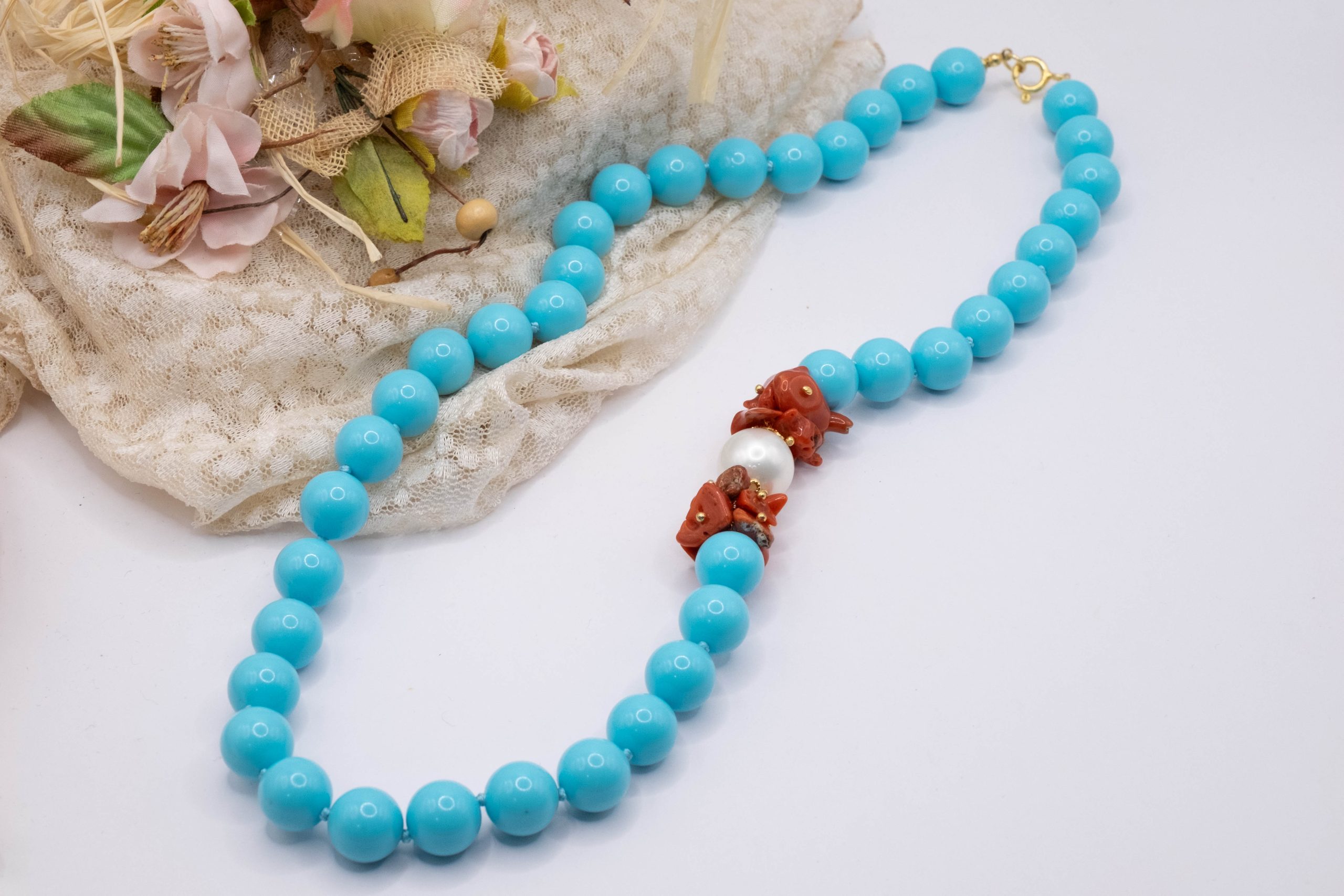 11mm turquoise paste necklace, with a side composed of natural red coral flakes from the raw Mediterranean, and a 13mm Majorca pearl