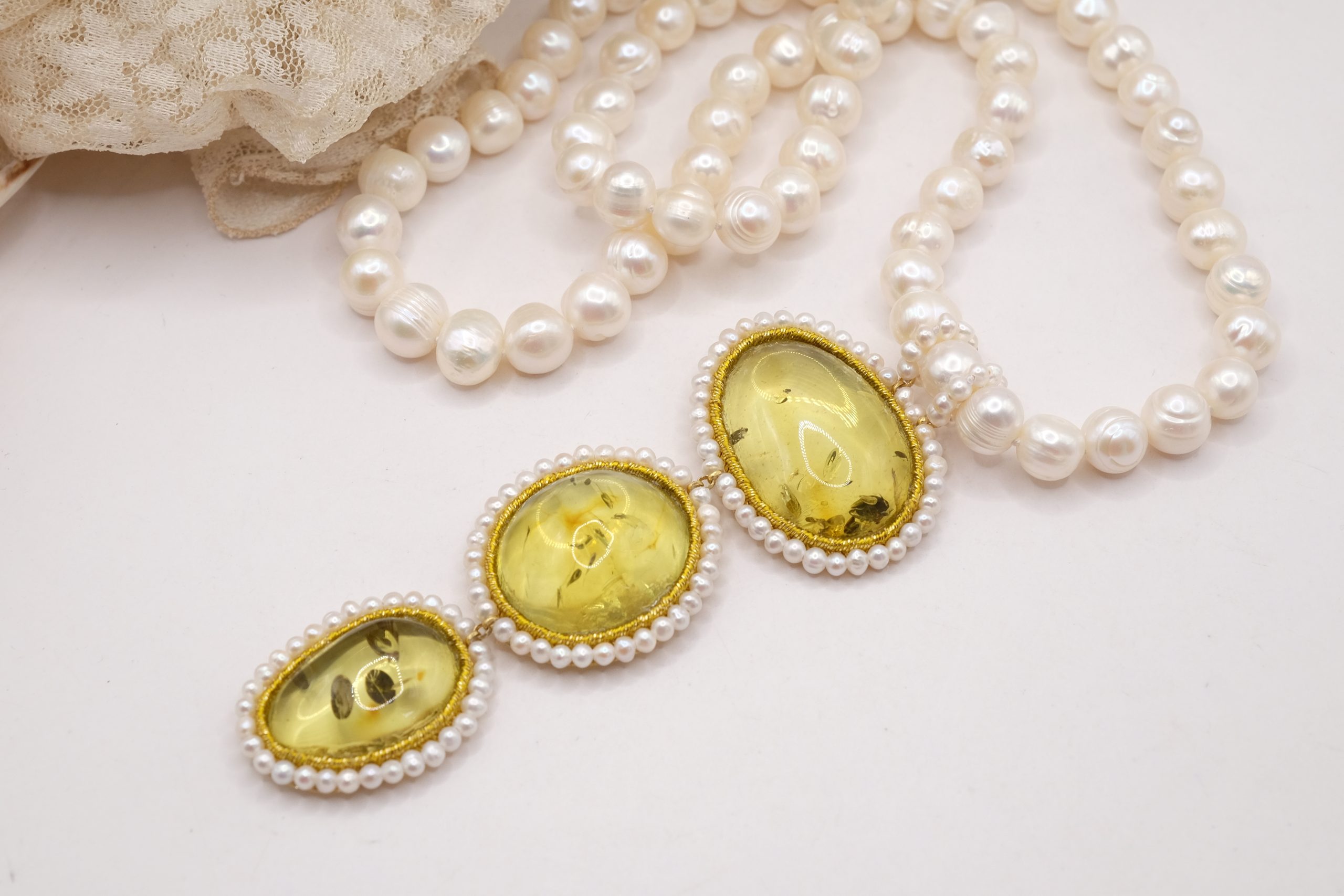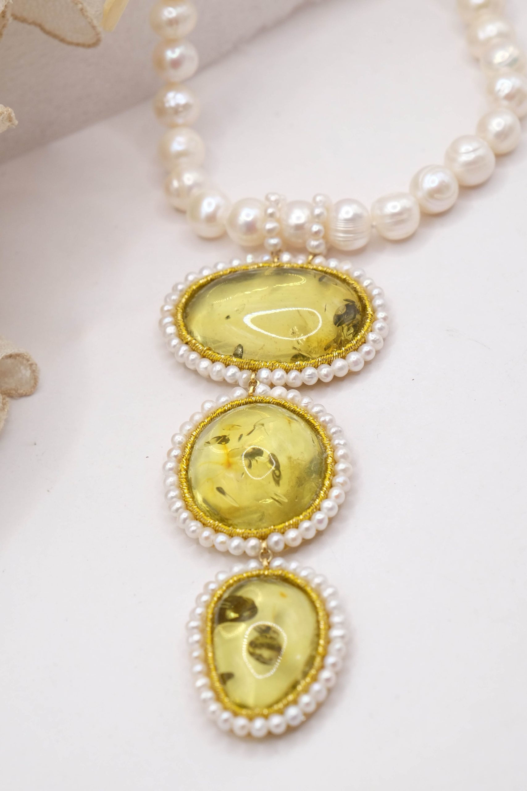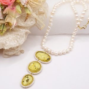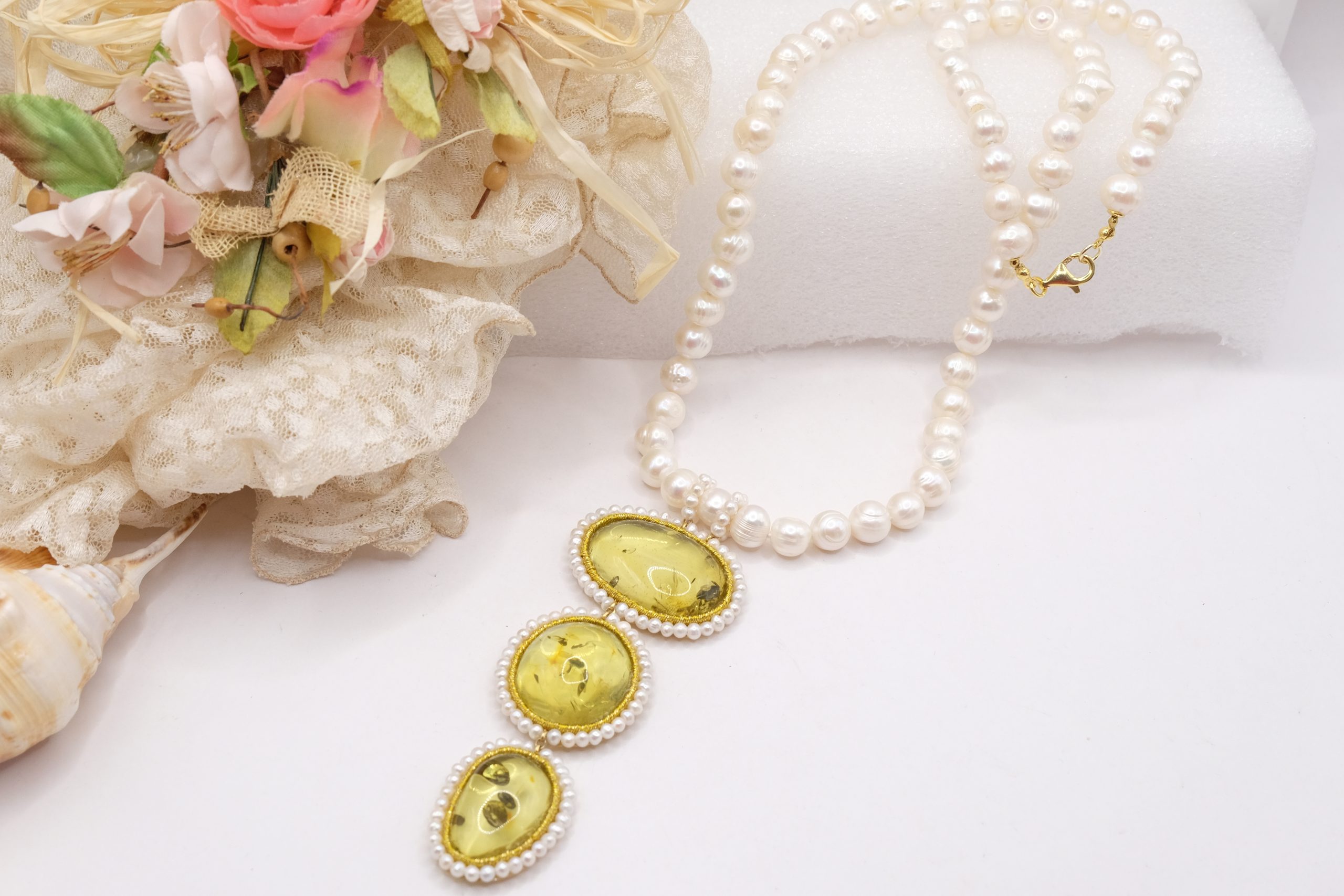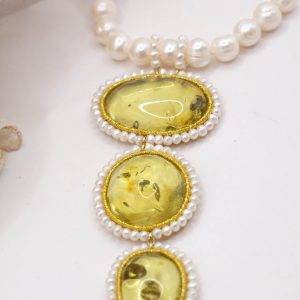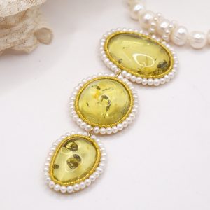 Material: Pearls, Green Baltic Amber, 925 gold-plated silver