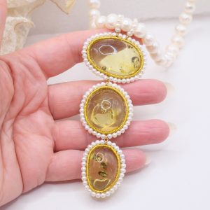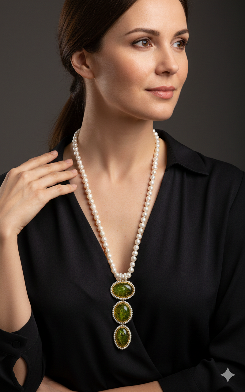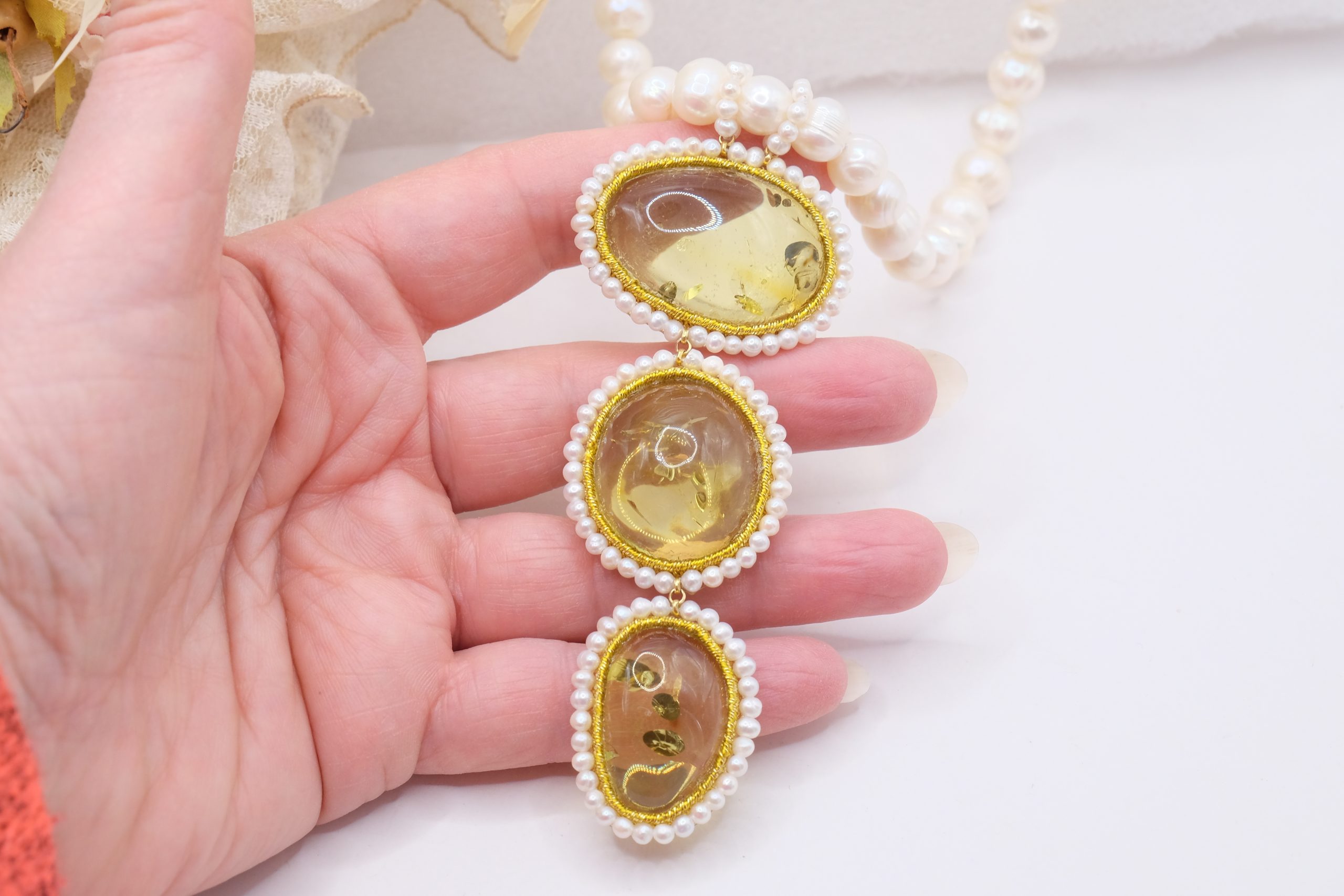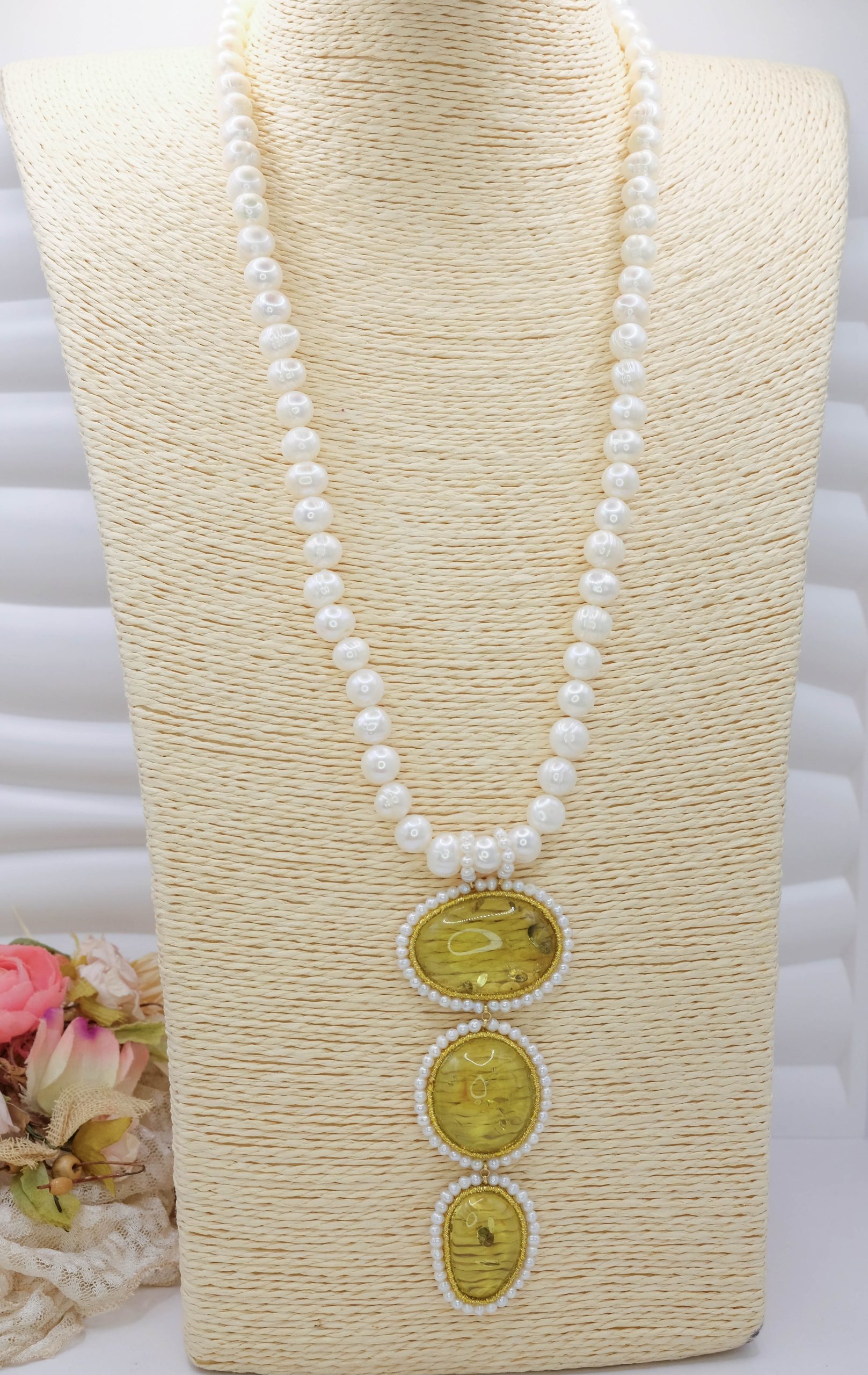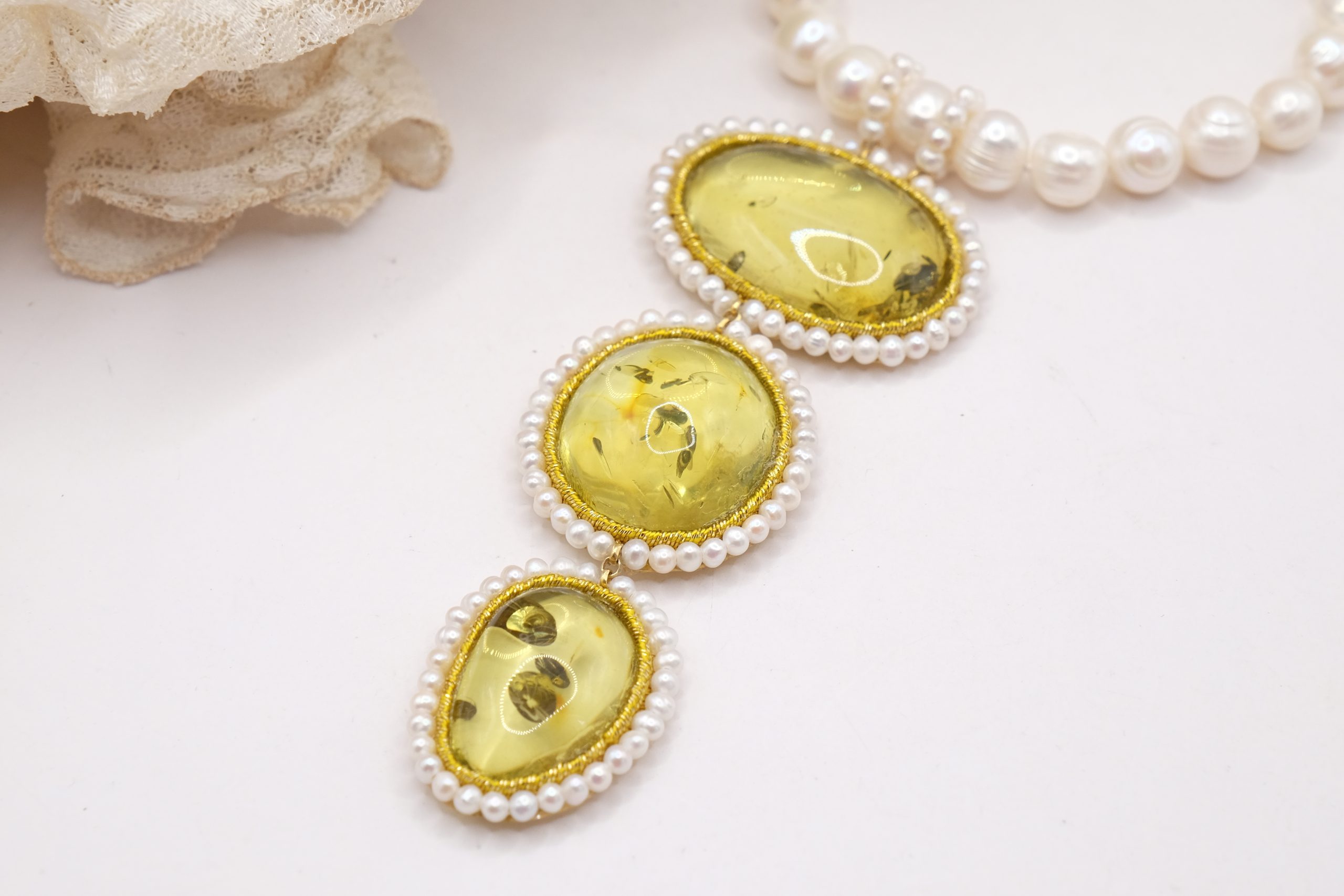 Material: Pearls, Green Baltic Amber, 925 gold-plated silver