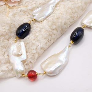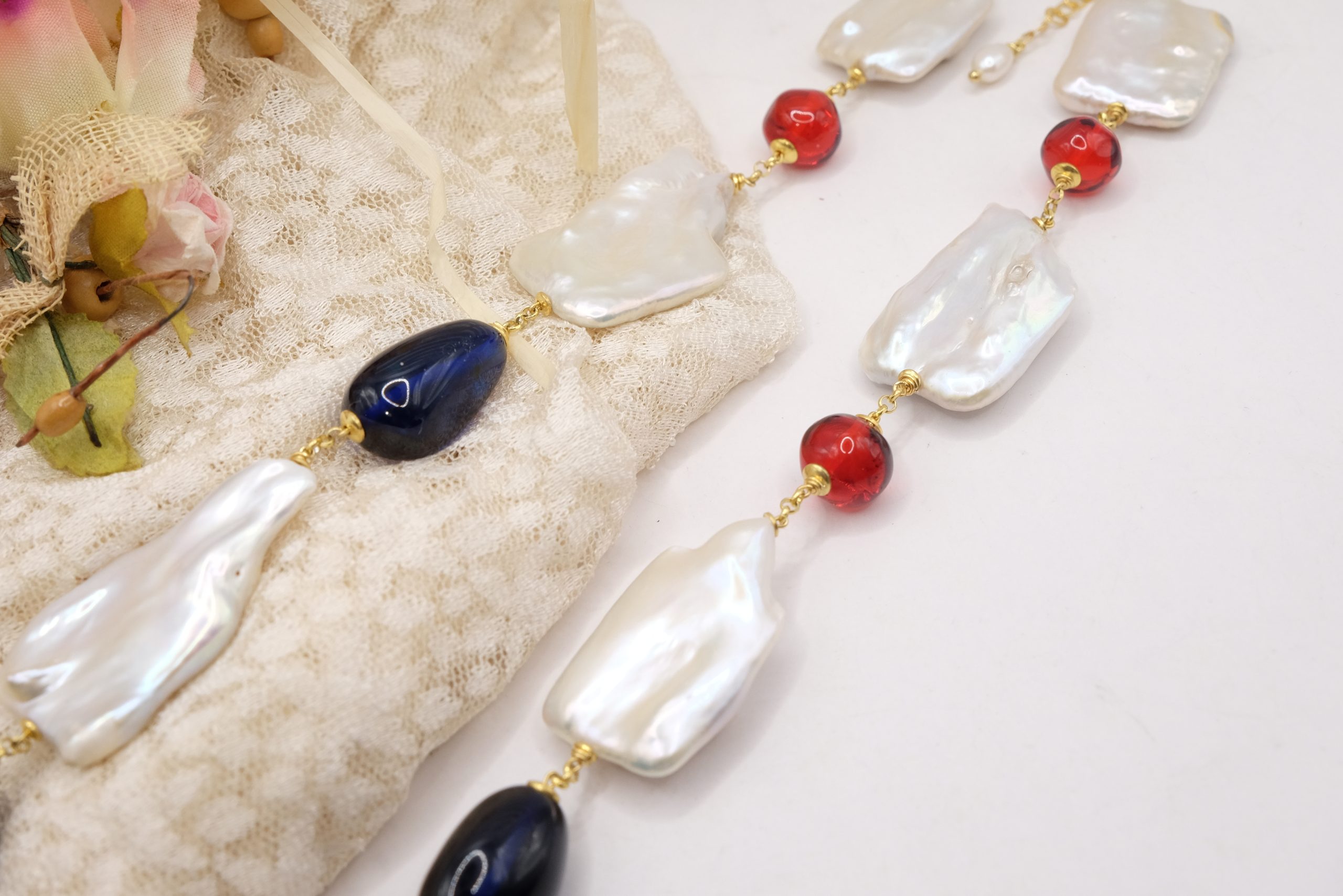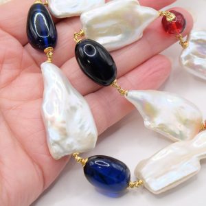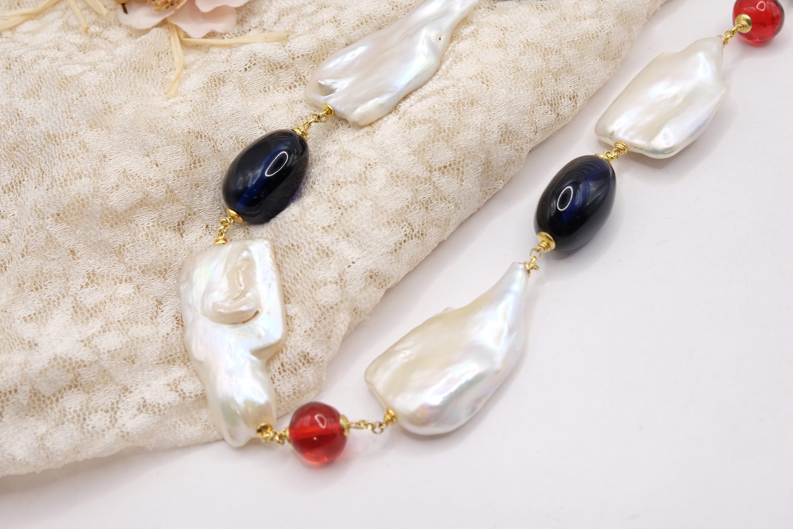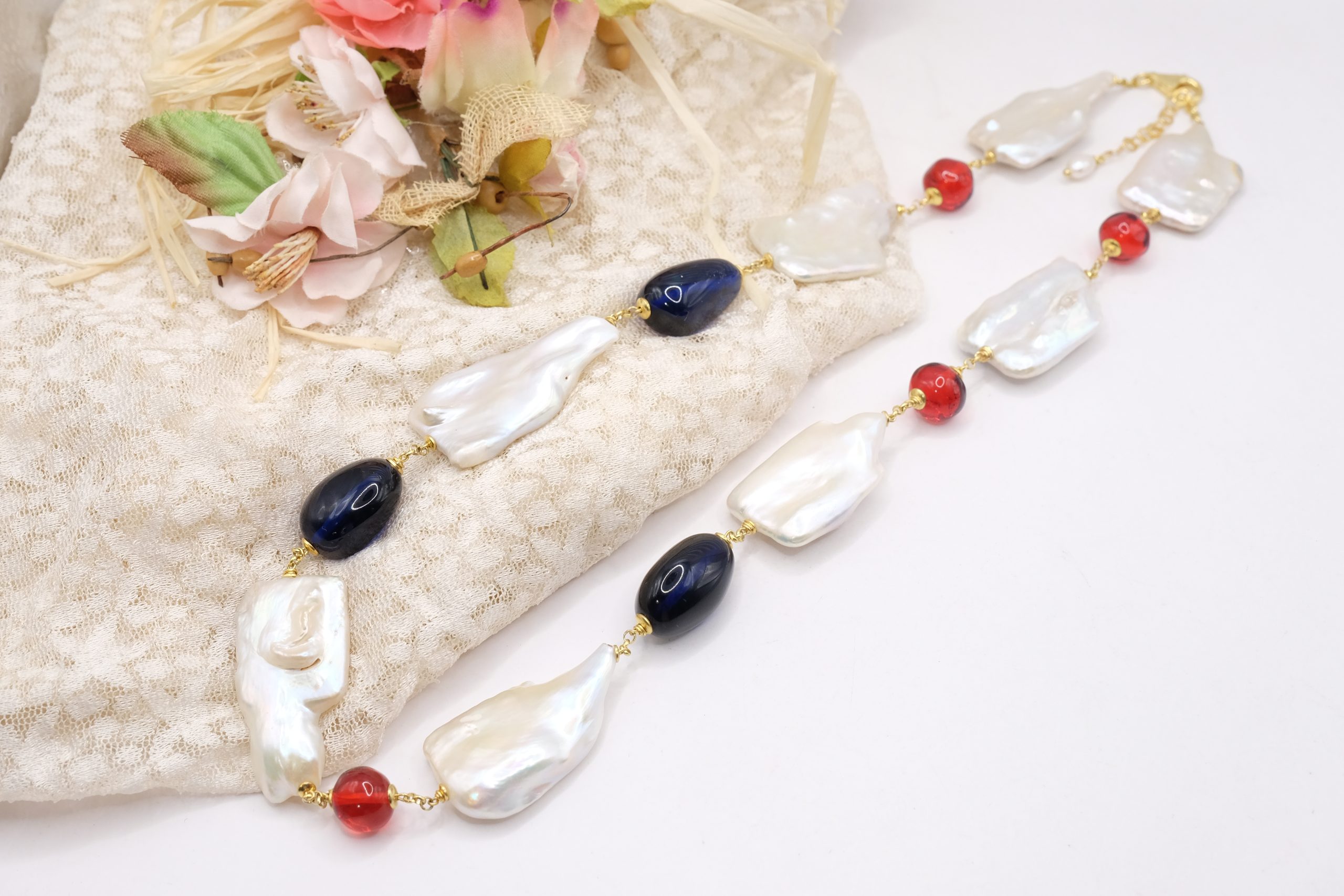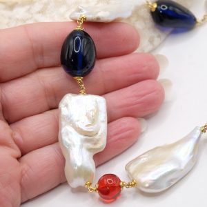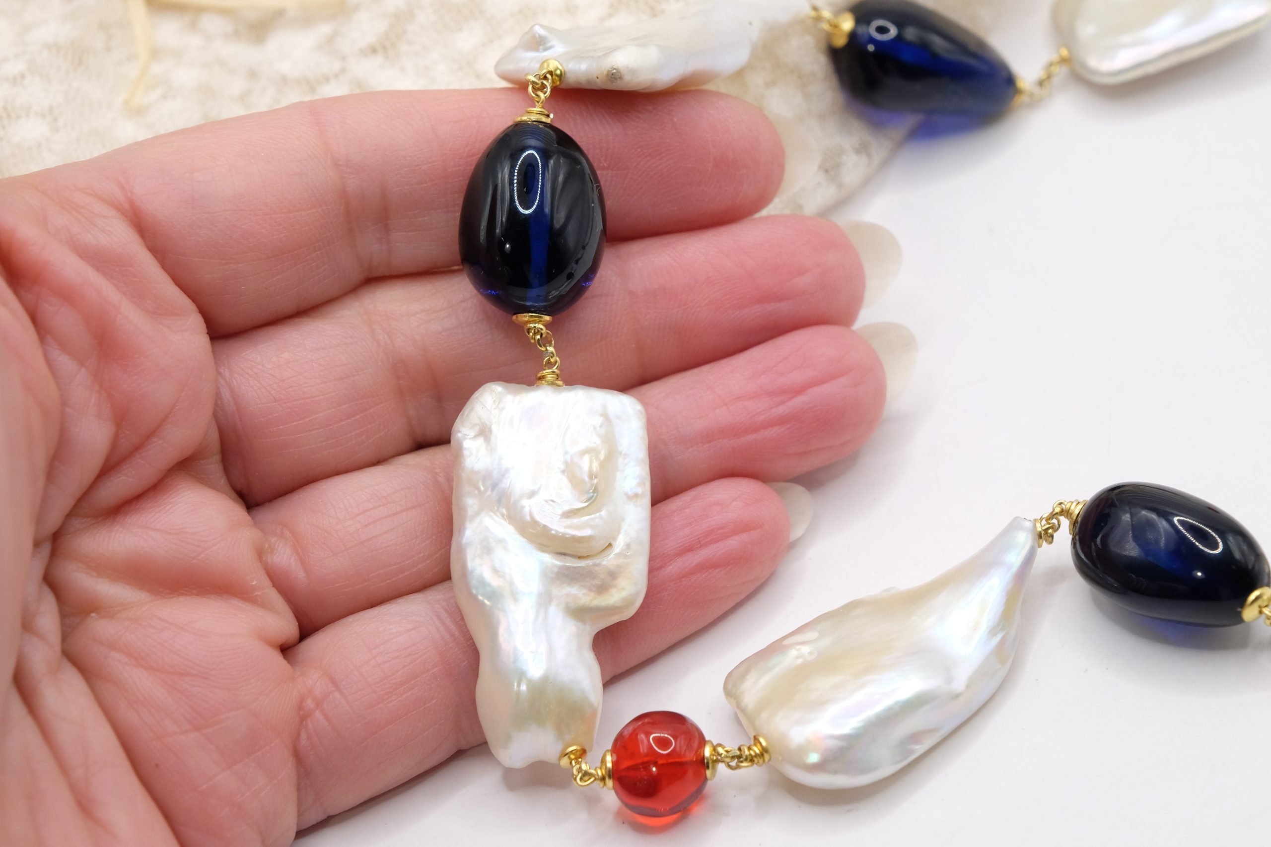 A luxurious and captivating necklace featuring large, luminous white baroque pearls and seven stunning red and blue Dominican ambers. Finished in gold-plated 925 silver.