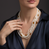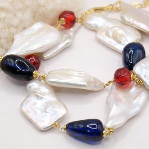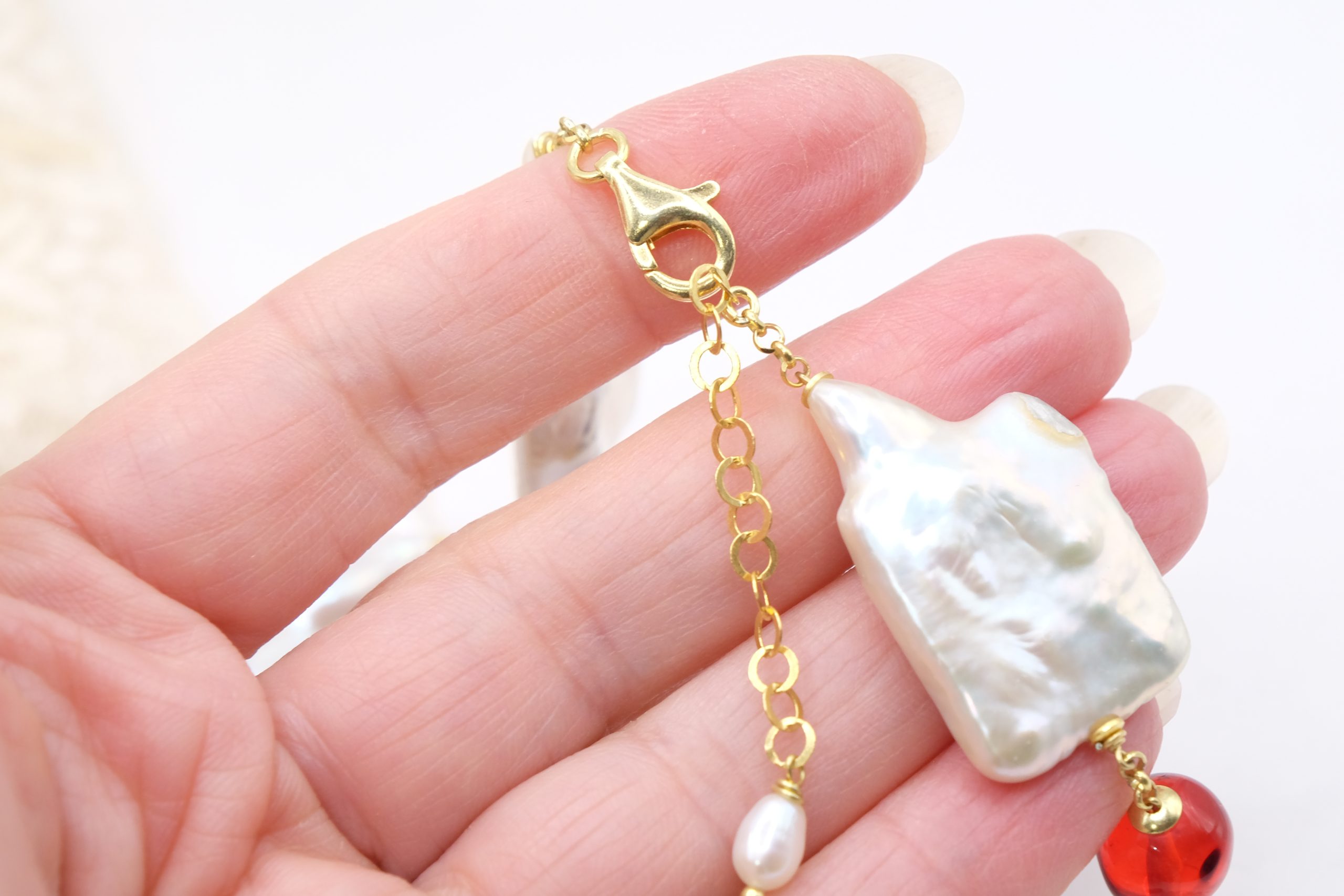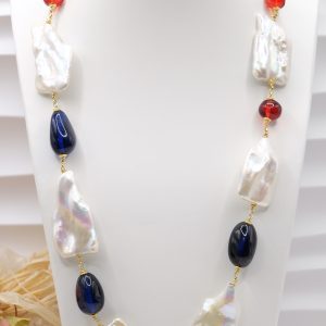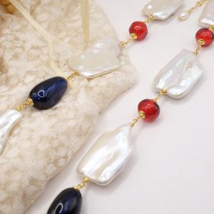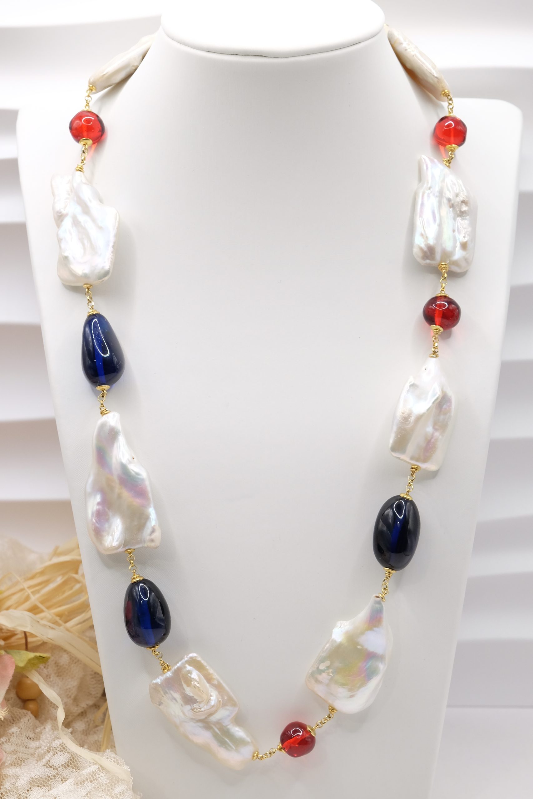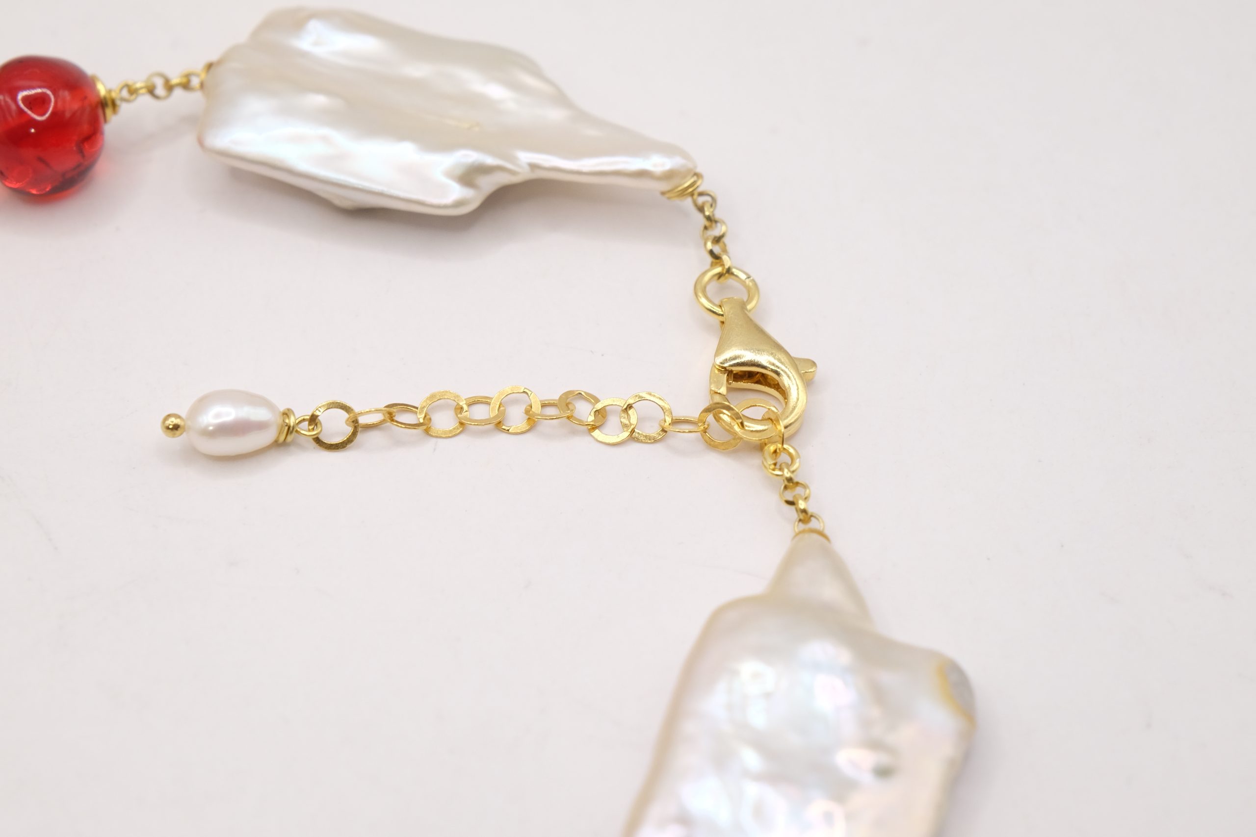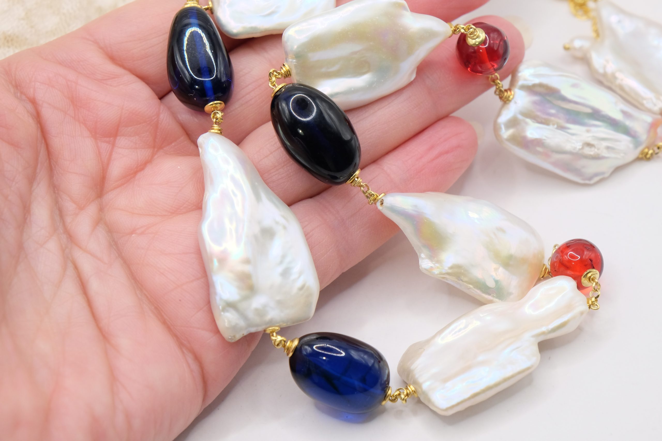 A luxurious and captivating necklace featuring large, luminous white baroque pearls and seven stunning red and blue Dominican ambers. Finished in gold-plated 925 silver.