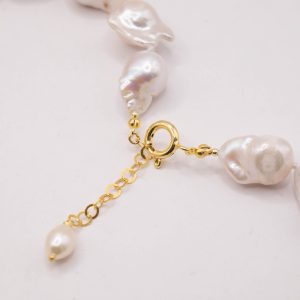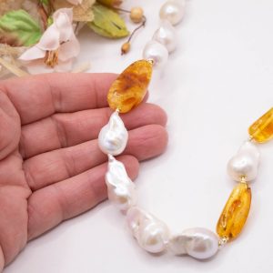 Add a touch of elegance and charm to your look with this elegant necklace featuring bright, large white baroque pearls and large stones of superb Baltic amber. The finishes are gold-plated 925 silver.
