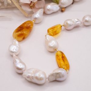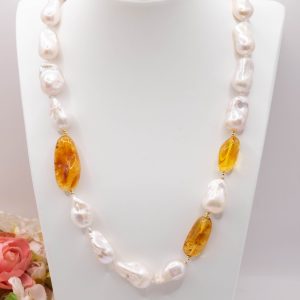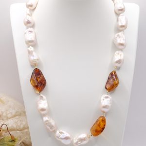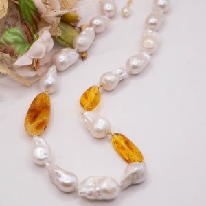 Natural Baroque Pearl Necklace with Honey Baltic Amber and 925 Silver