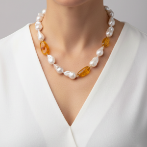Natural Baroque Pearl Necklace with Honey Baltic Amber and 925 Silver