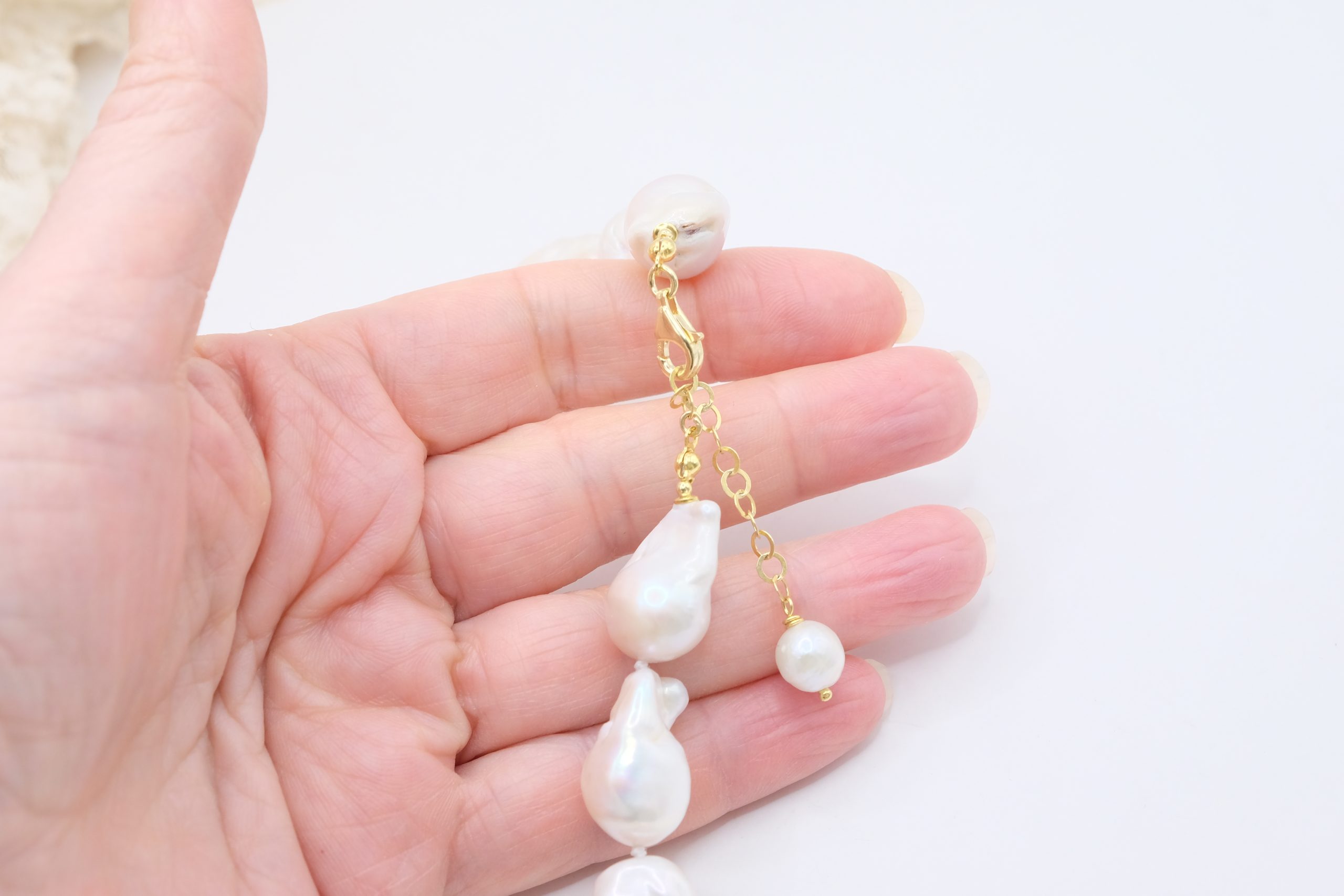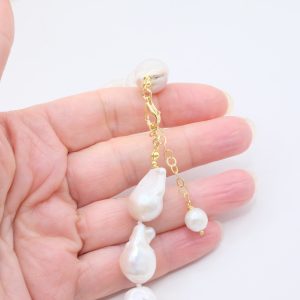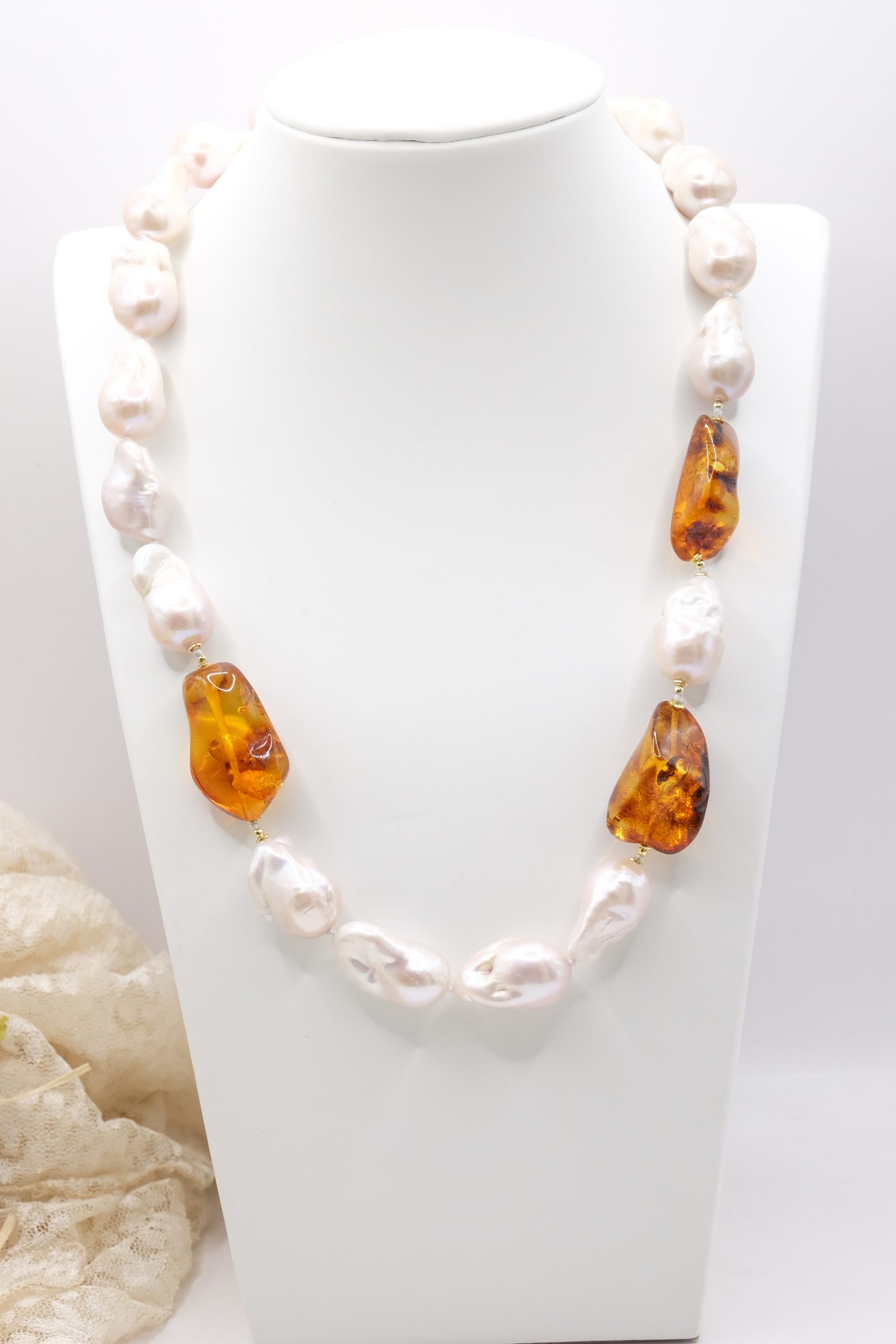 Add a touch of elegance and charm to your look with this elegant handmade necklace, featuring bright, large white baroque pearls and three large spools of exquisite Baltic amber. The finishes are gold-plated 925 silver.