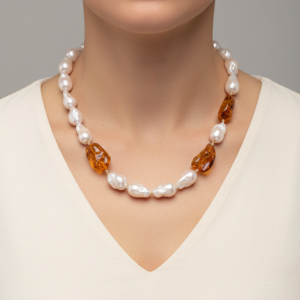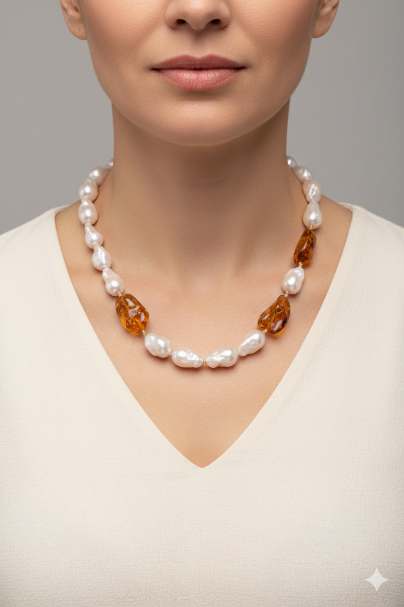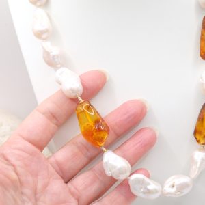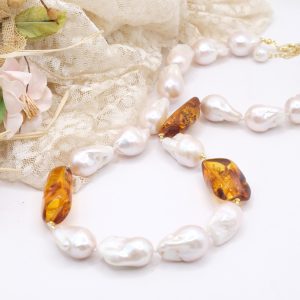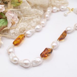 Natural Baroque Pearl Necklace with Baltic Amber and 925 Silver