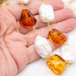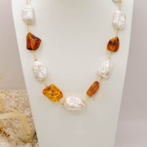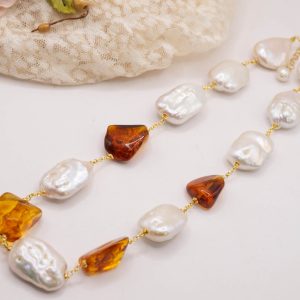 Natural Baroque Pearl Necklace with Baltic Amber and 925 Silver