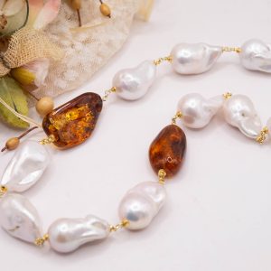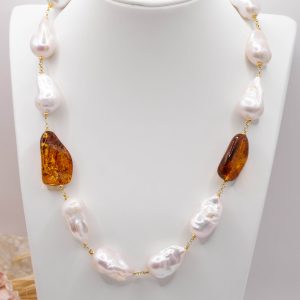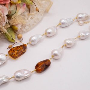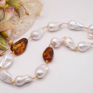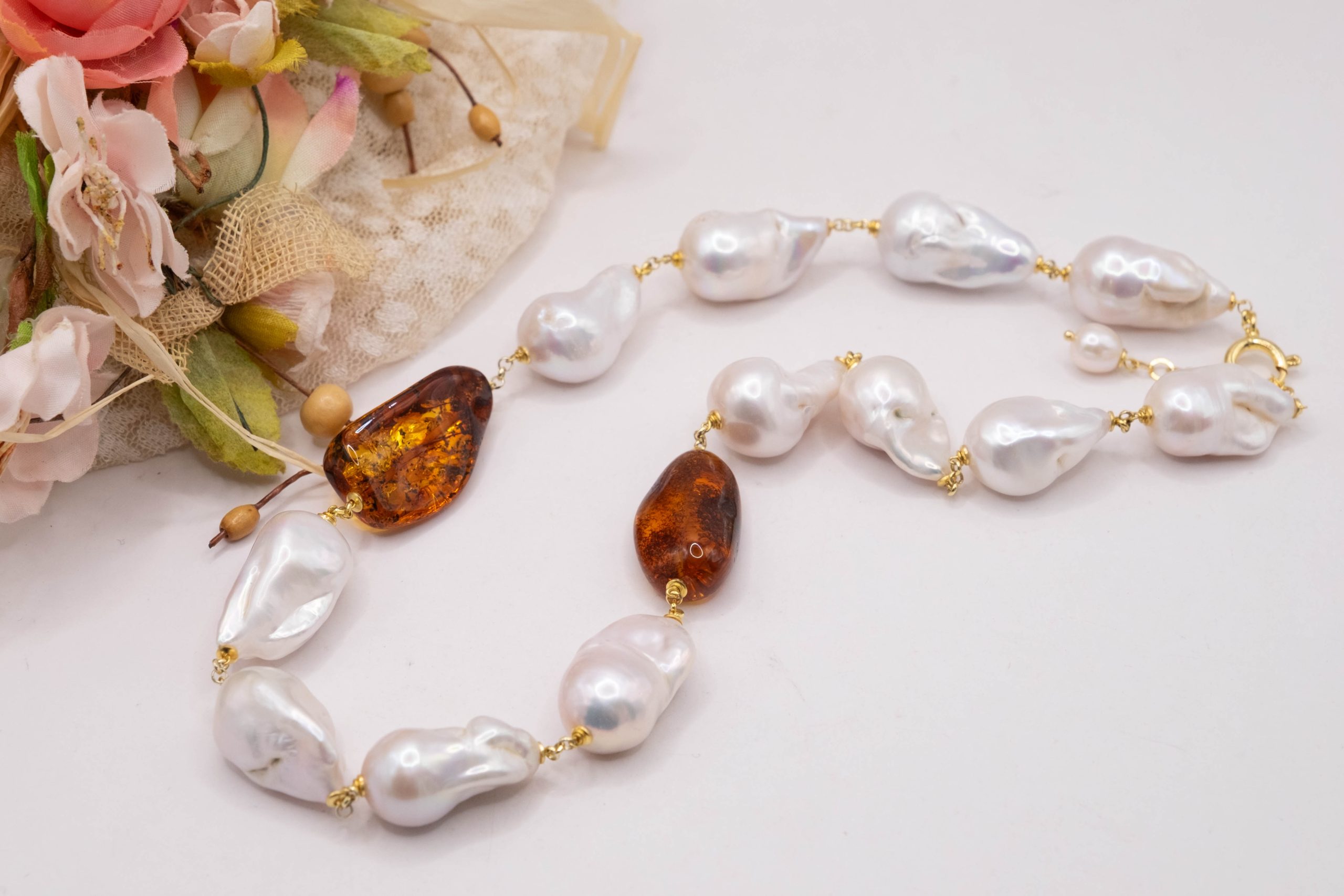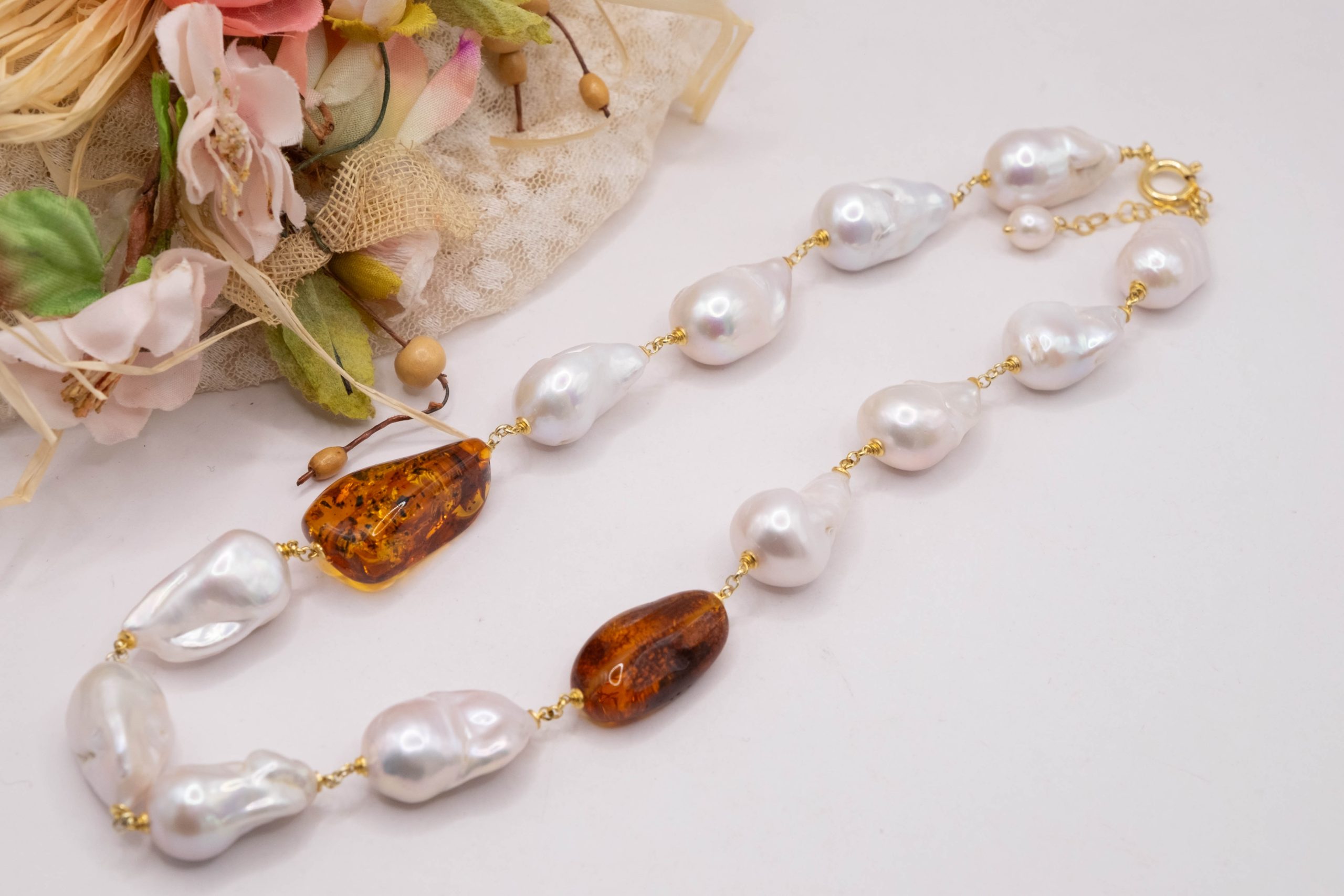 Natural Baroque Pearl Necklace with Baltic Amber and 925 Silver