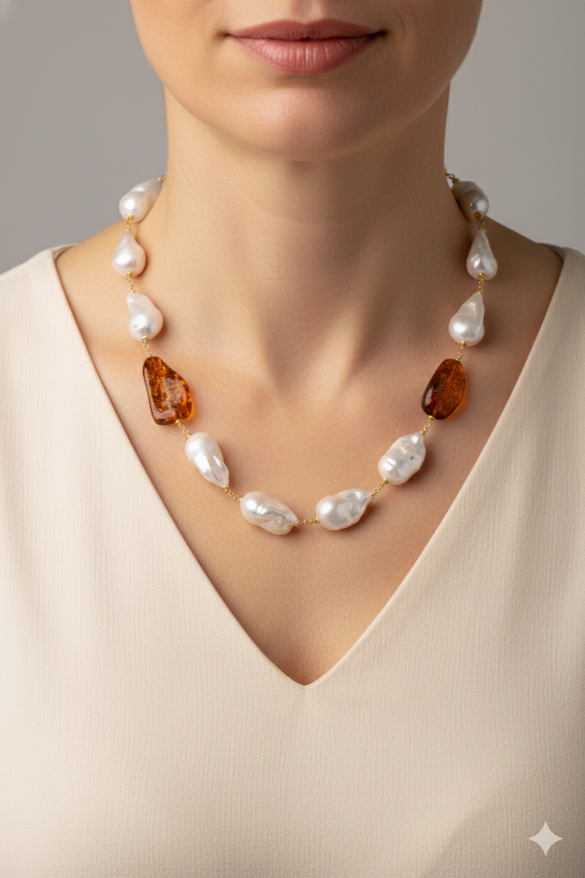 ✨ Baroque Natural Pearl & Baltic Amber Necklace in Gold-Plated 925 Silver