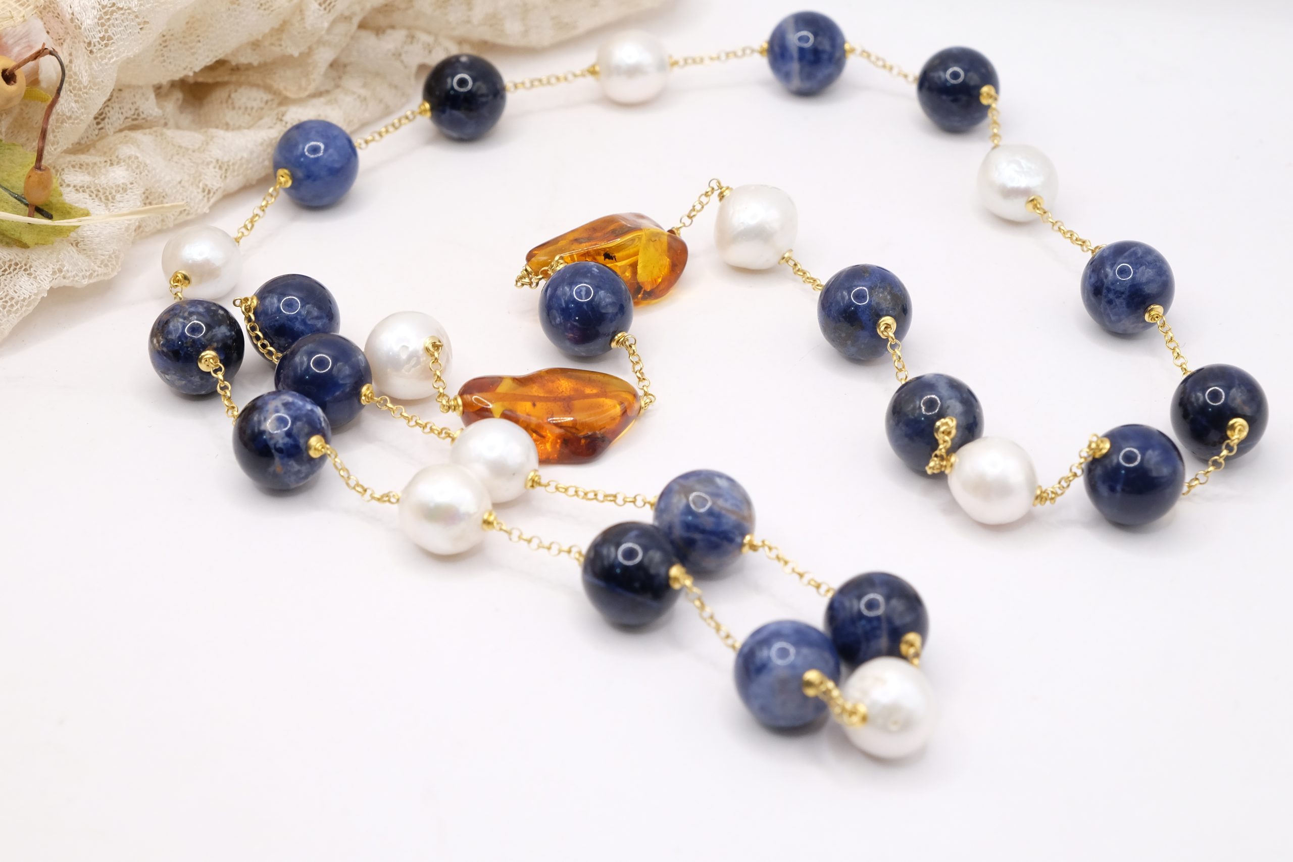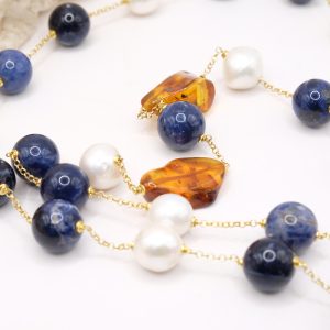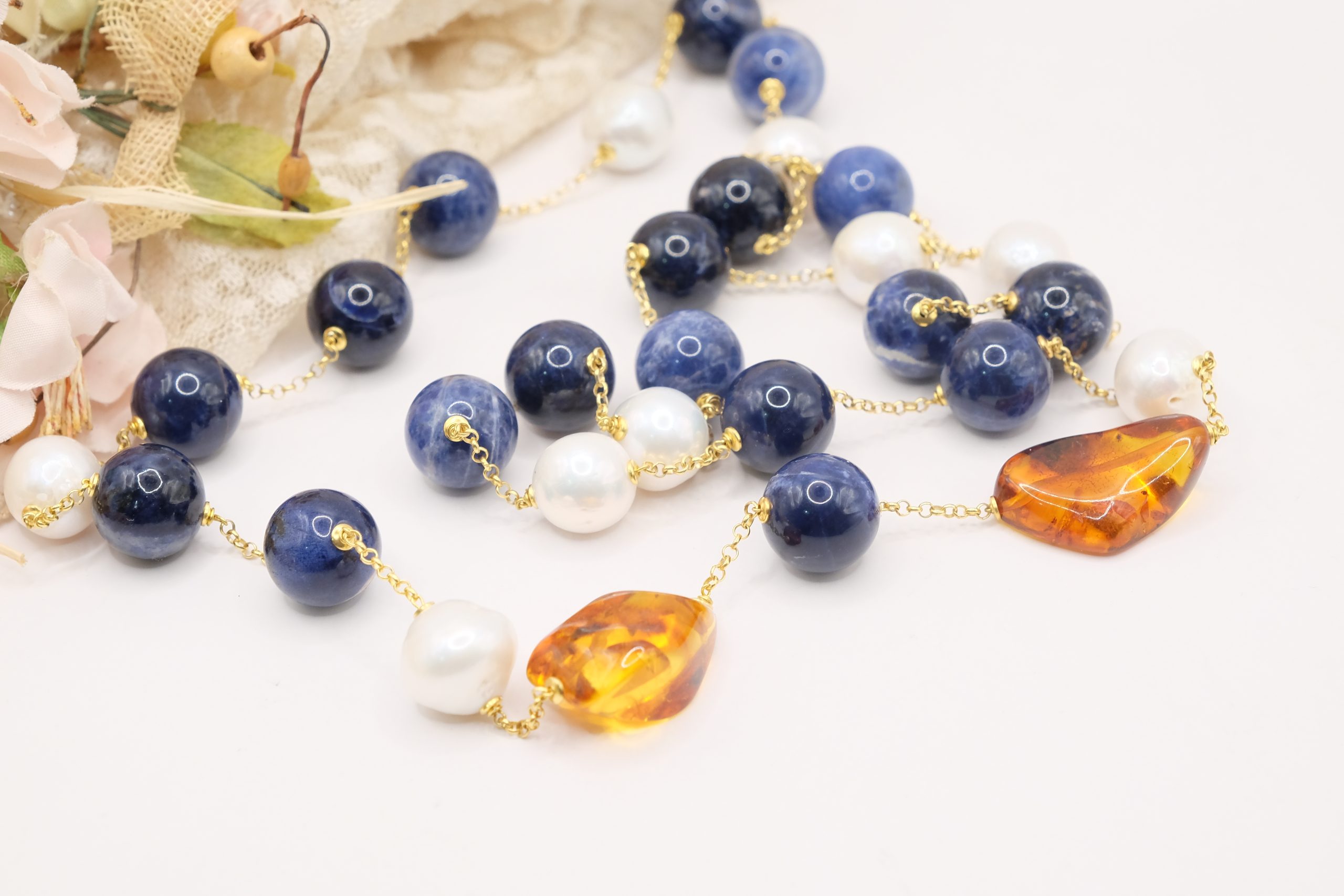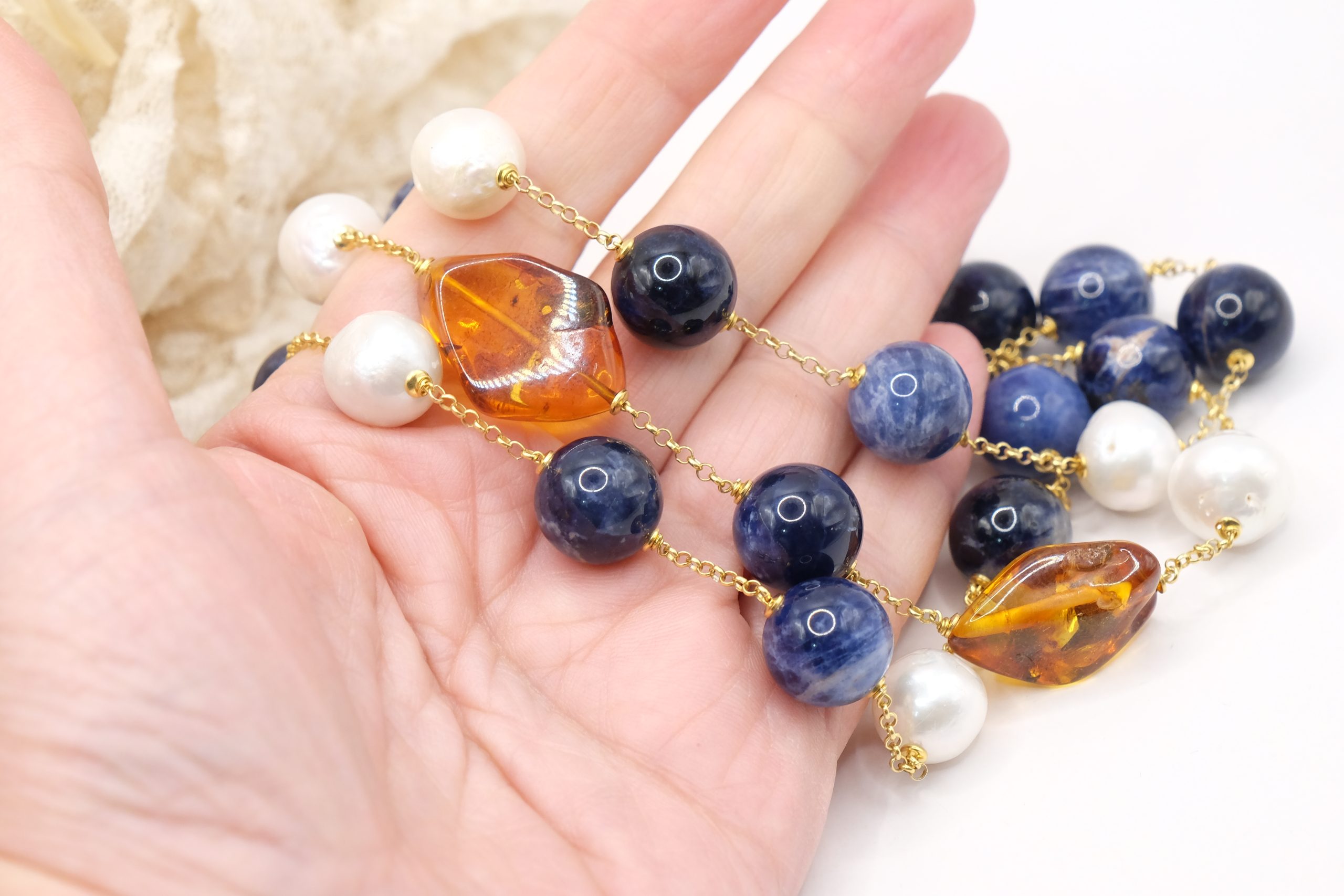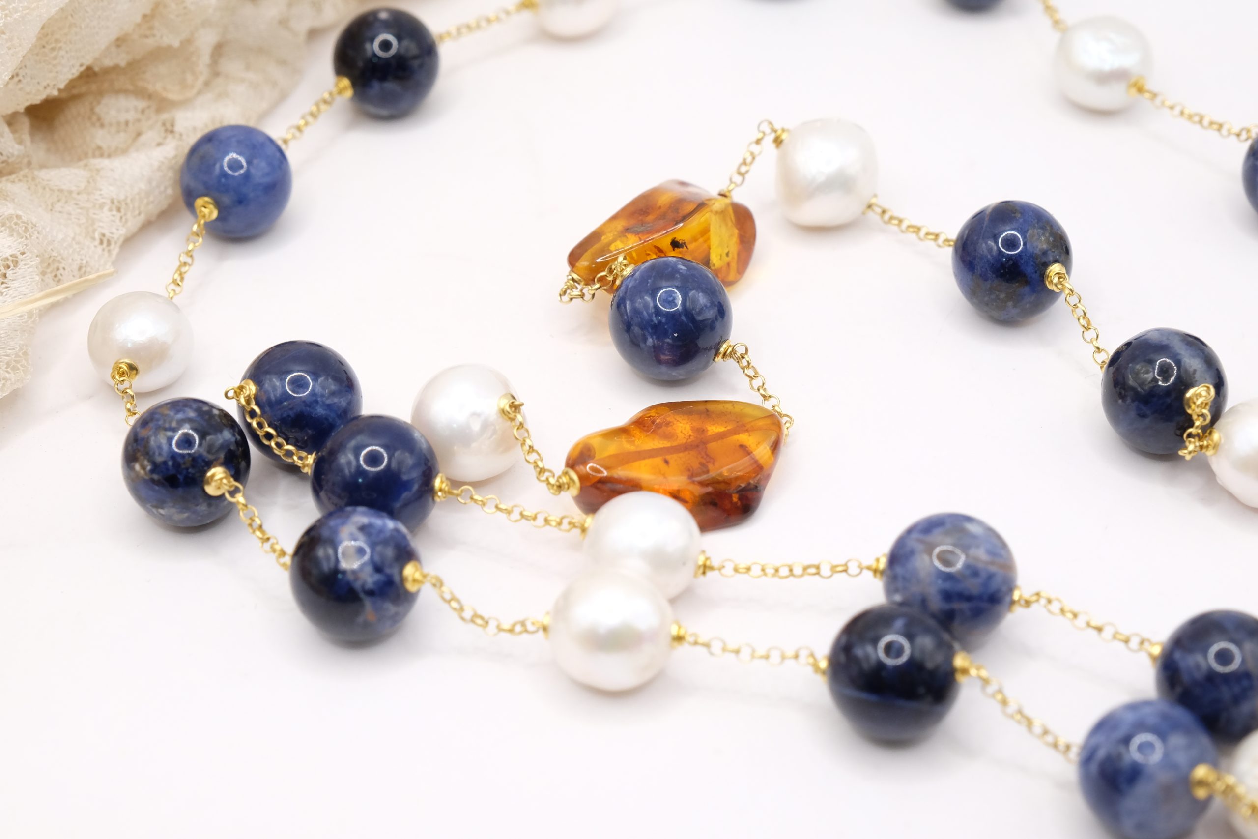 Material: Natural Pearls, Baltic Amber, Lapis, Gold-plated 925 Silver