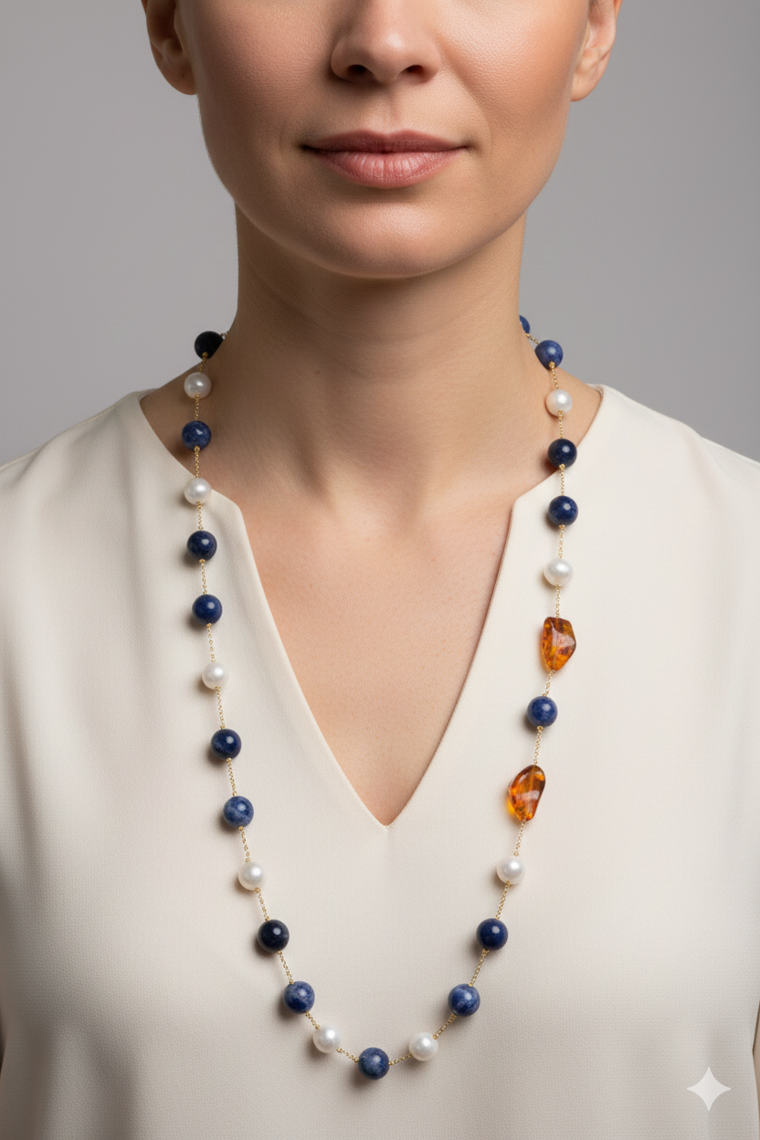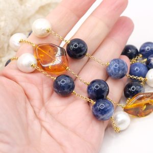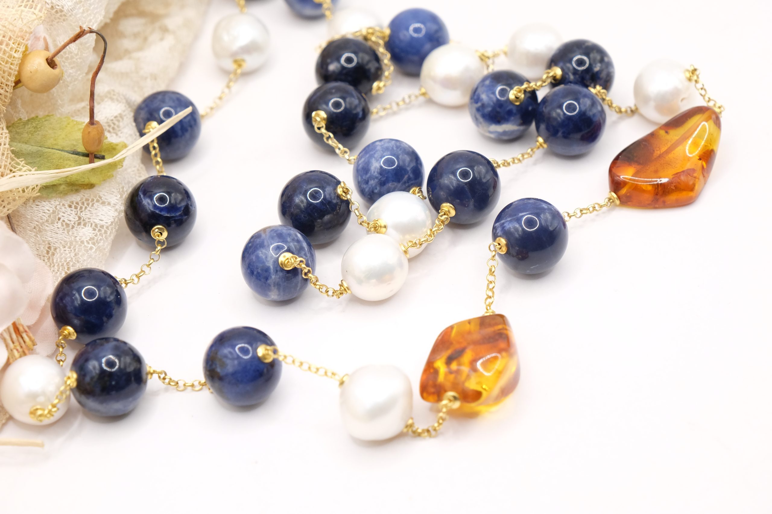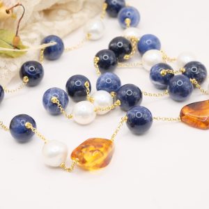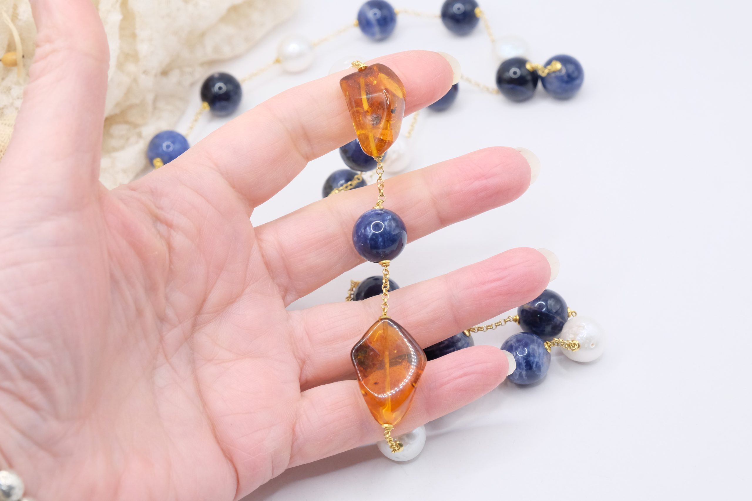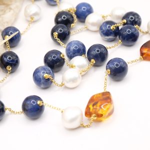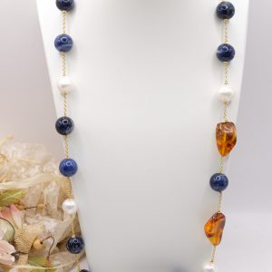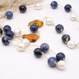 Material: Natural Pearls, Baltic Amber, Lapis, Gold-plated 925 Silver