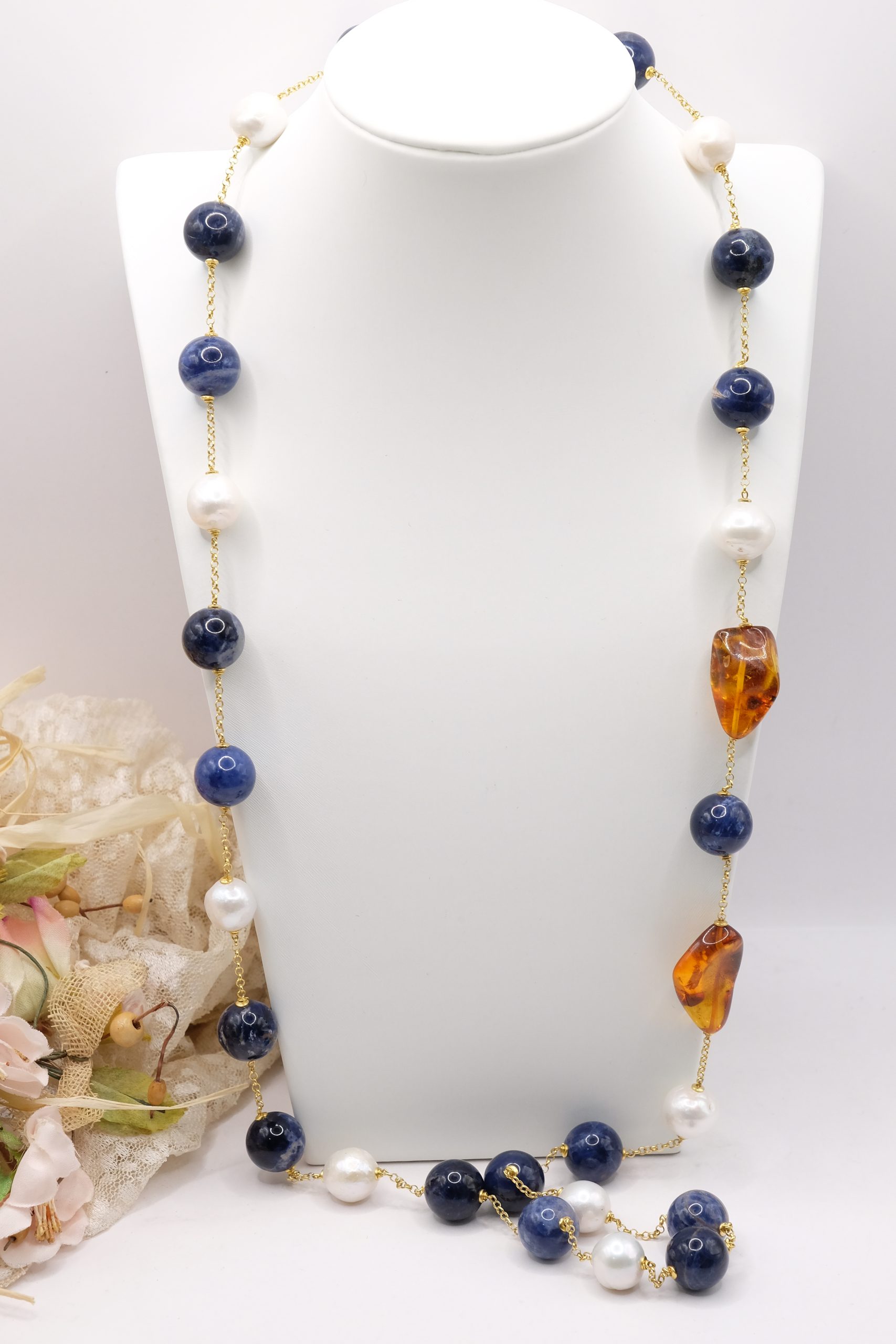 A luxurious necklace with a classic and timeless appeal, featuring large, luminous white baroque lapis lazuli pearls and superb Baltic amber stones. Finished in gold-plated 925 silver.