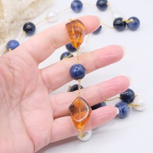 Natural Baroque Pearl Necklace with Amber and Lapis in 925 Silver