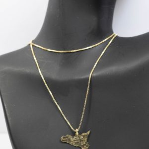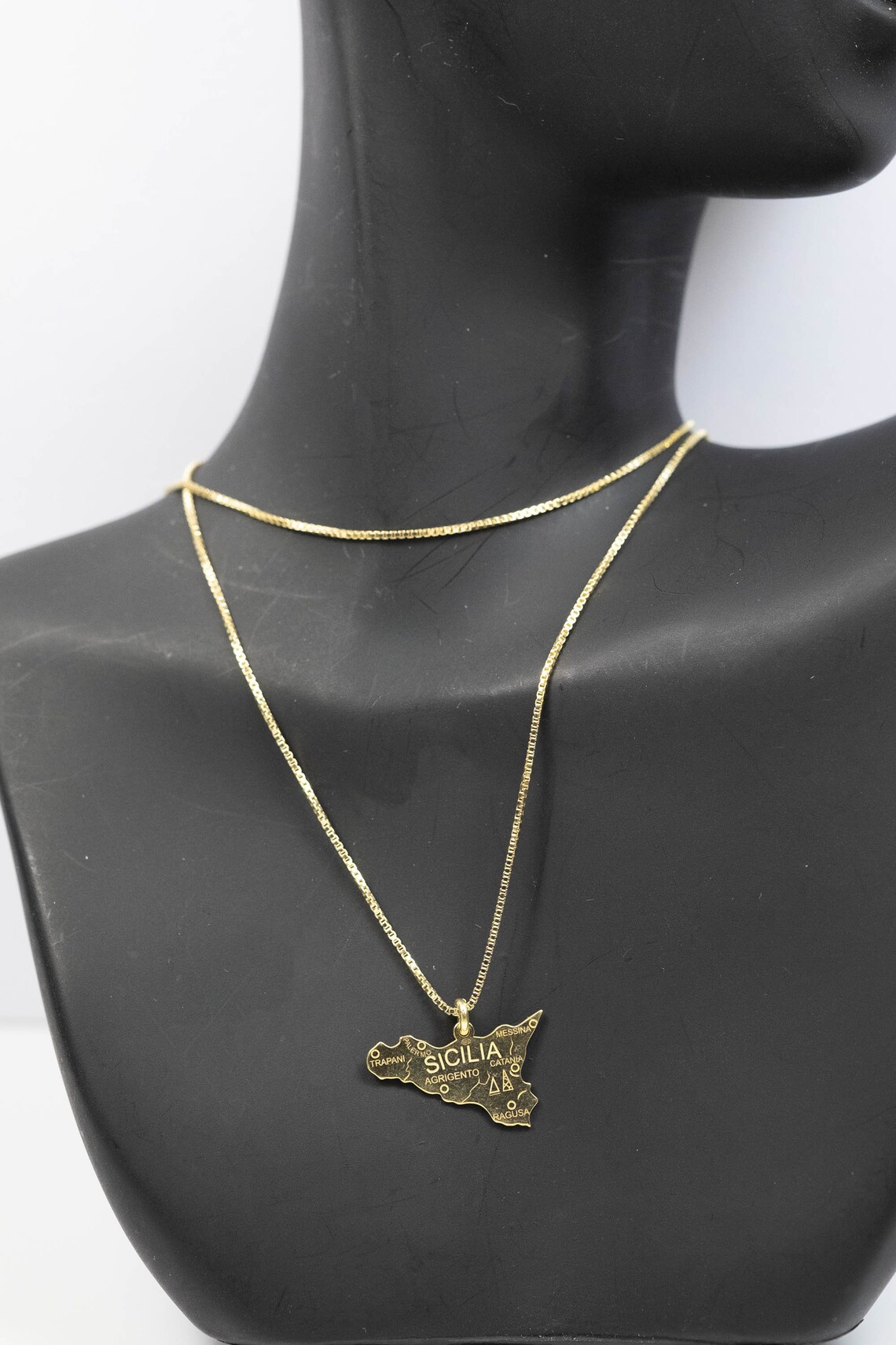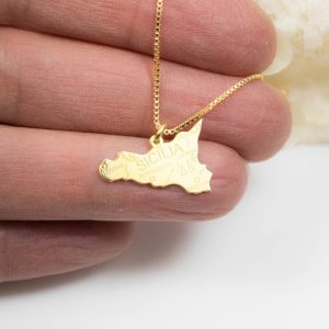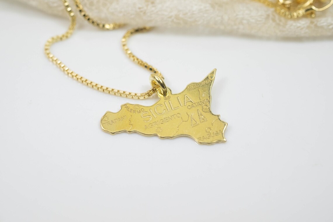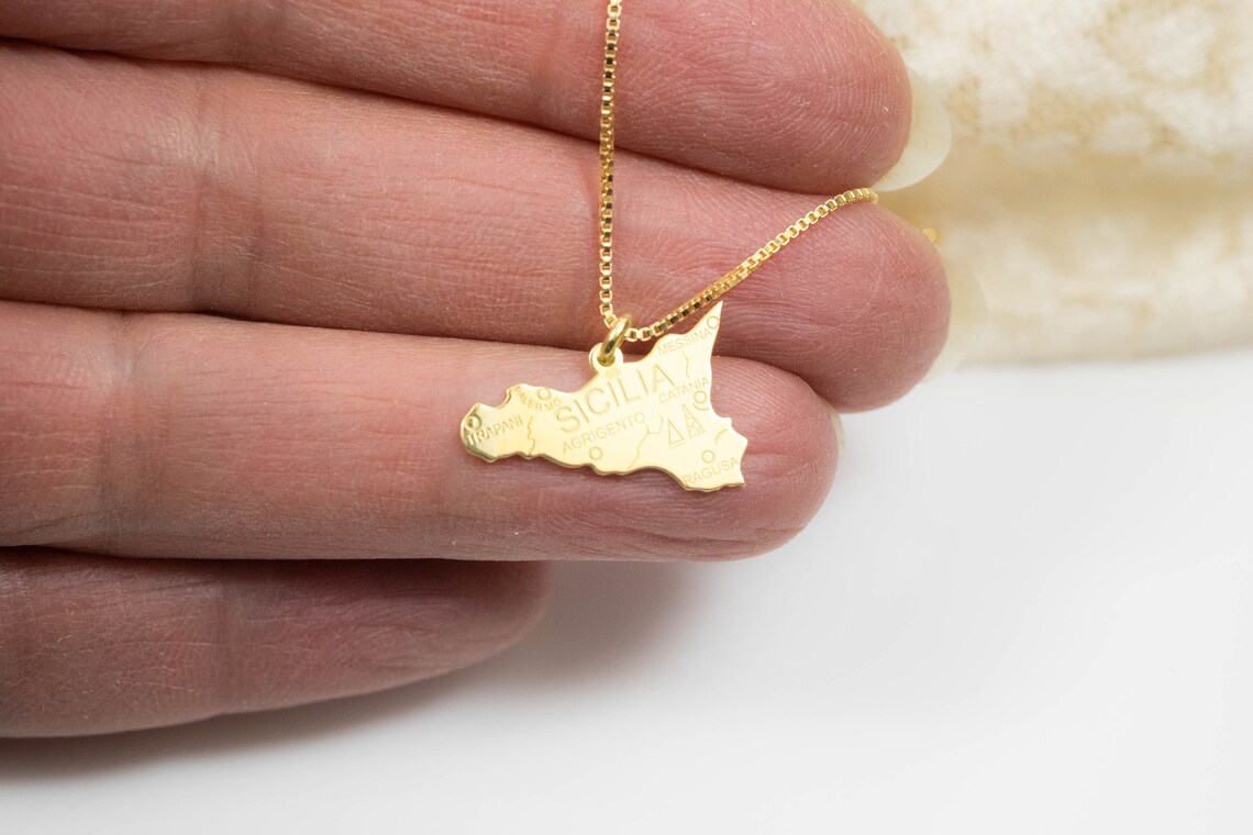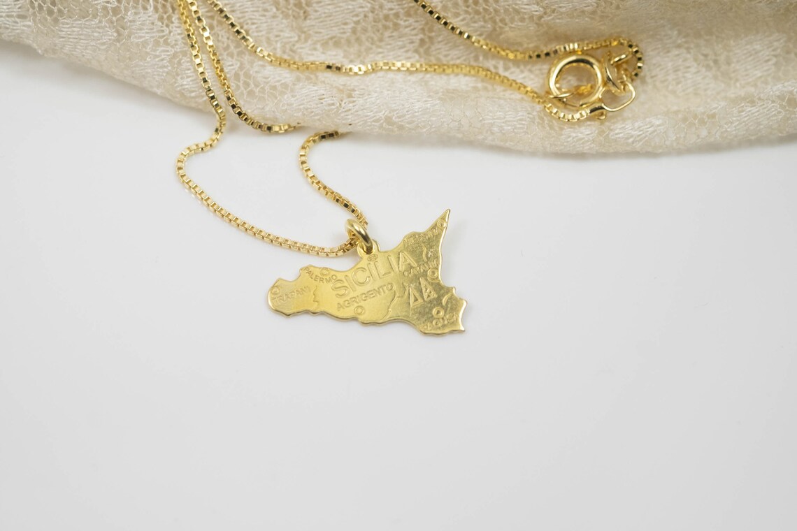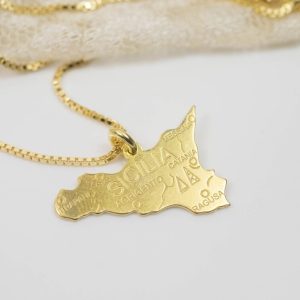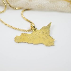 Gold-plated 925 silver necklace with Sicily-shaped pendant engraved with several provinces.