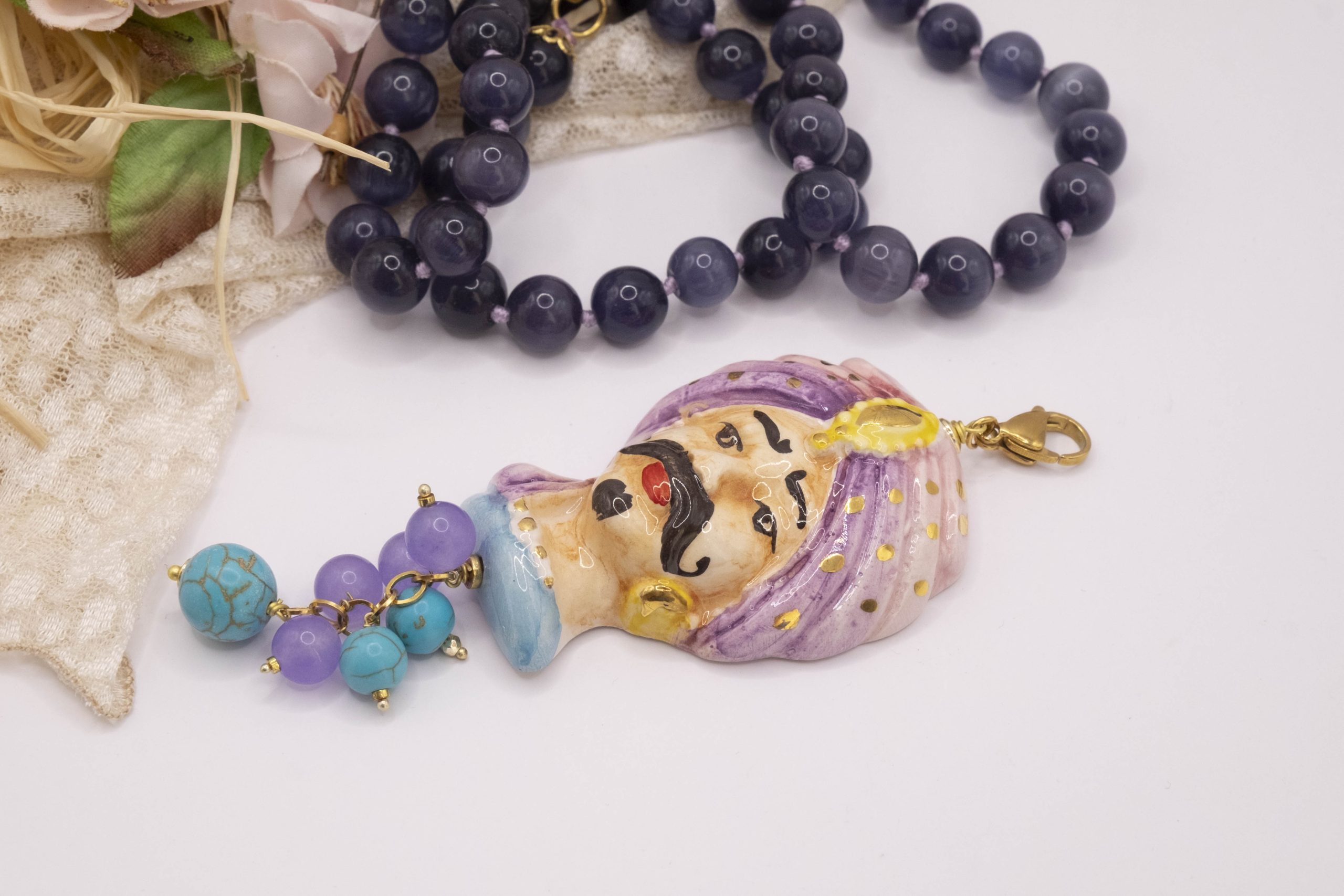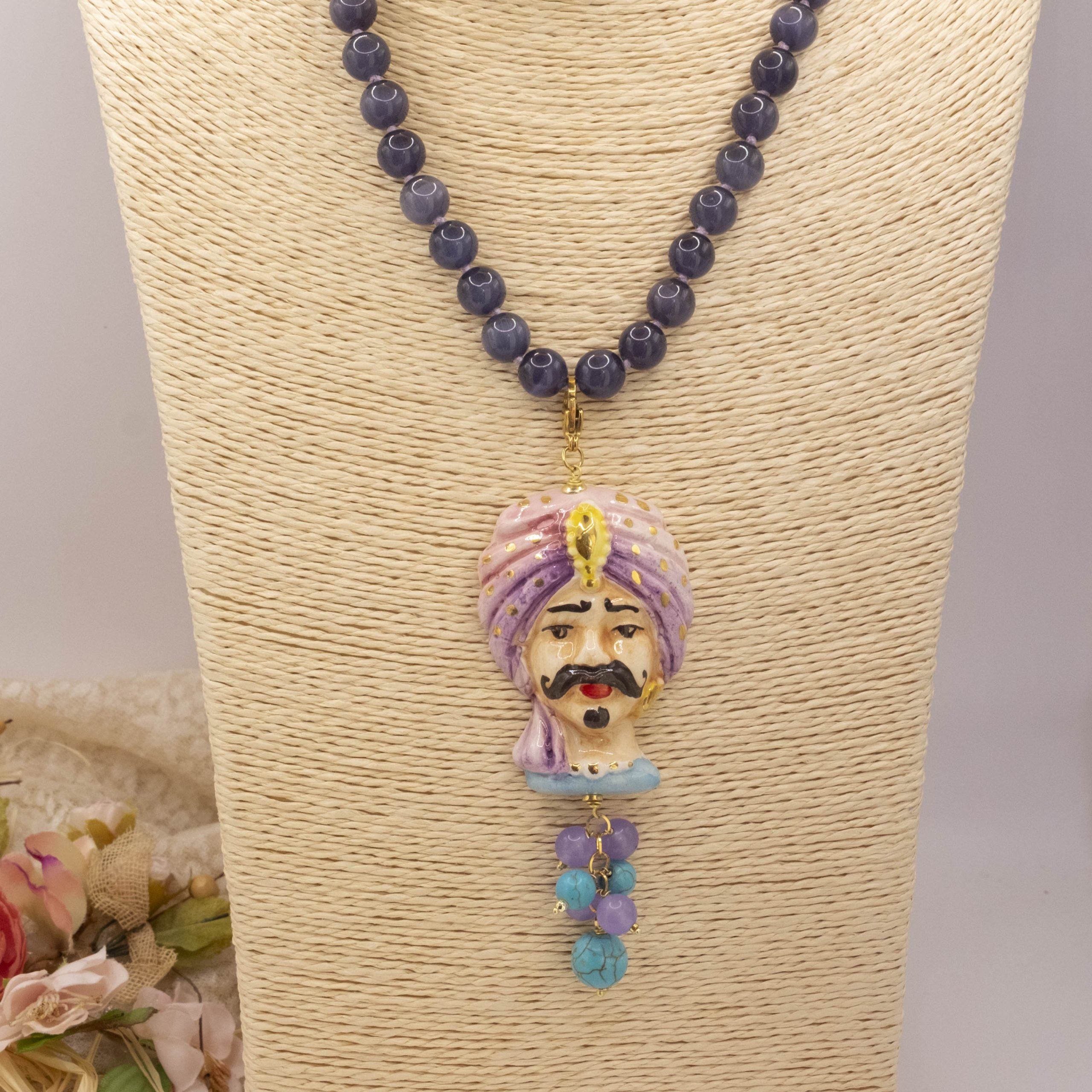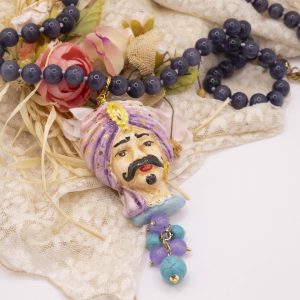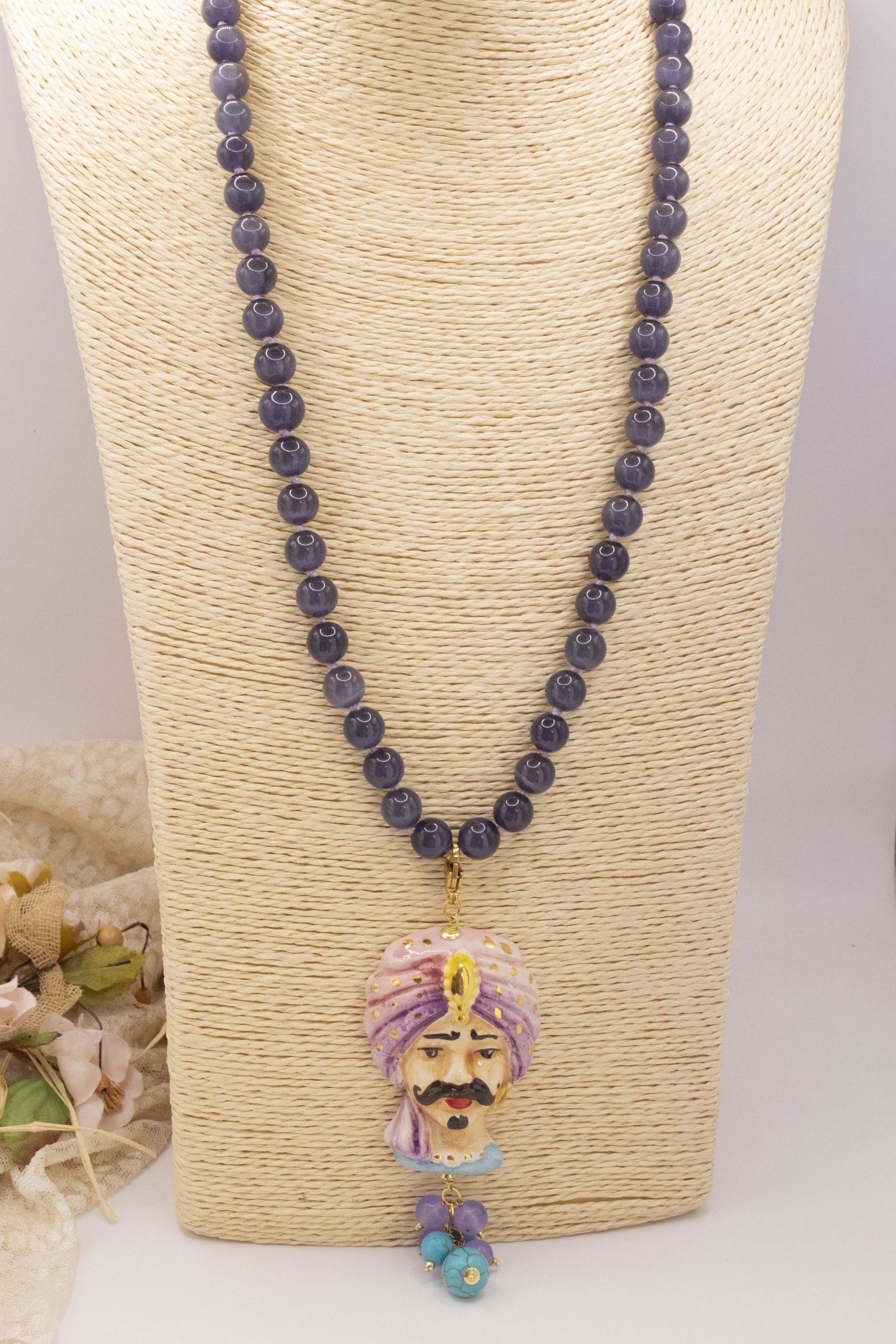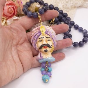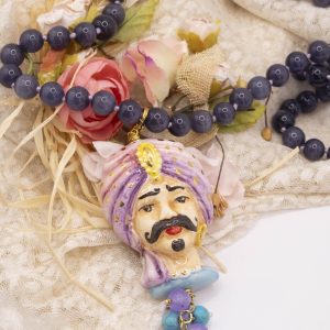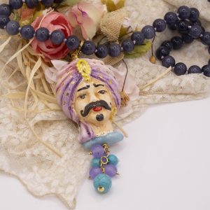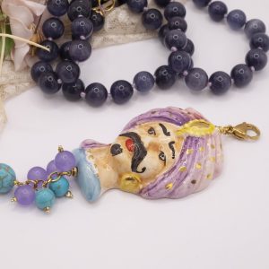 Necklace made entirely by hand, with a purple cat's eye choker and a Caltagirone ceramic Moor's Head decorated by hand with pure gold and a final cluster of lavender jade and turquoise paste. The finishes are in brass.