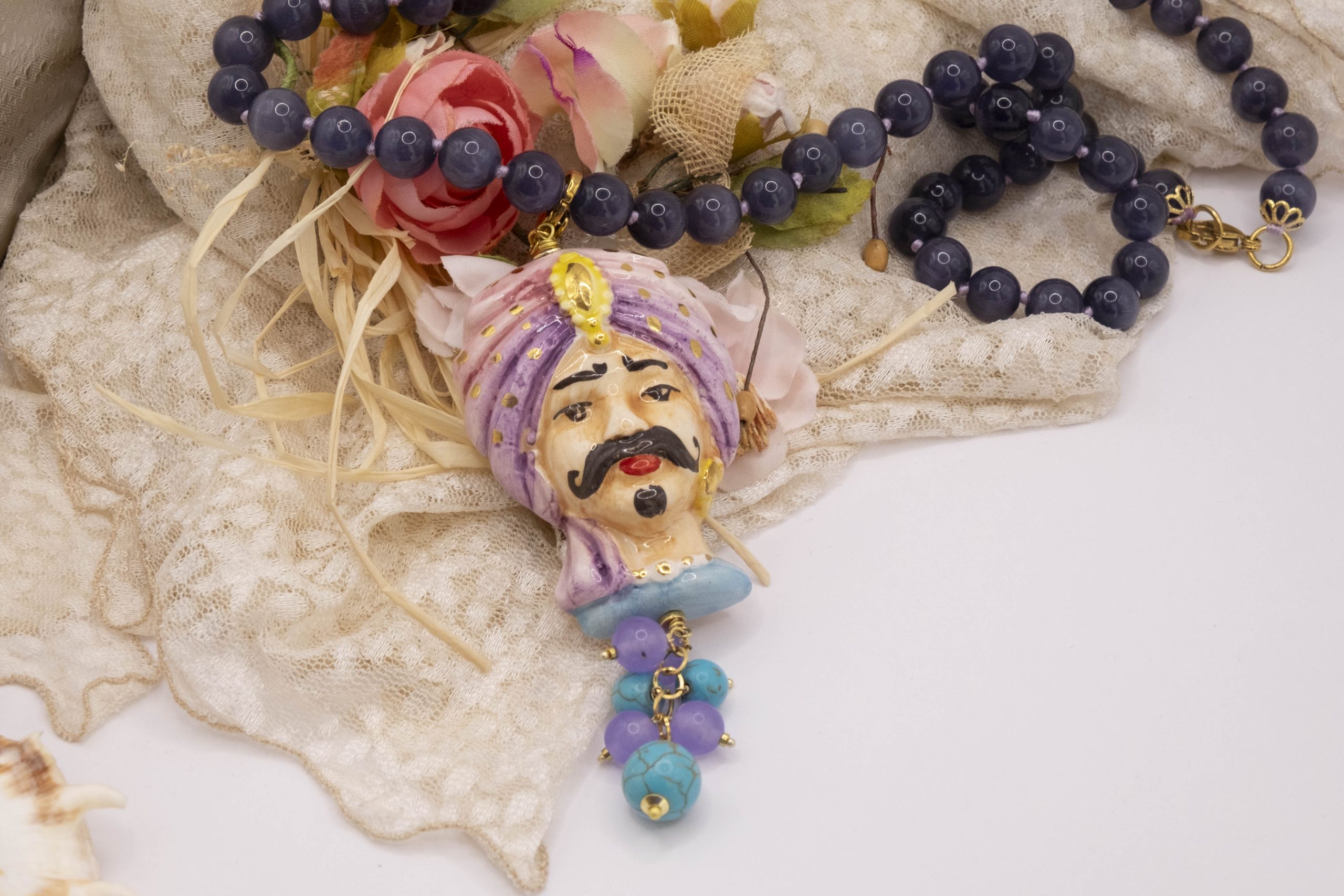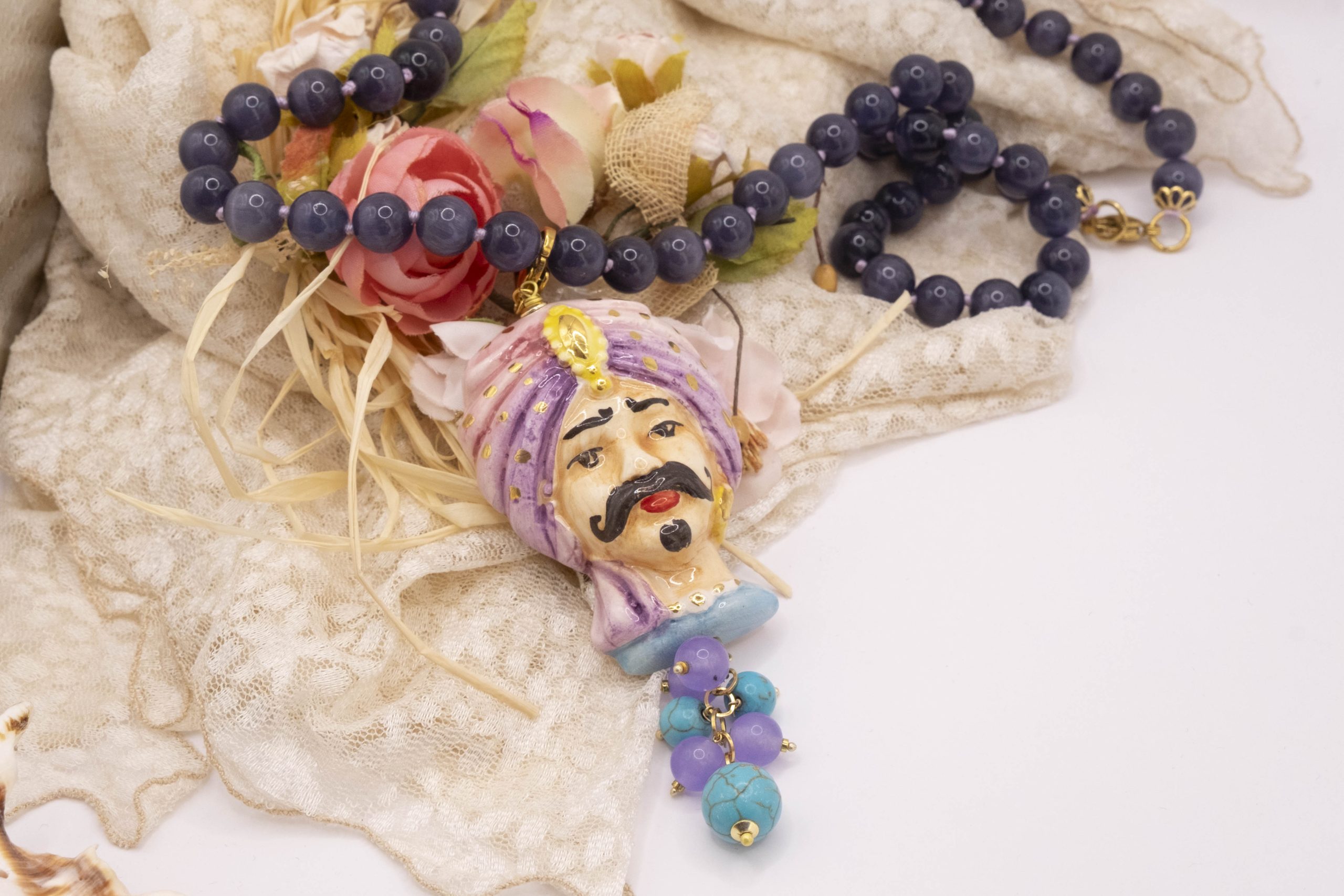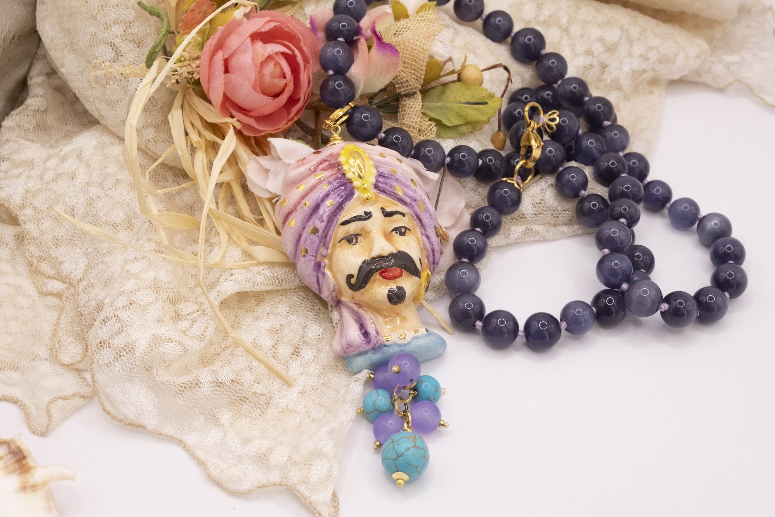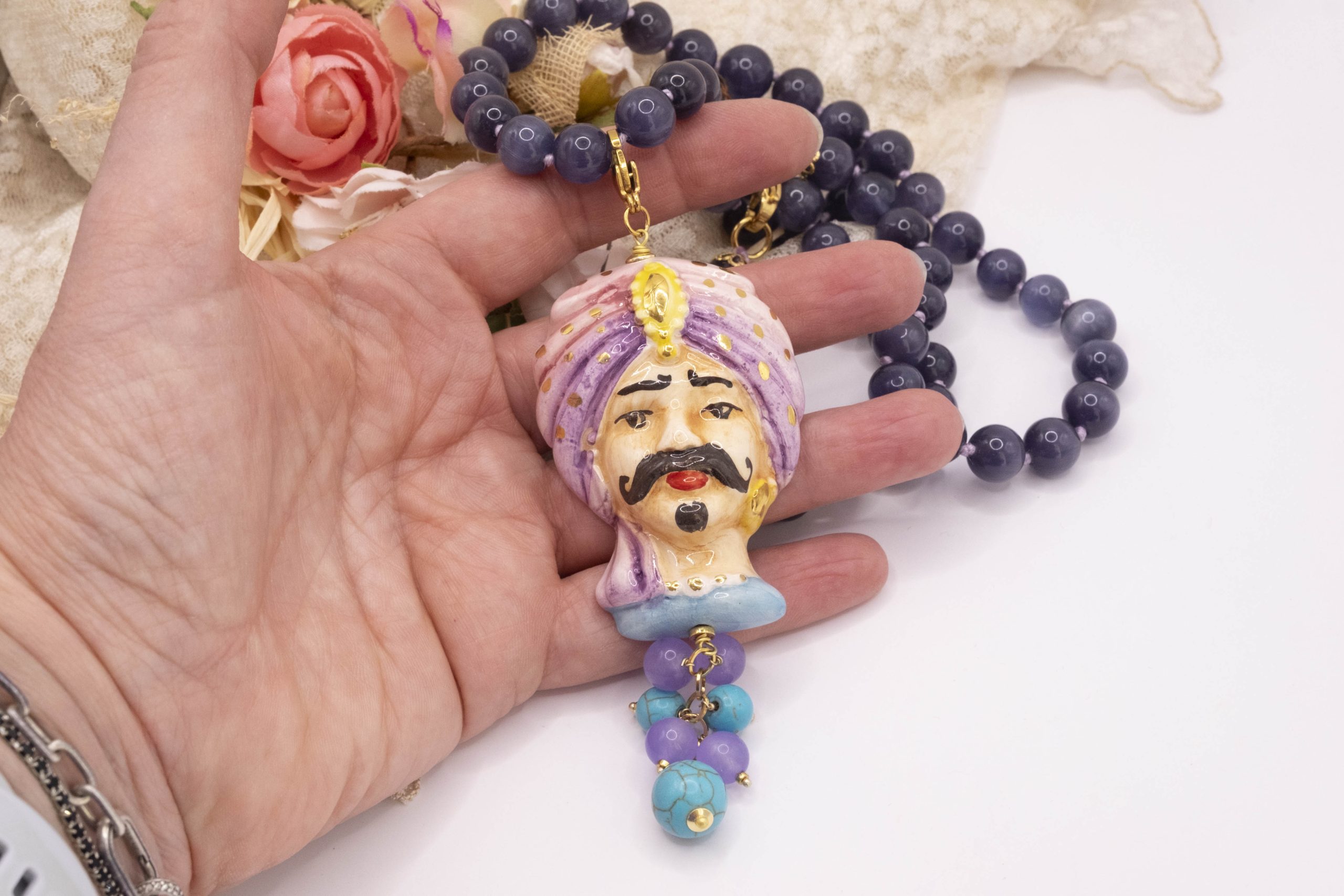 Necklace made entirely by hand, with a purple cat's eye choker and a Caltagirone ceramic Moor's Head decorated by hand with pure gold and a final cluster of lavender jade and turquoise paste. The finishes are in brass.