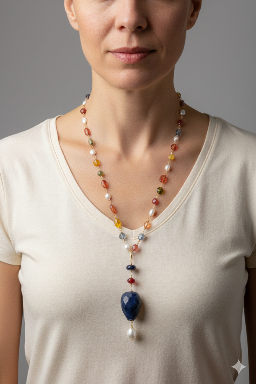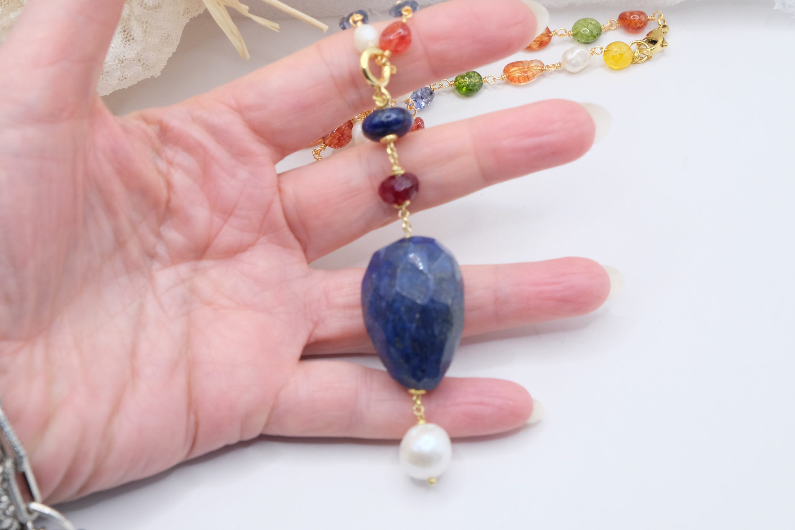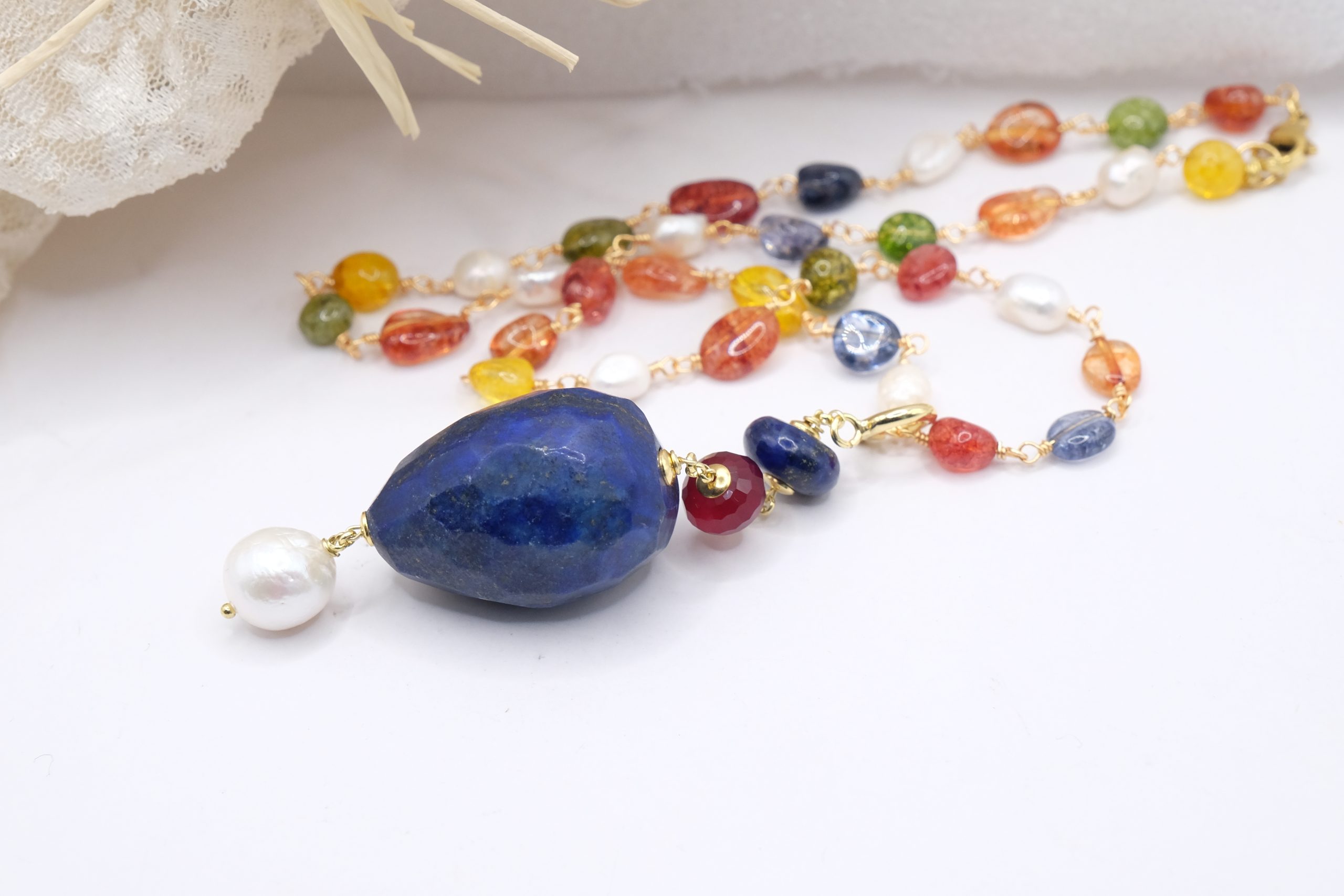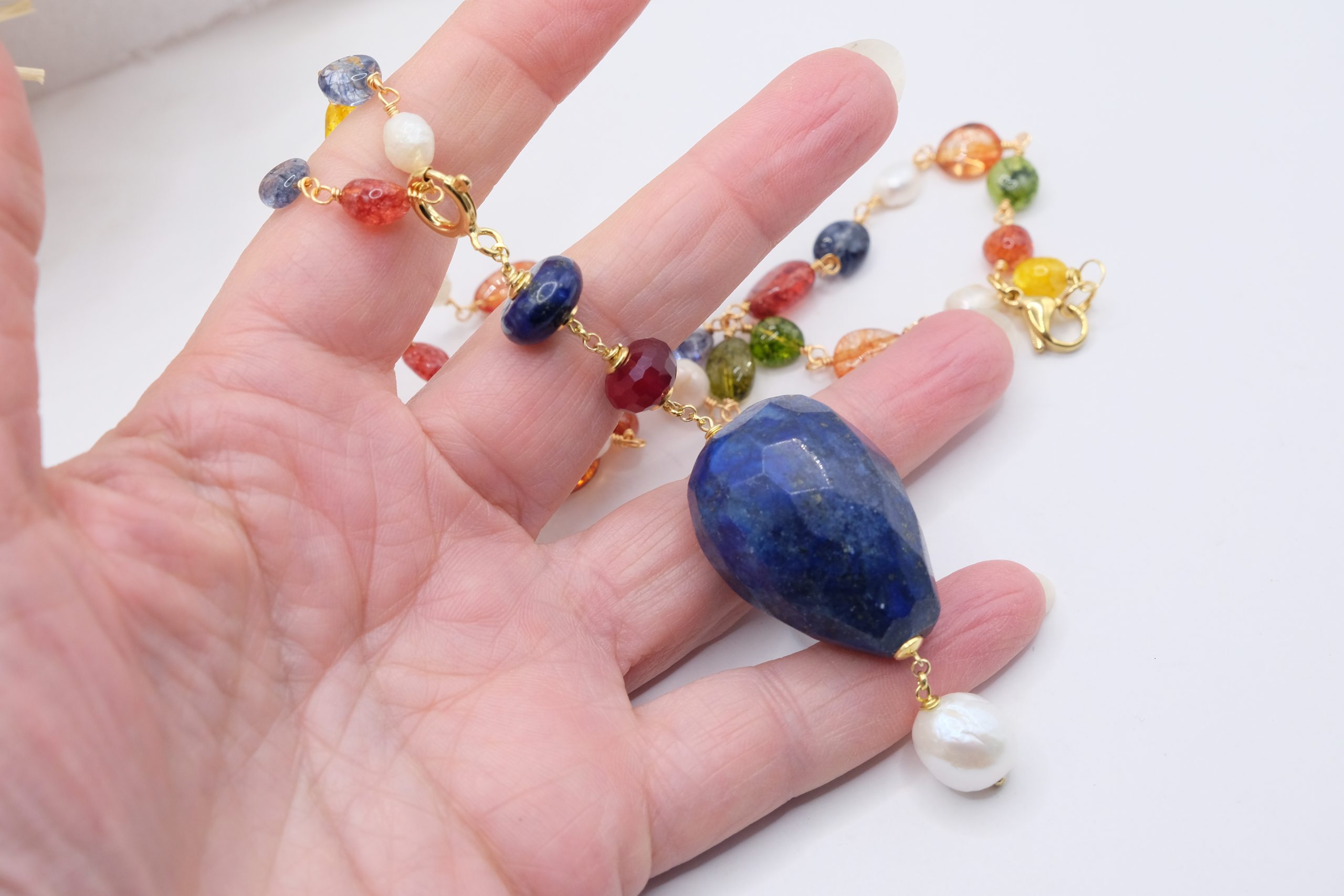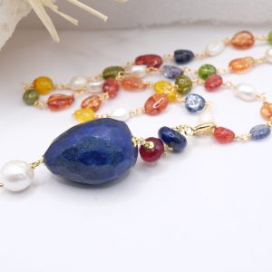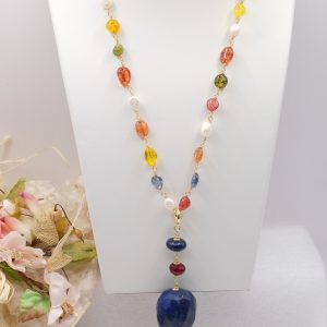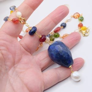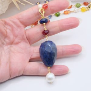Multicolor tourmaline necklace with detachable pendant featuring a large faceted lapis lazuli stone, natural pearl, and burgundy jade.