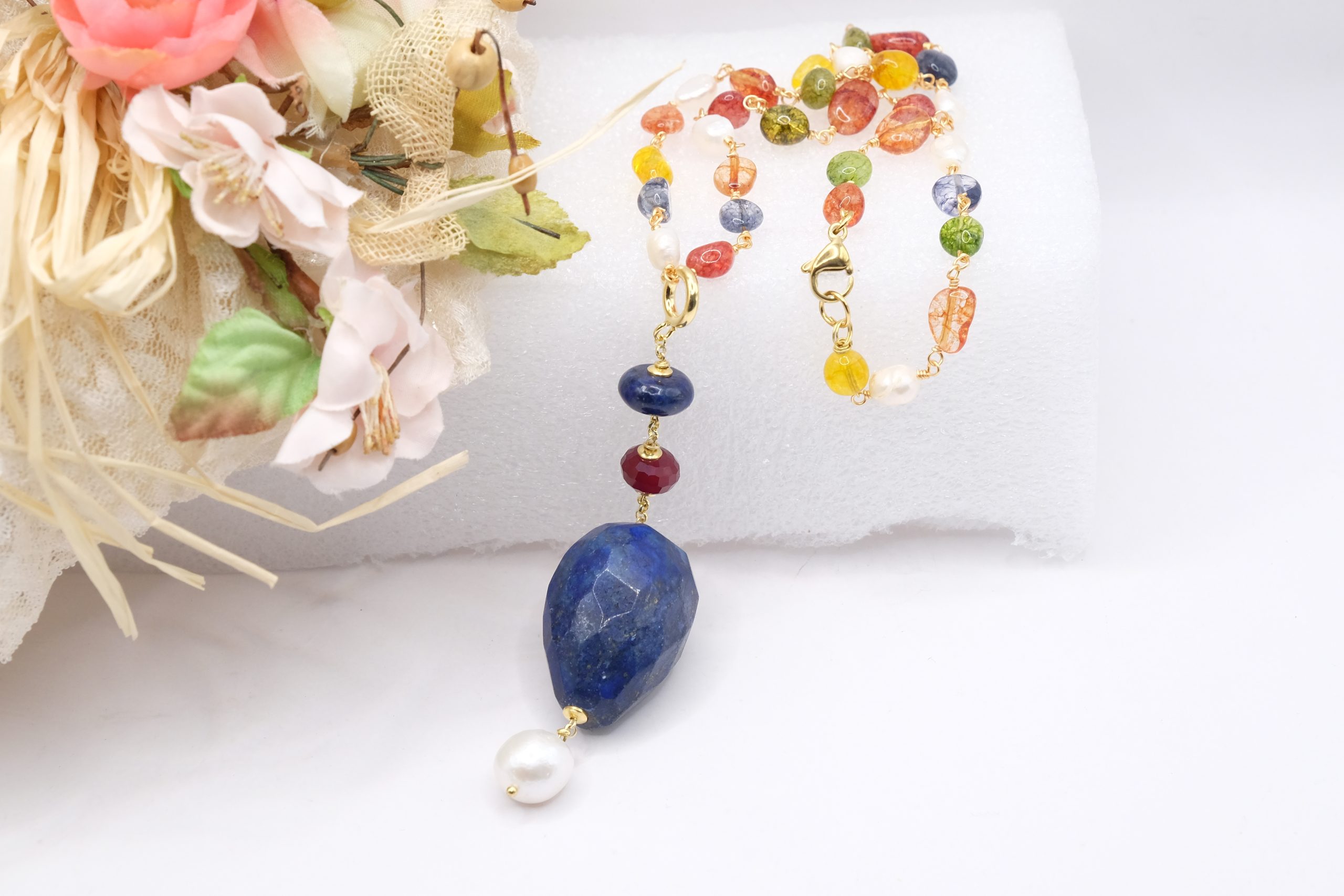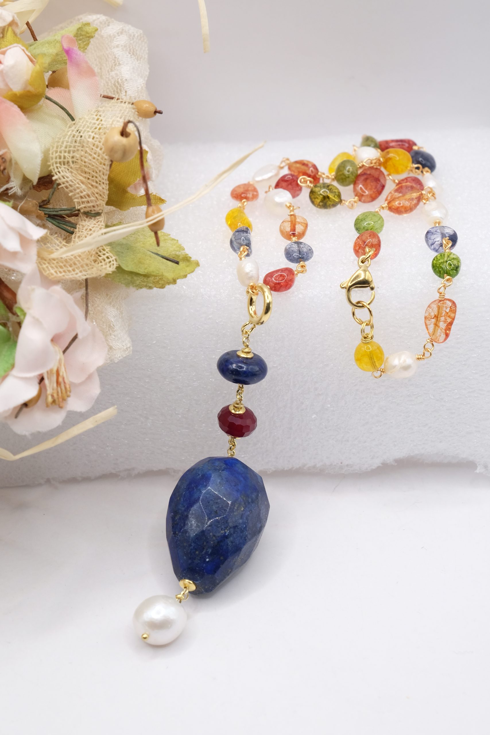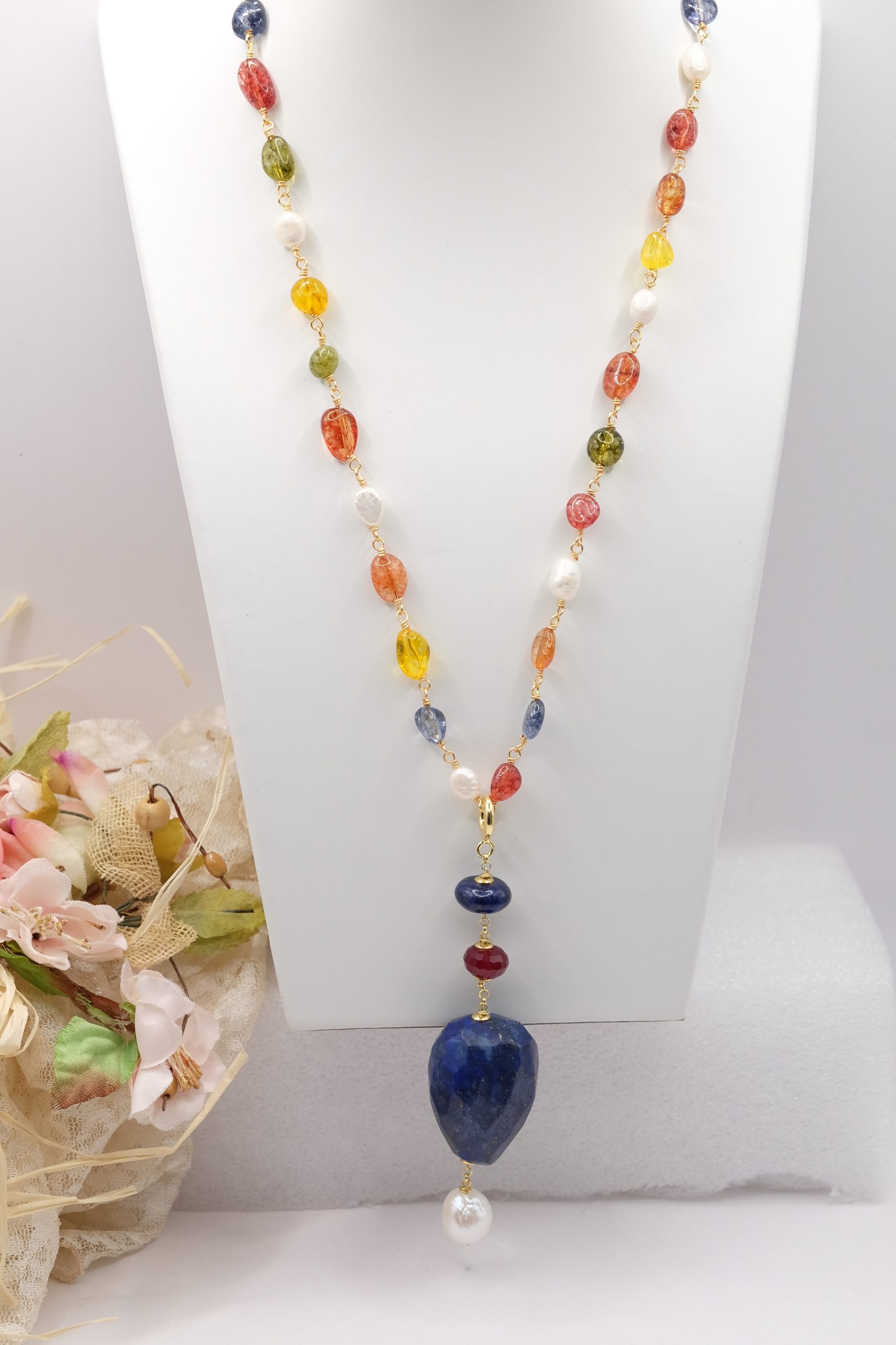 Material: Multicolored Tourmaline, Lapis, Burgundy Jade, Pearl, Gold-plated 925 Silver, Steel