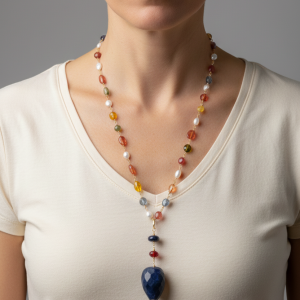 Multicolored Tourmaline Rosary Necklace with Lapis Pearl Pendant and Burgundy Silver