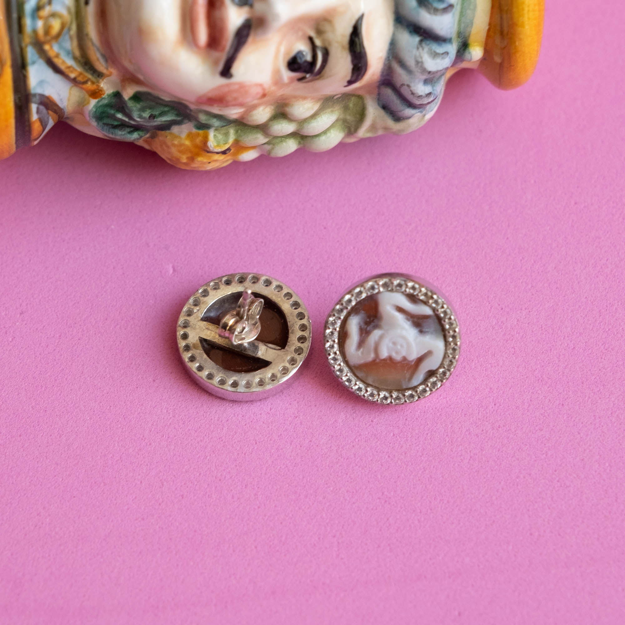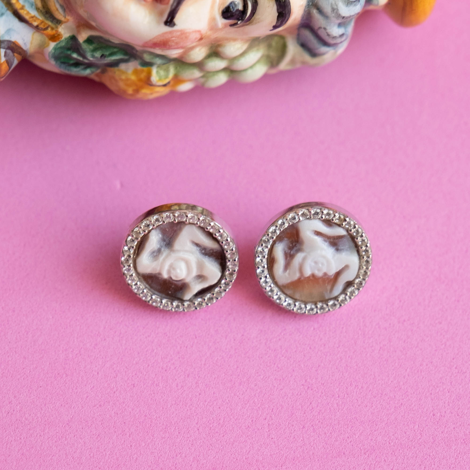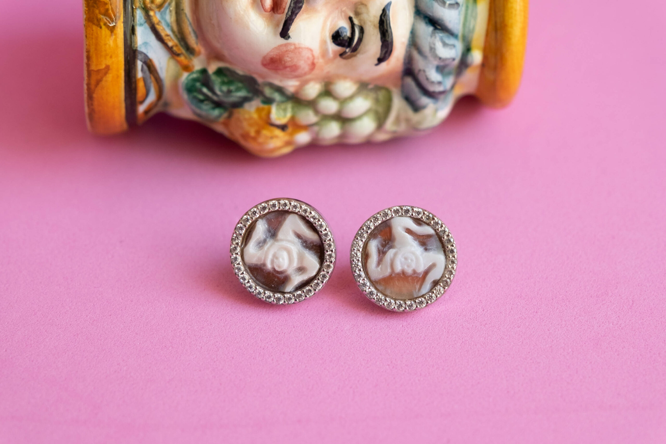 Lobe earrings with real carnelian shell cameo, hand engraved by the master goldsmiths of Torre del Greco with the TRINACRIA engraved, symbol of Sicily, and brilliant zircons.
