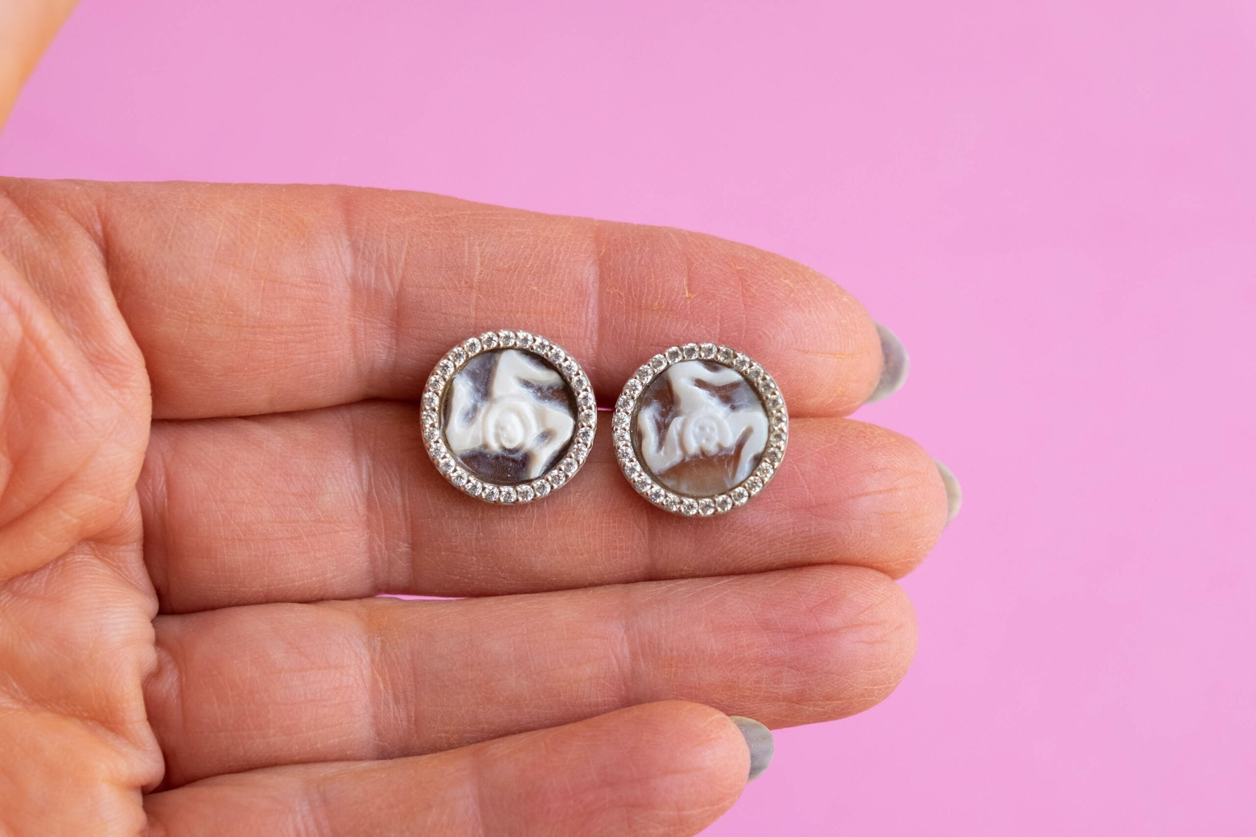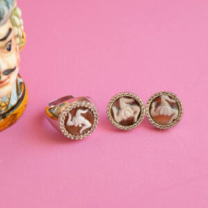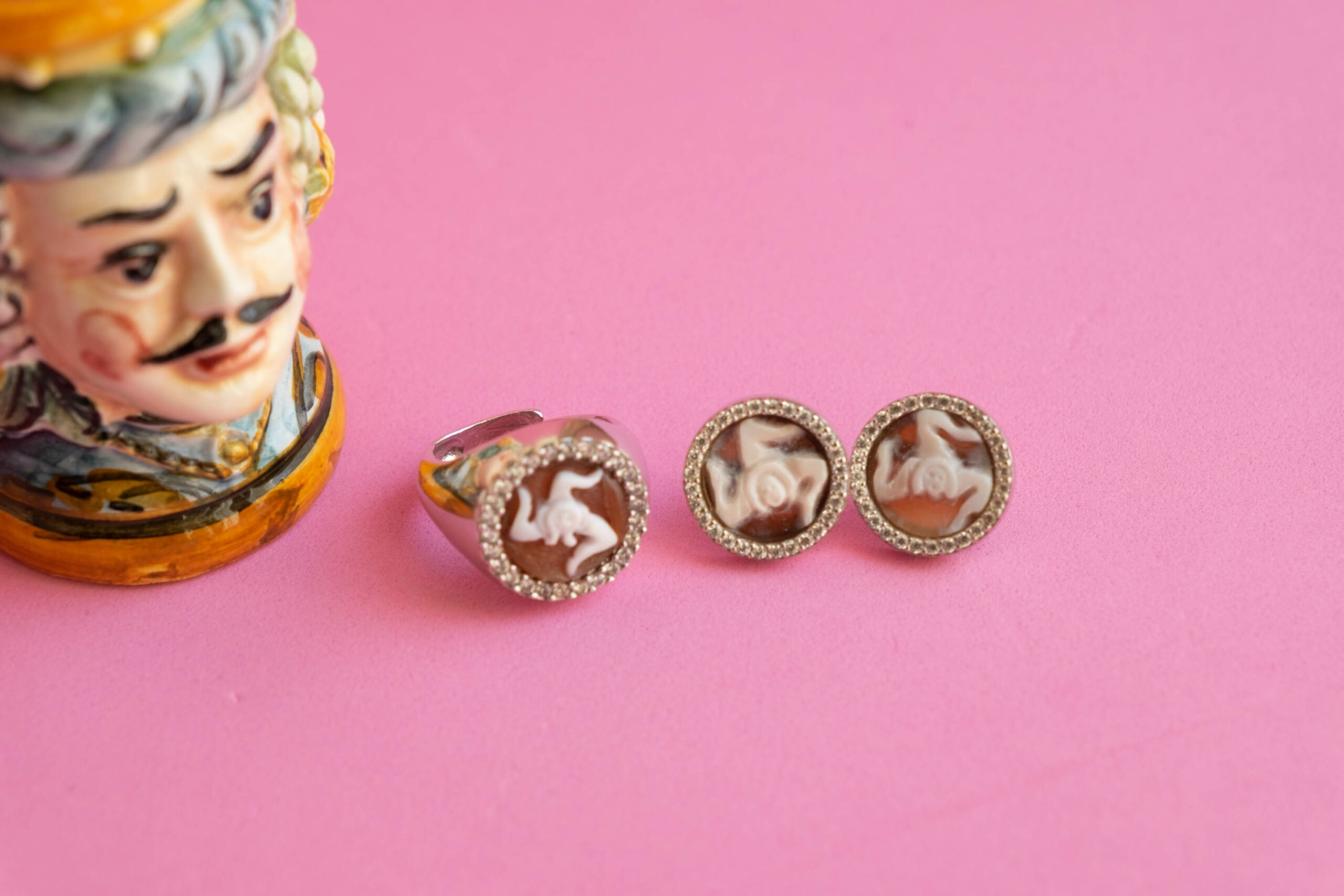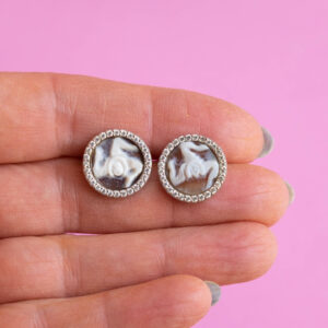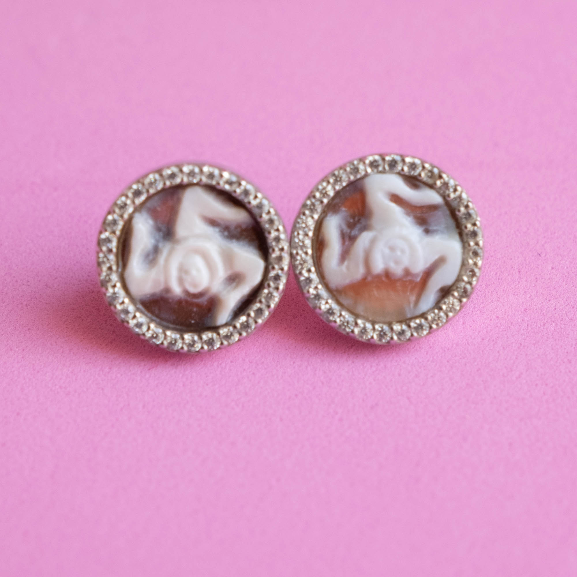 Lobe earrings with real carnelian shell cameo, hand engraved by the master goldsmiths of Torre del Greco with the TRINACRIA engraved, symbol of Sicily, and brilliant zircons.