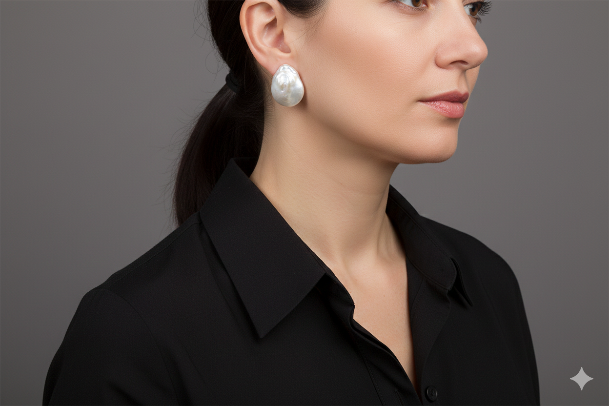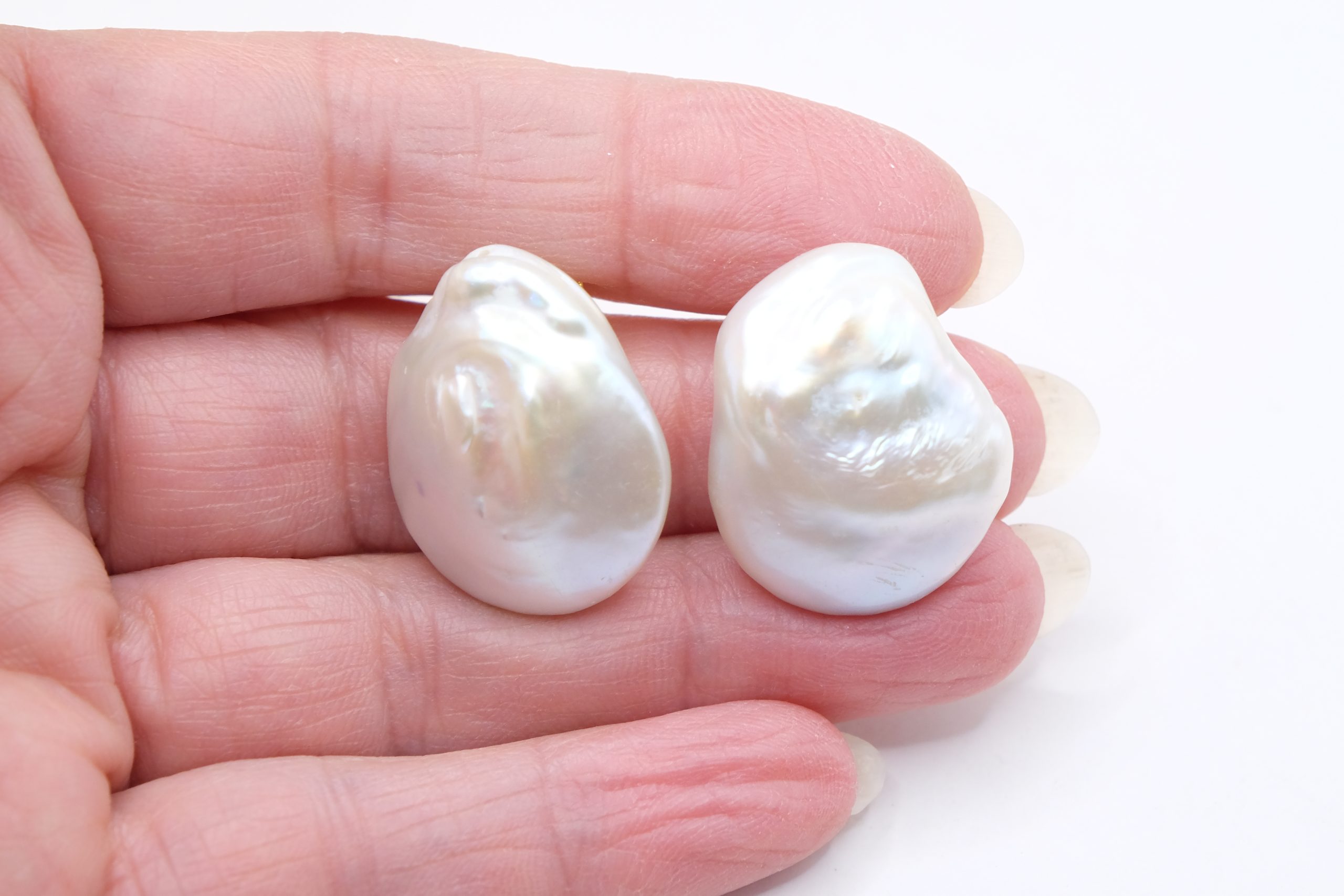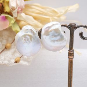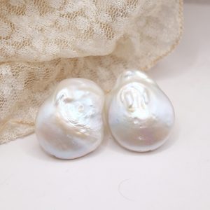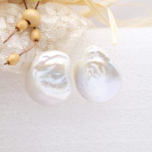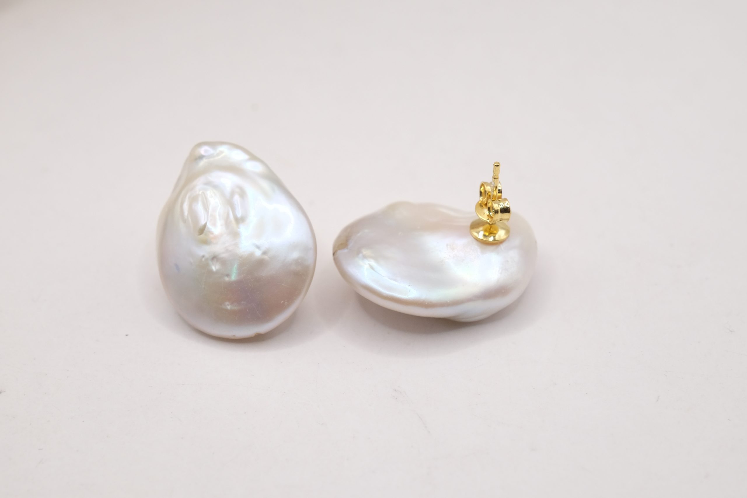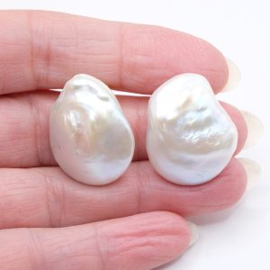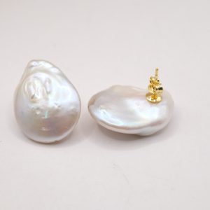 Stud earrings with bright and large 25mm natural flat white baroque pearls.