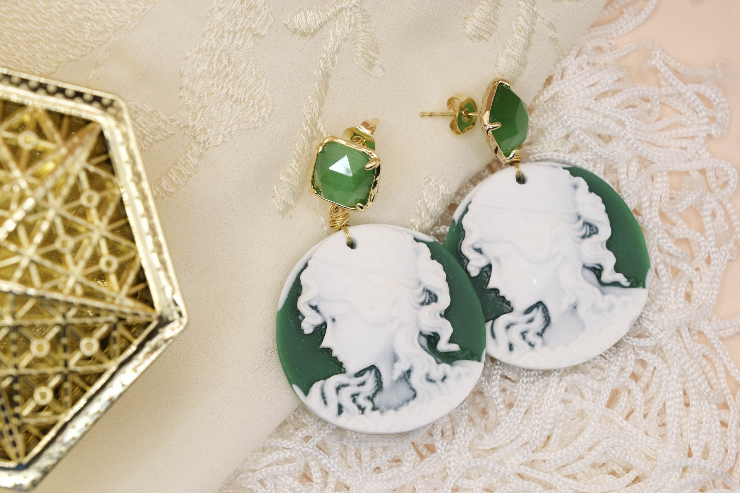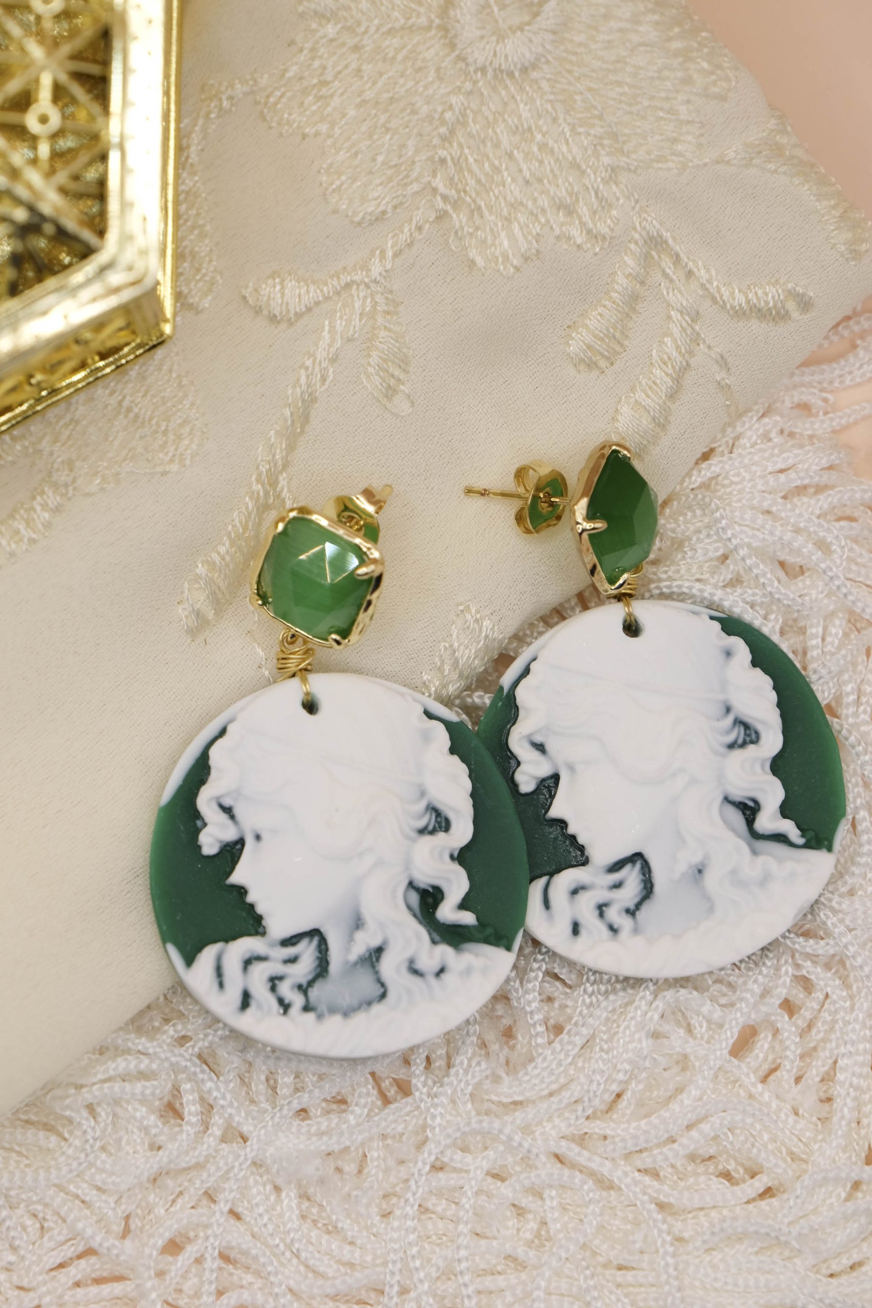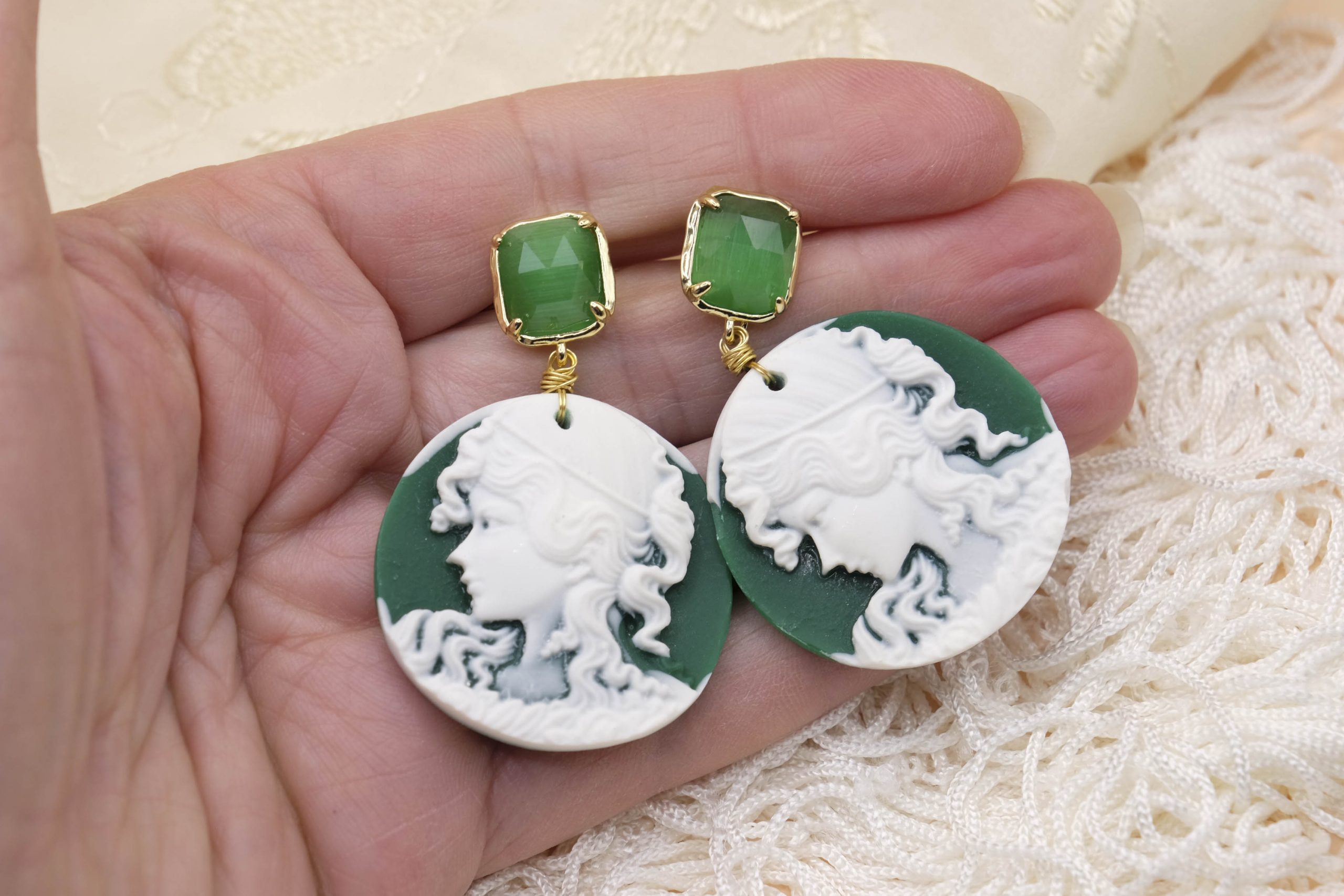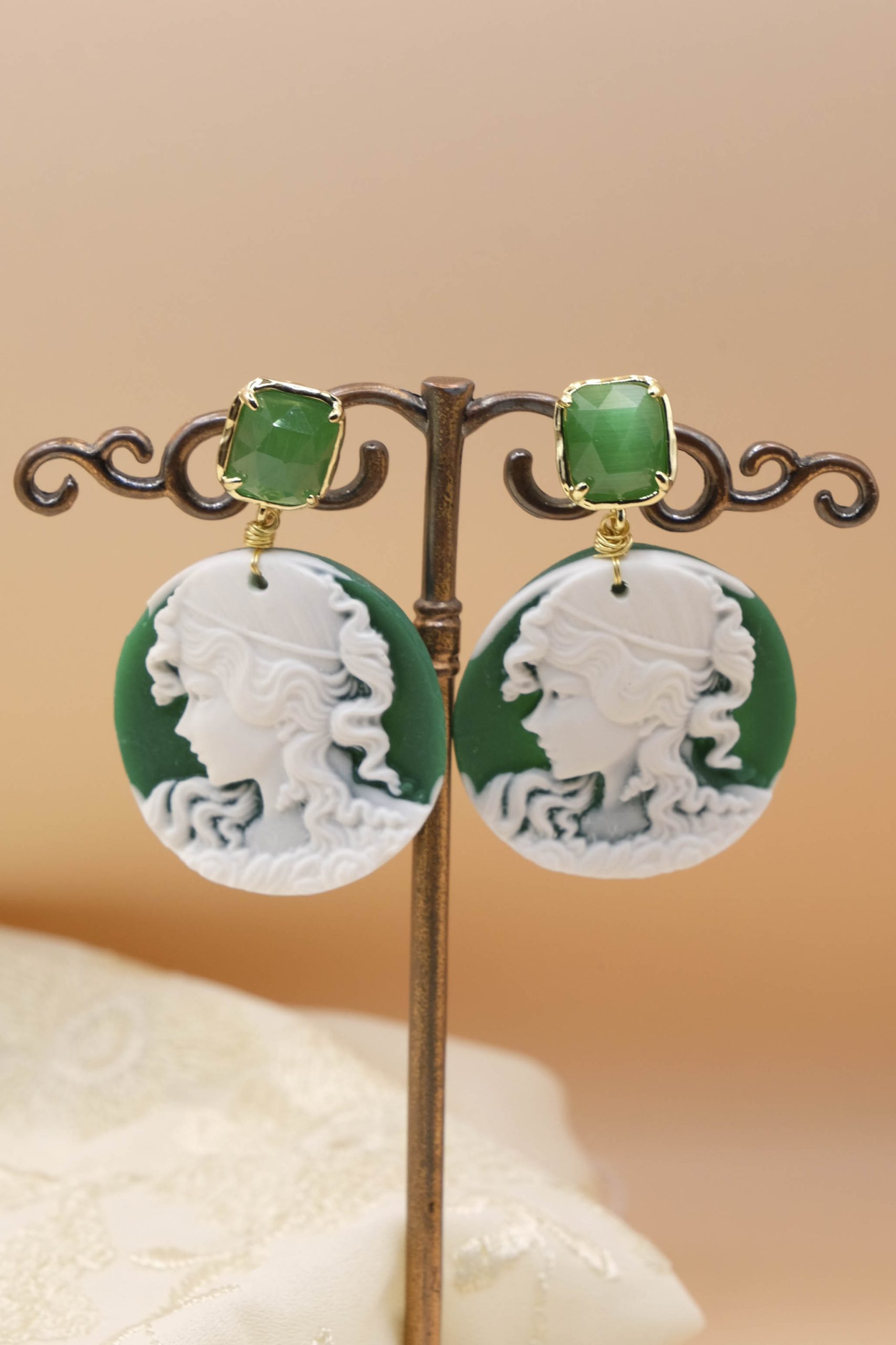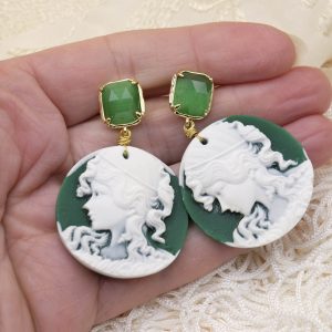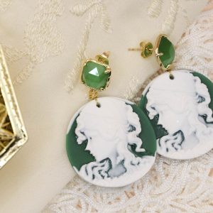 Enhance your style with these exclusive green resin cameo earrings, embellished with a delicate Lady's face sculpted with mastery. The Steel pin with elegant detail cat's eye gives a sophisticated touch, perfect for any occasion.