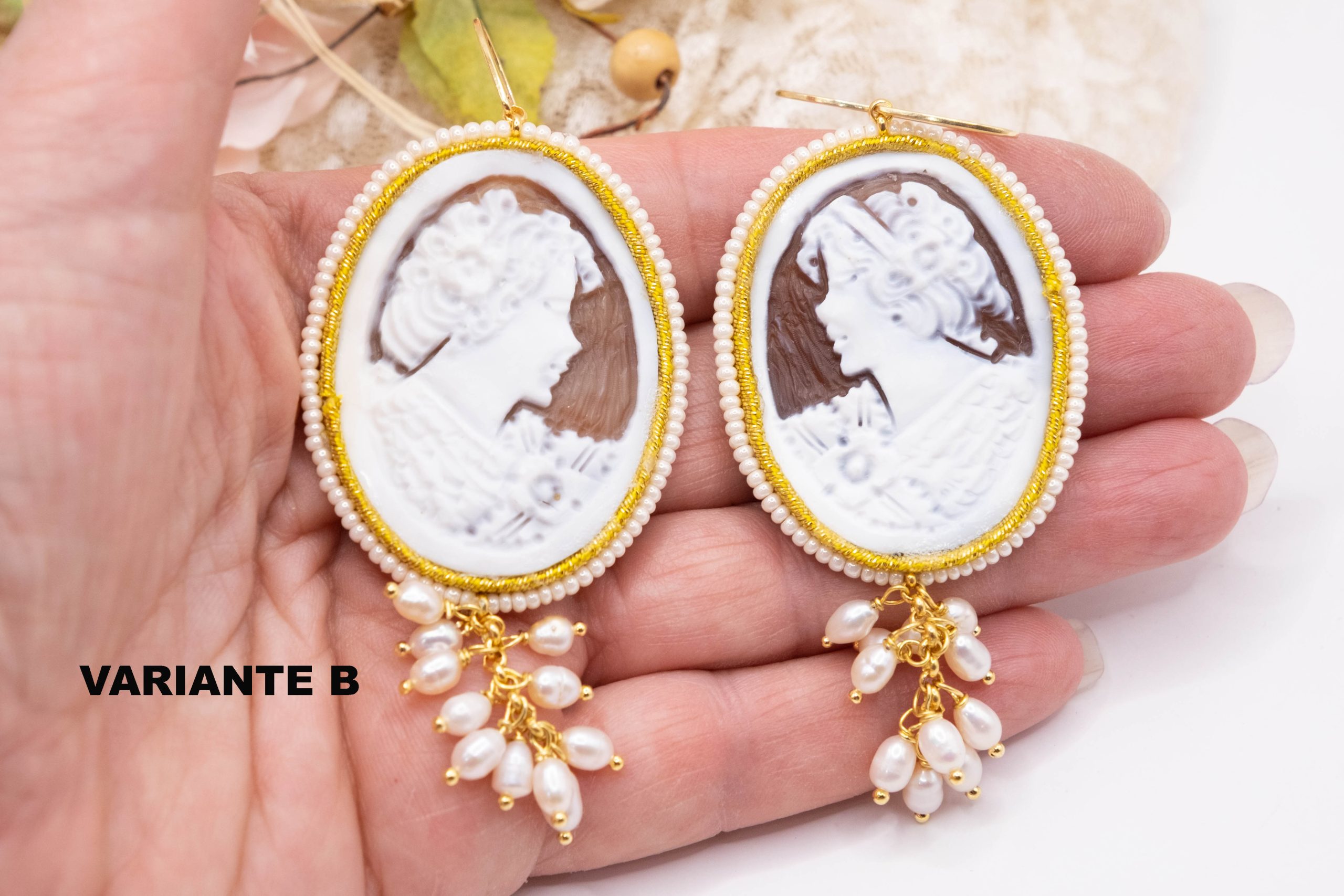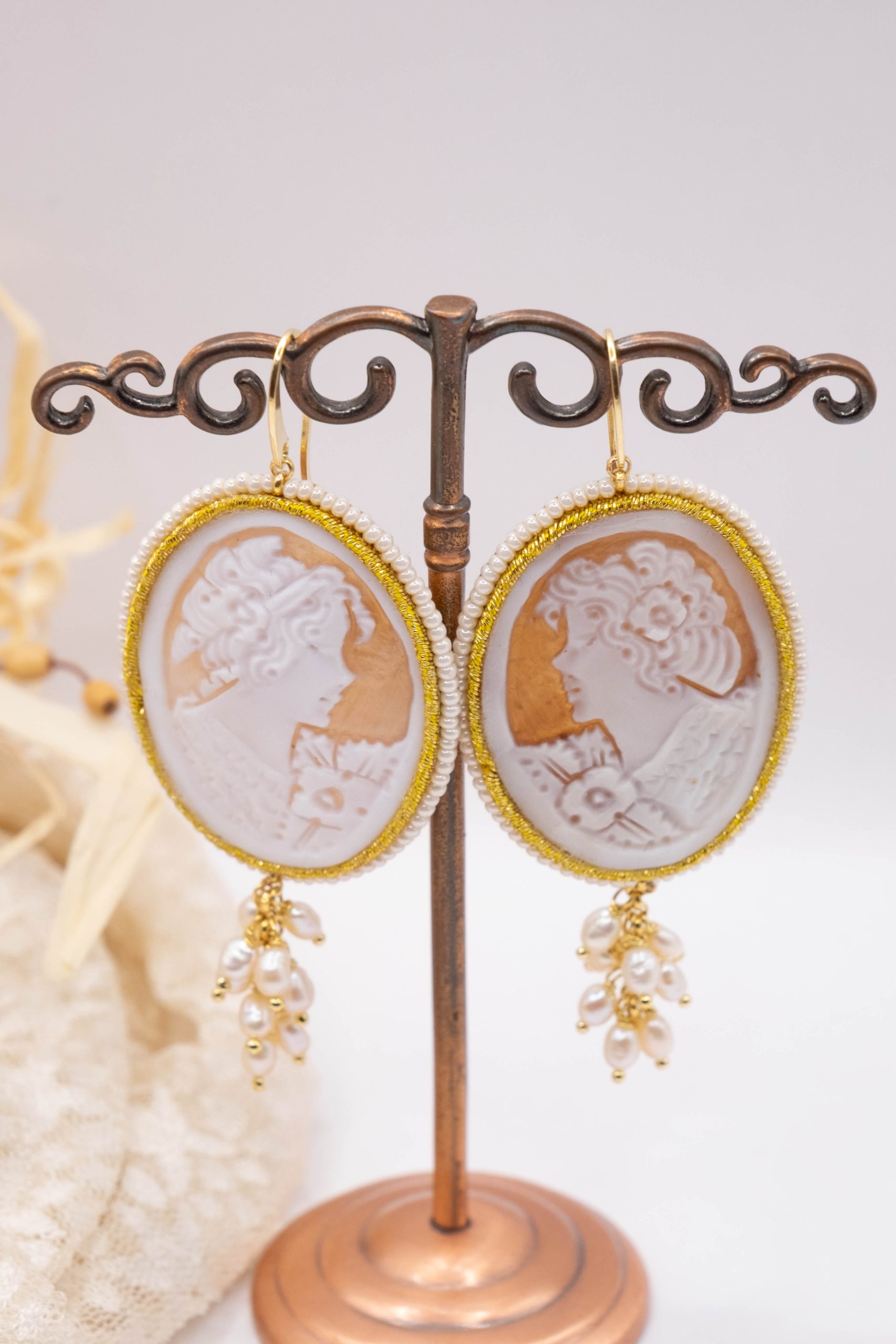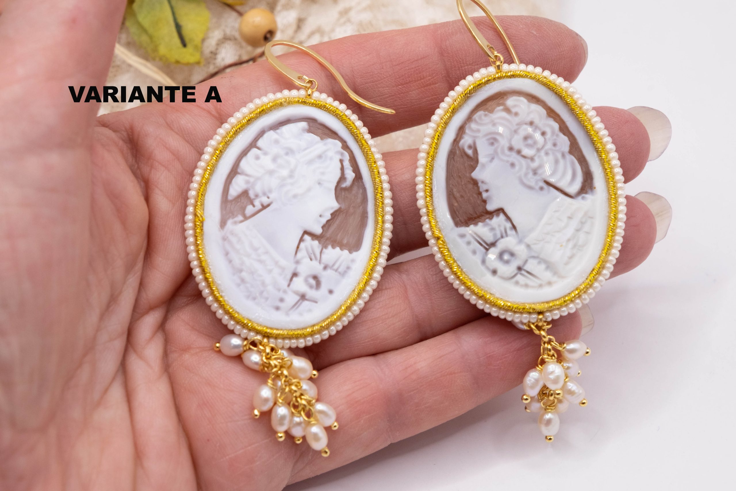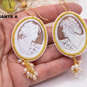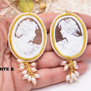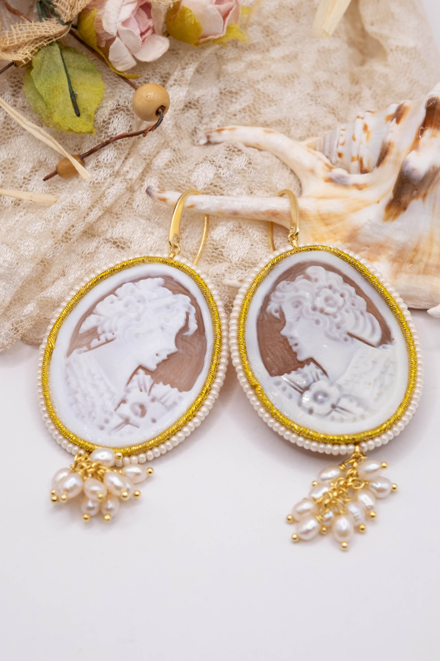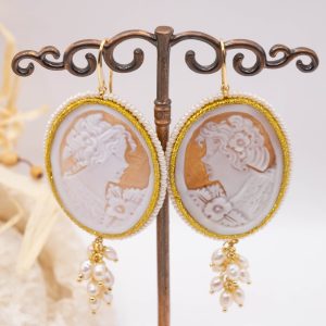Magnificent earrings, with real sardonyx shell cameos, engraved by the master goldsmiths of Torre del Greco, with a micropearl frame and gold trimmings with suoire workmanship.