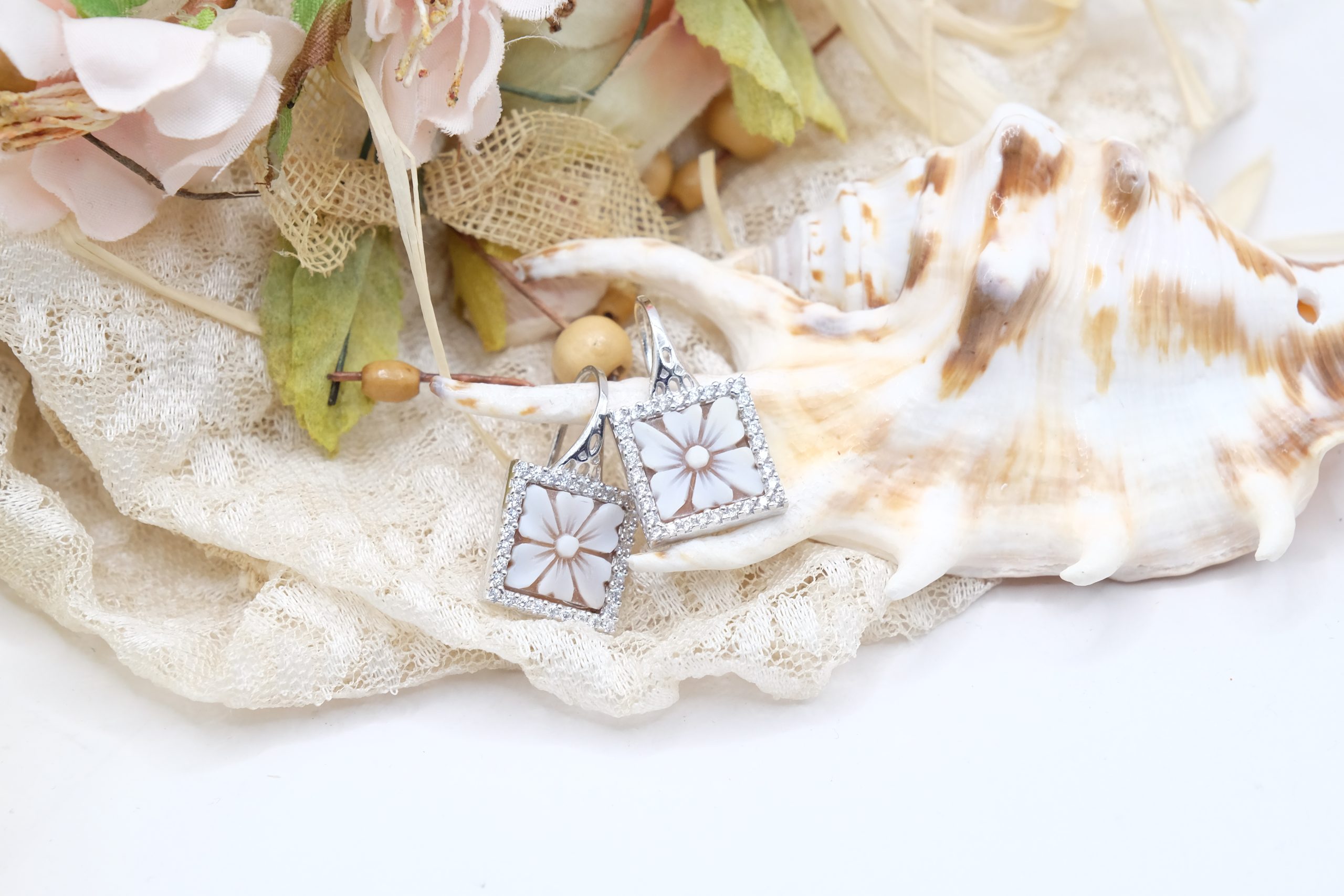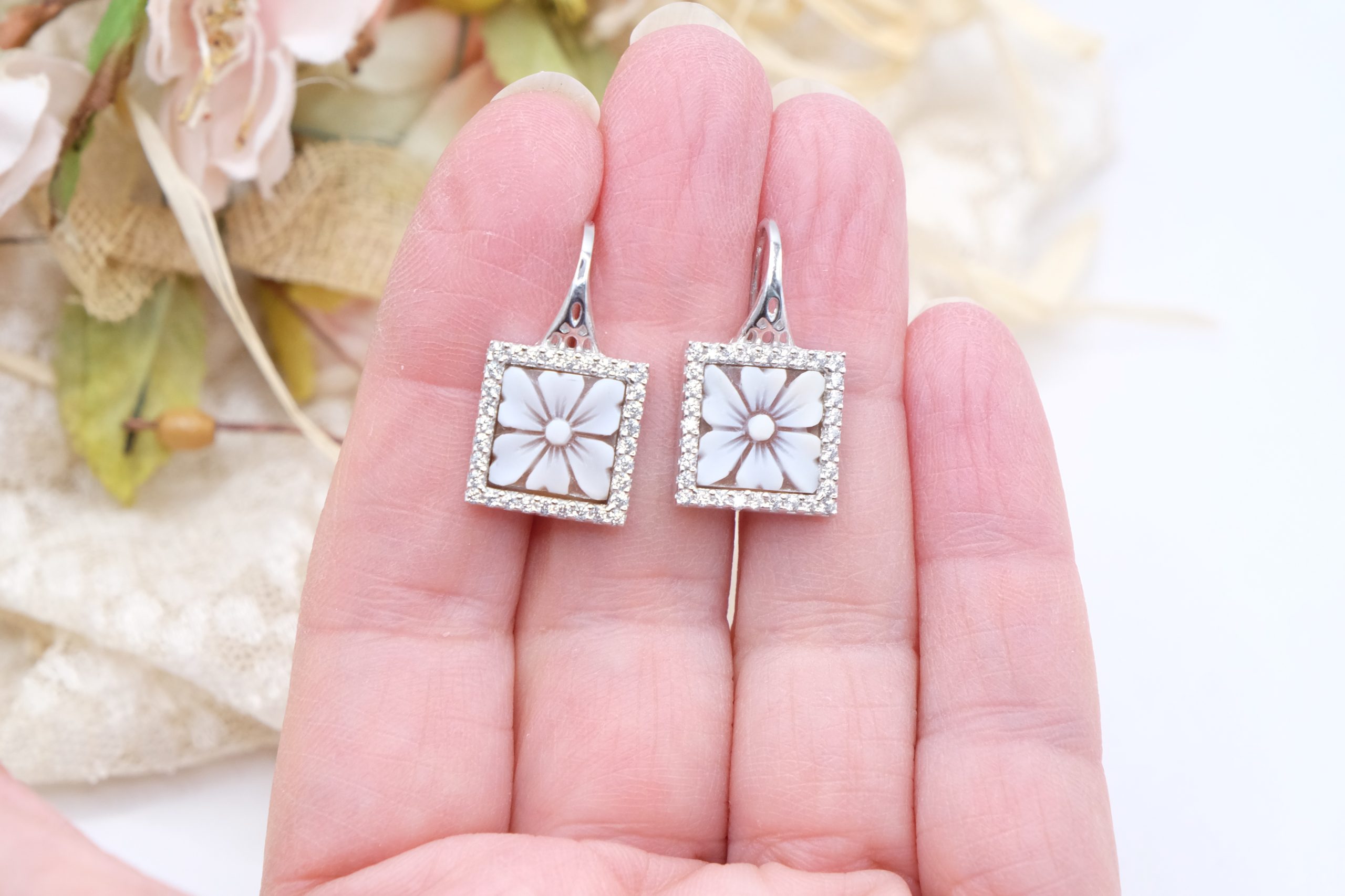 Earrings with real sardonyx shell cameos, hand-engraved by the master goldsmiths of Torre del Greco with a Dahlia motif, and brilliant zirconia.