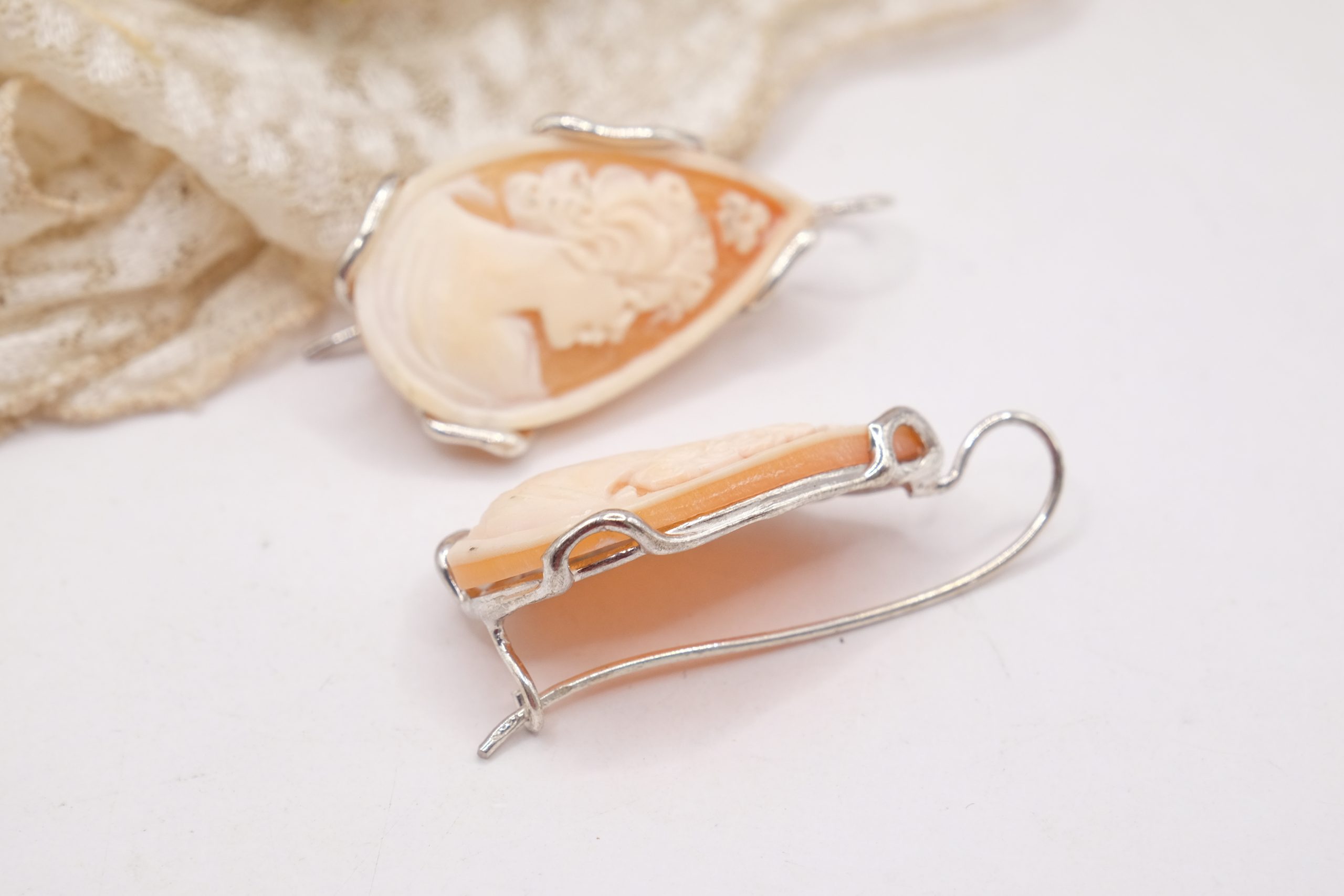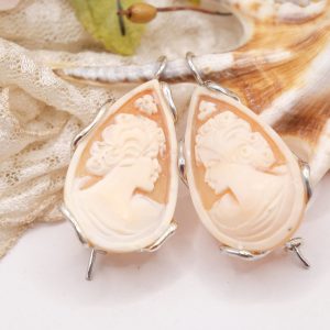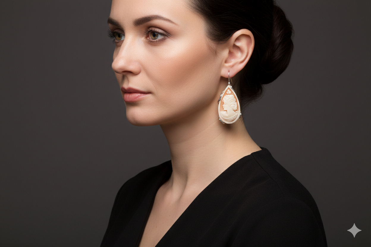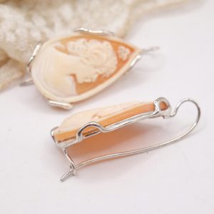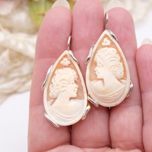 Earrings with genuine antique-style sardonyx shell drop cameos, hand-engraved by the master goldsmiths of Torre del Greco with a Donna motif