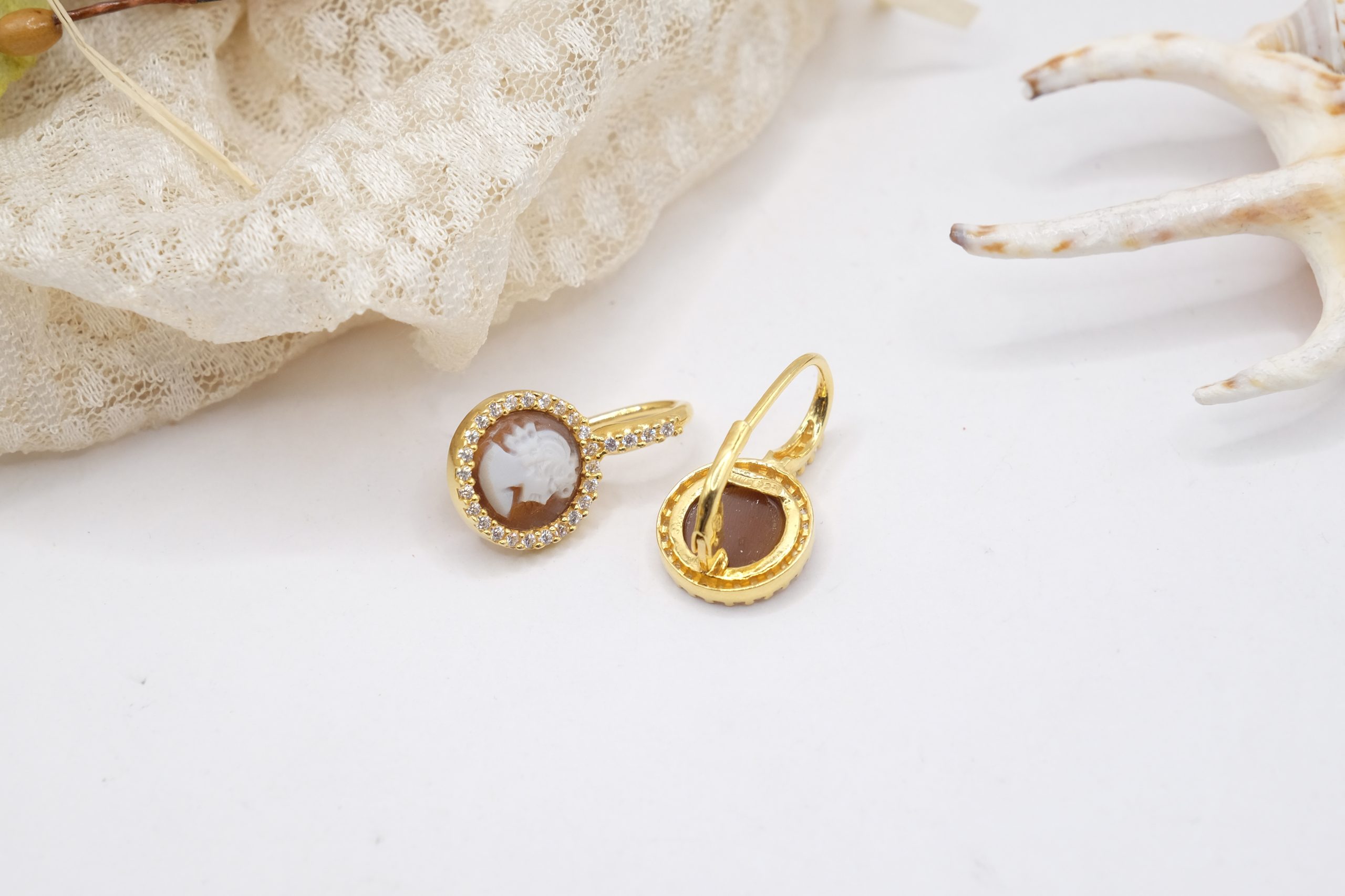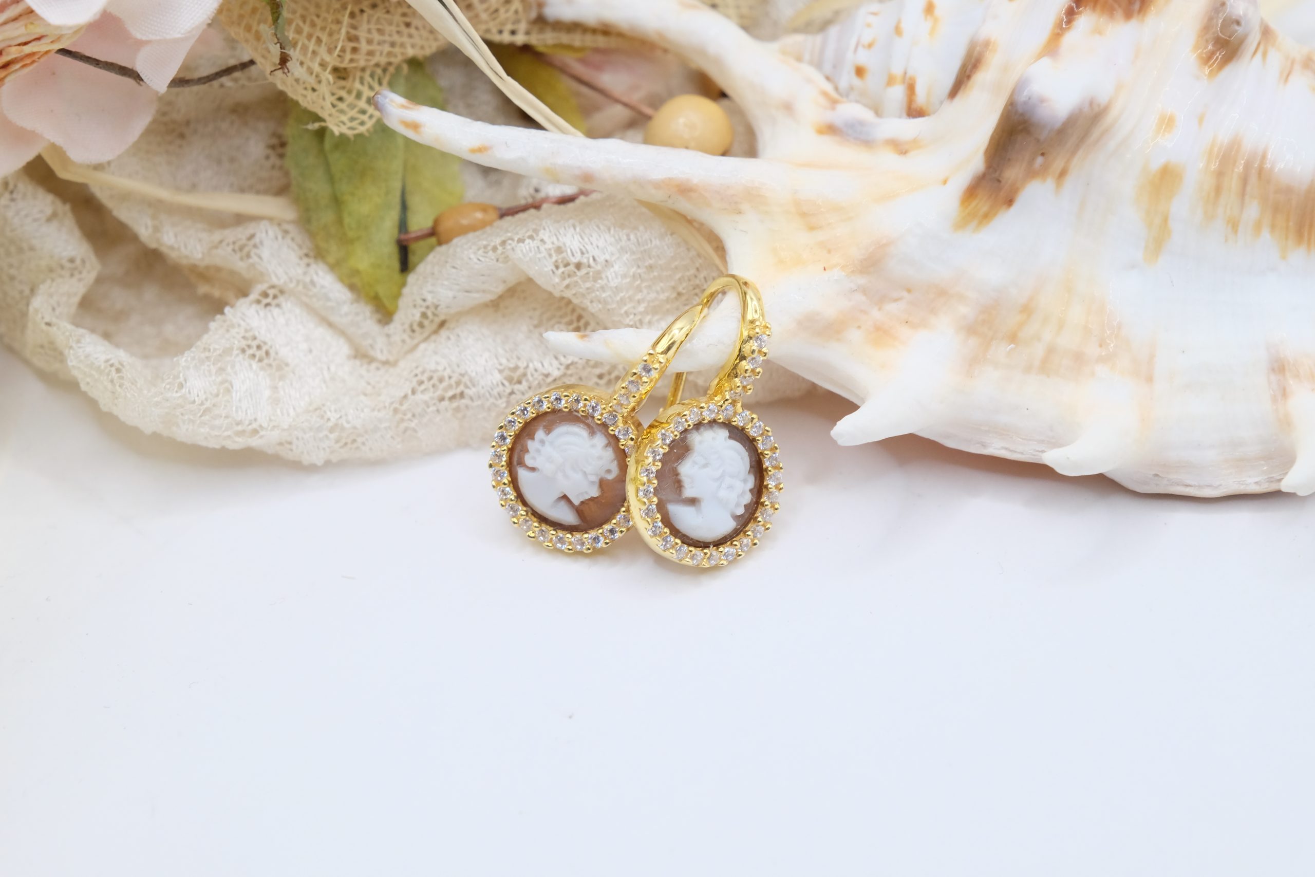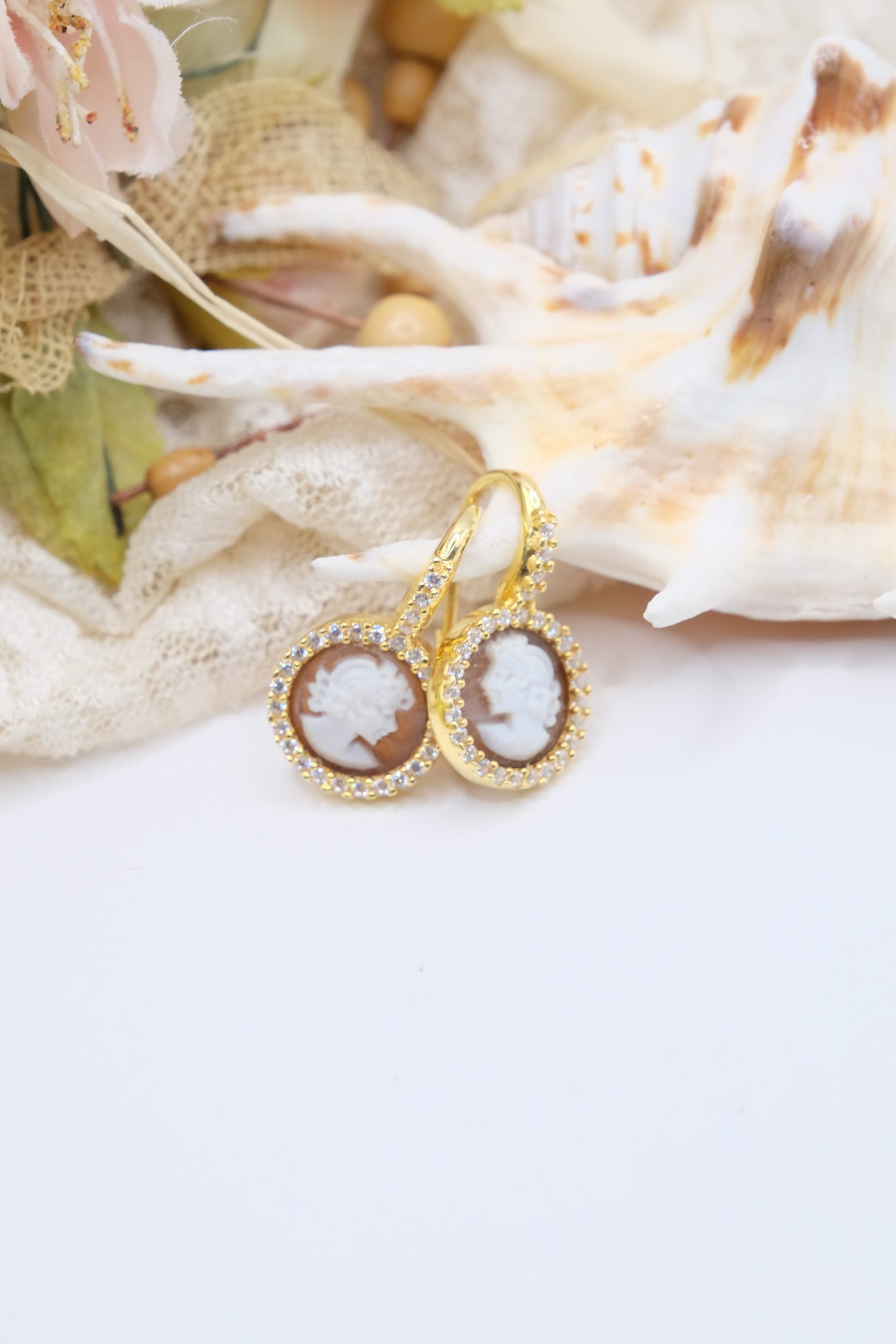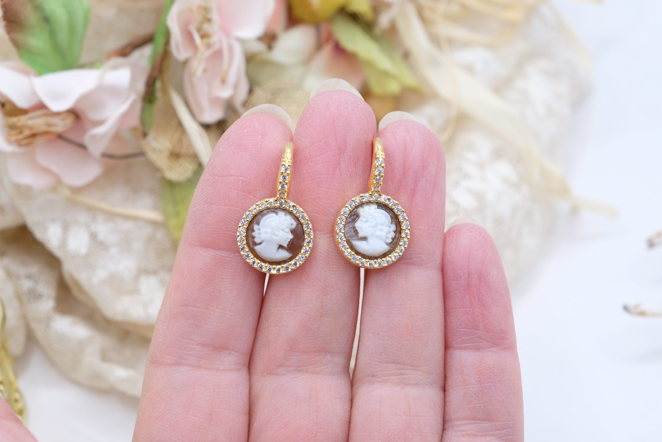 Earrings with genuine sardonyx shell cameos, hand-engraved by the master goldsmiths of Torre del Greco with a woman motif, and brilliant zirconia.