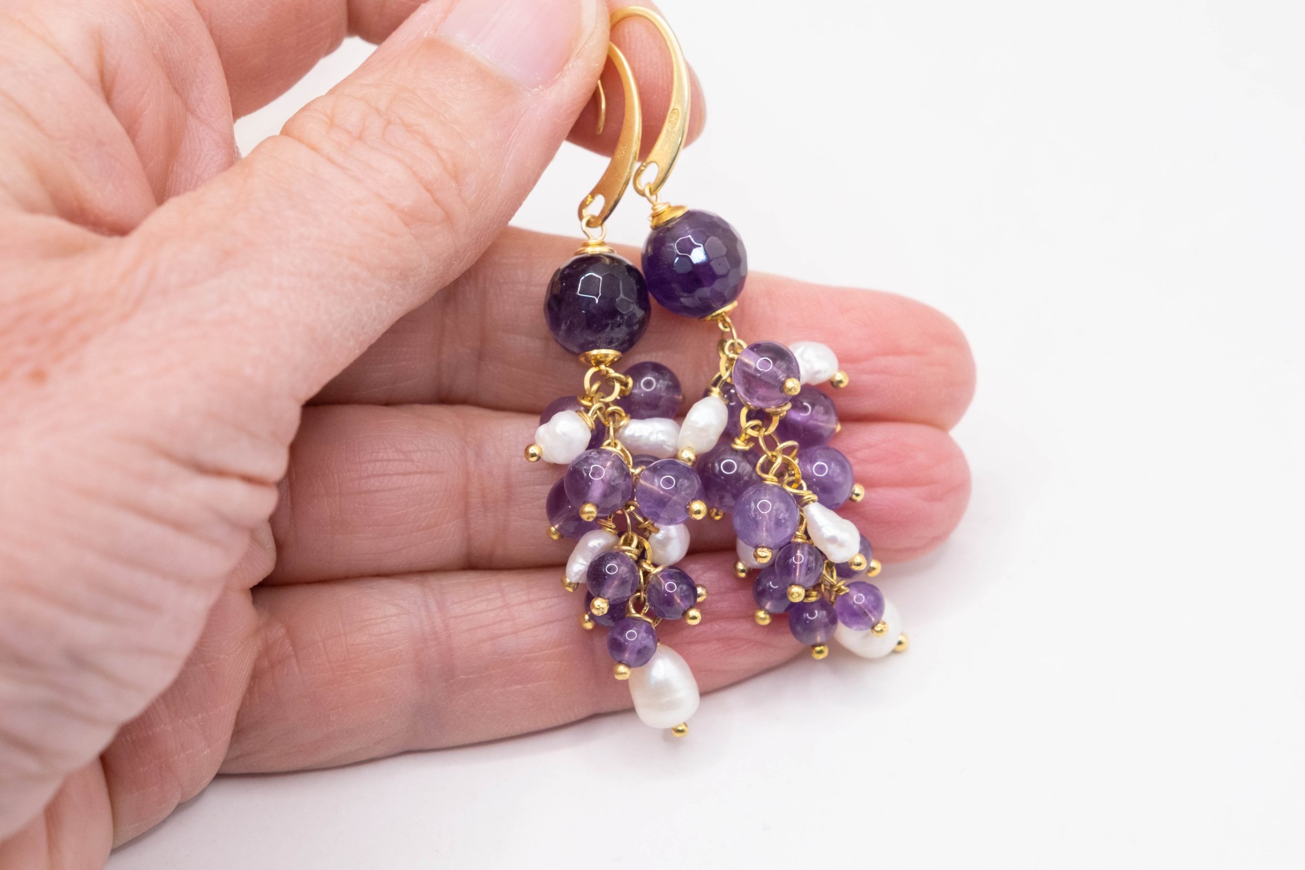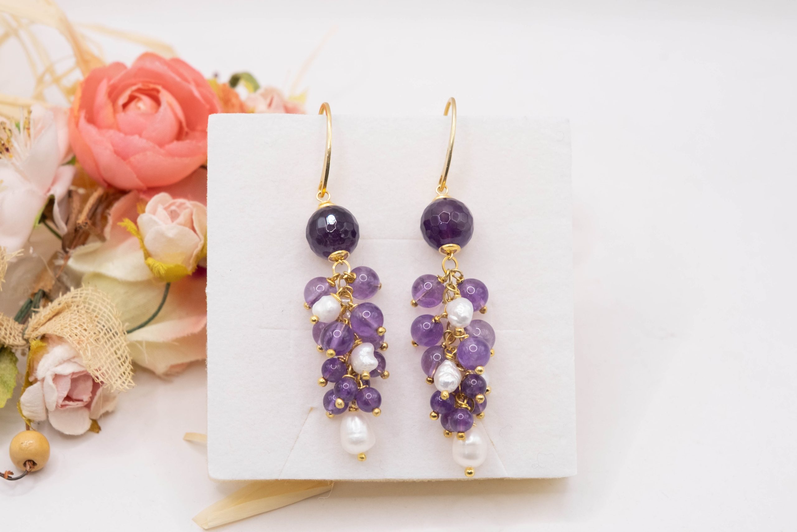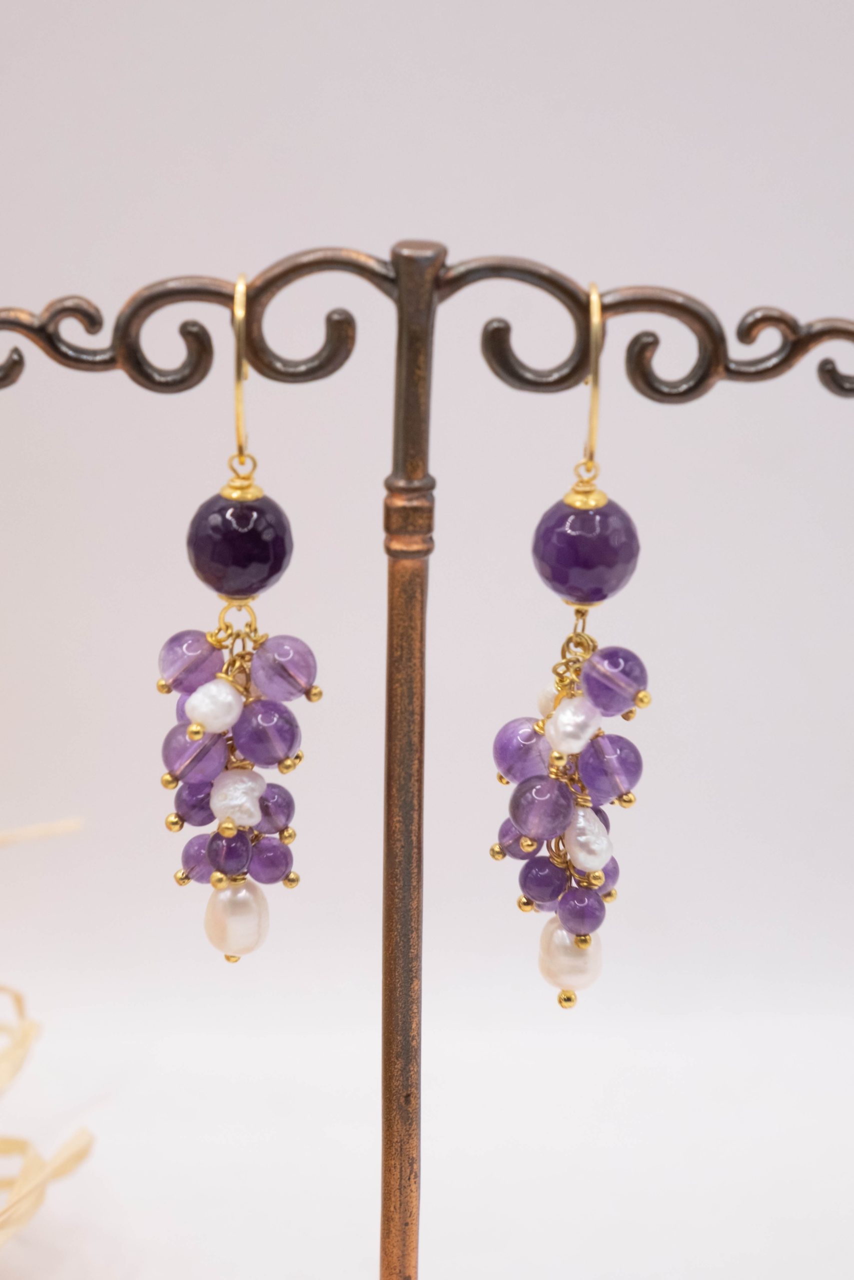 ✨ Amethyst Cluster Earrings, Natural Pearls, and Gold-Plated Silver ✨