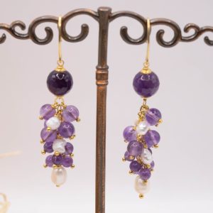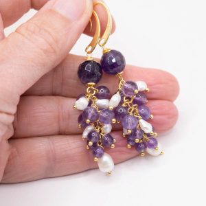 Cluster Earrings Amethyst Natural Pearls Silver Gold