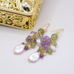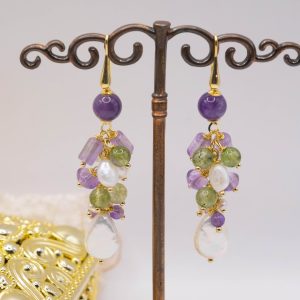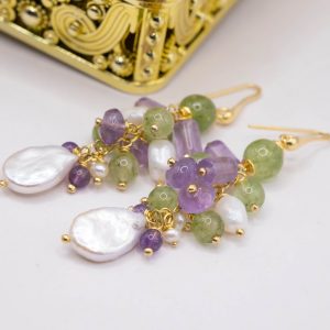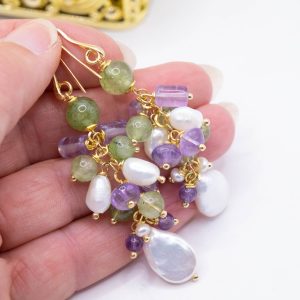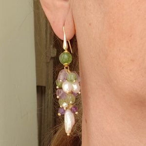 Cluster Earrings Jade Amethyst Pearls Silver Gold 2 Versions