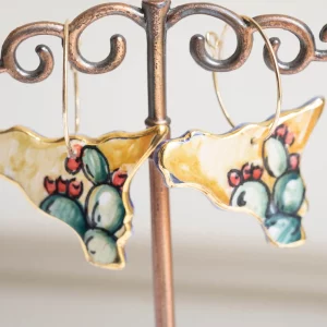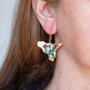 Dangle earrings with SICILY measuring 3.5 x 2.6 cm, made and painted by hand, in artistic ceramic from Caltagirone with 22kt gold leaf.
